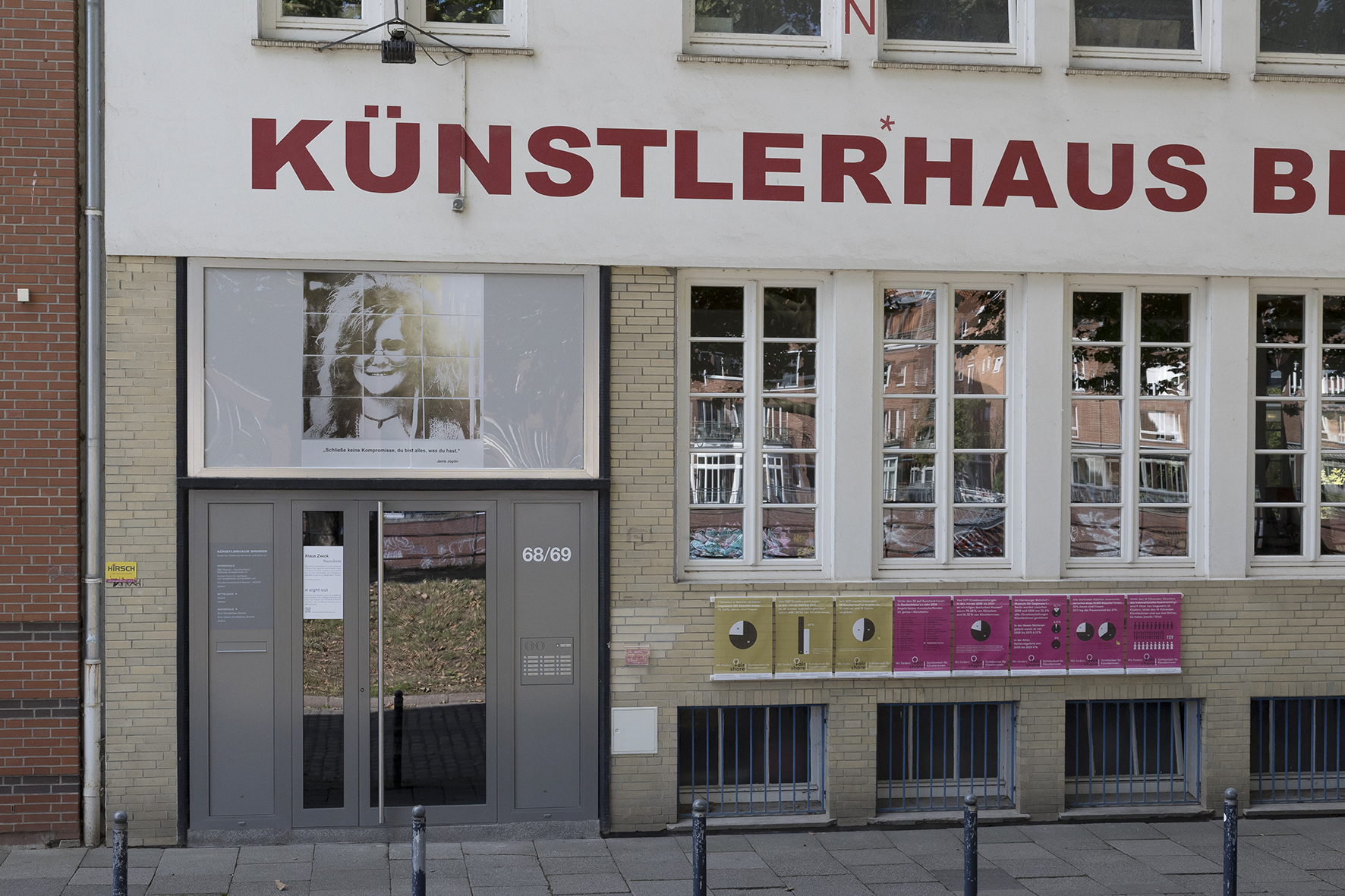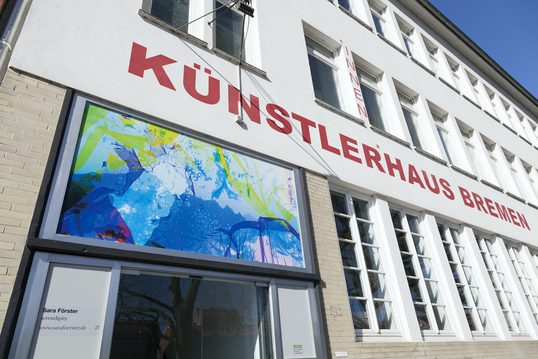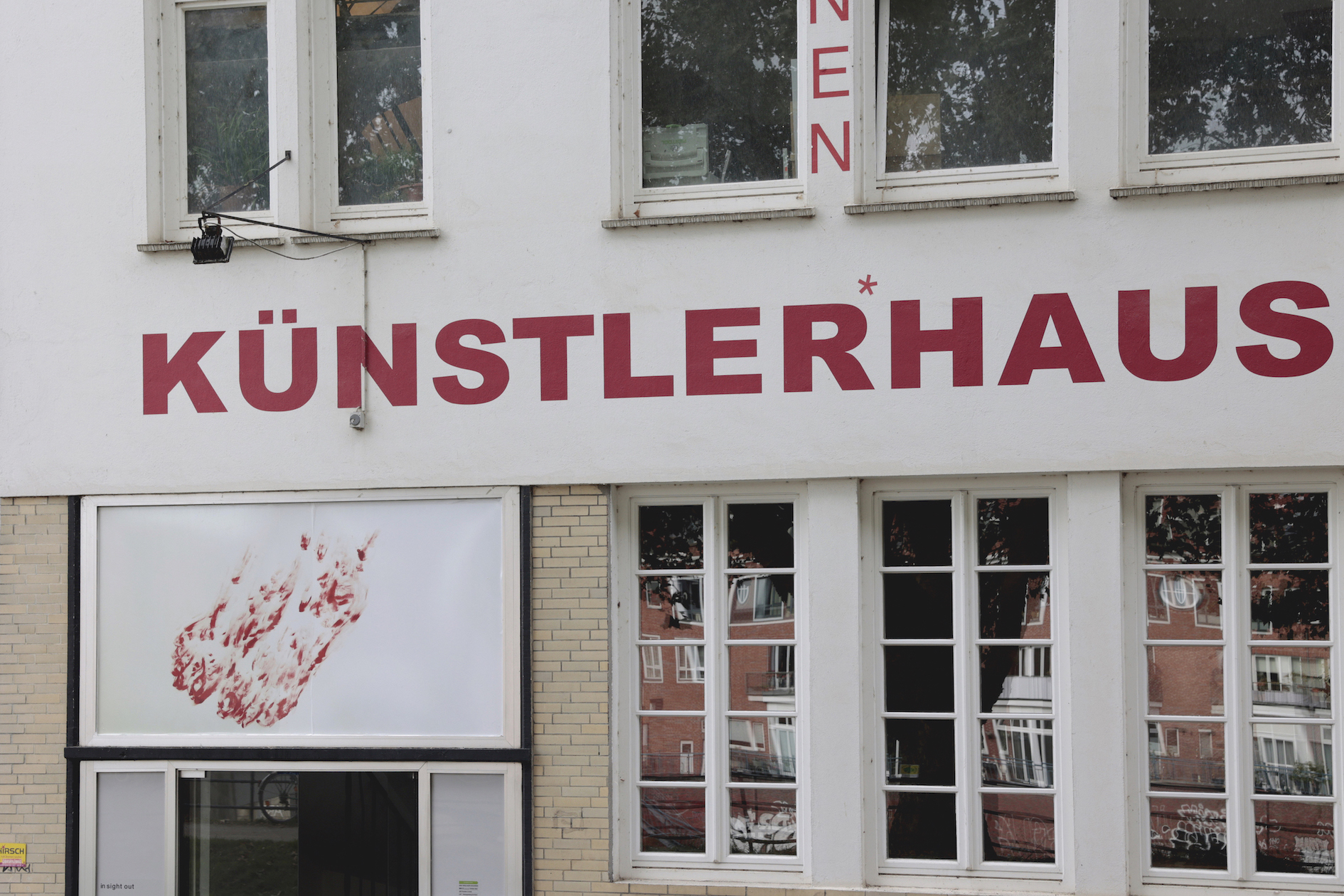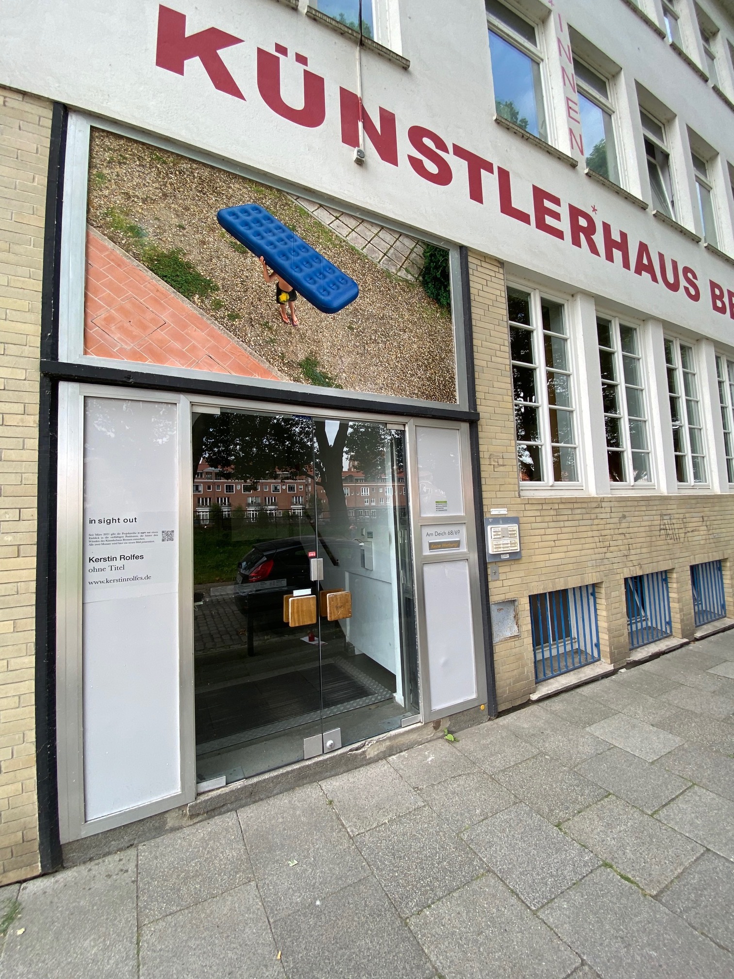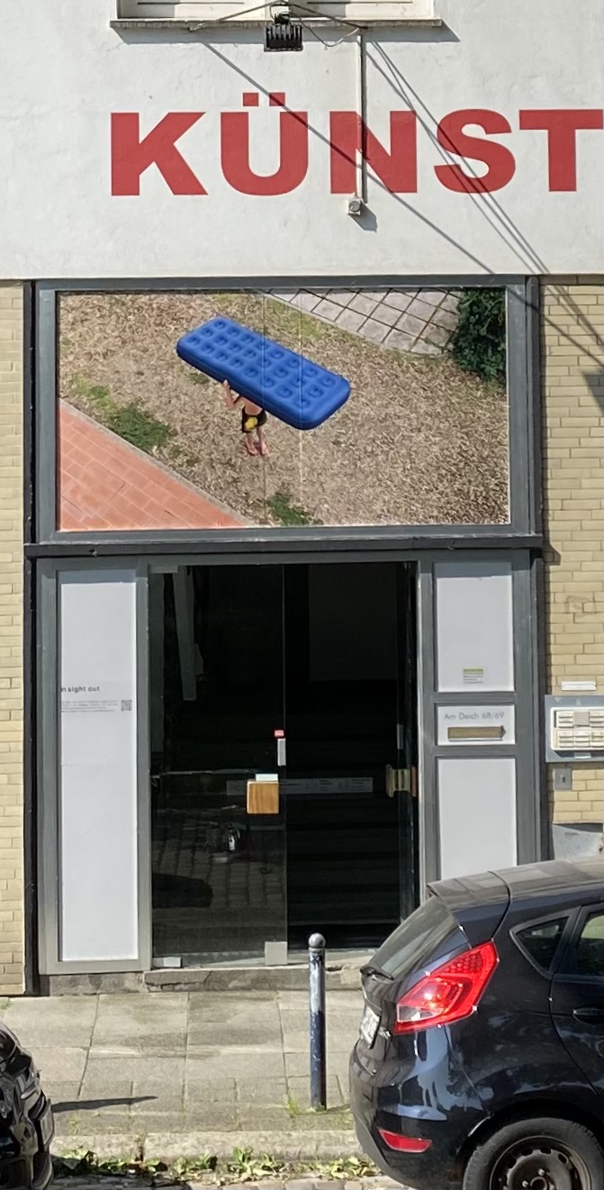 Auf einer Leerstelle der Fassade des Künstlerhaus Bremen – einem Fenster über der Eingangstür des Vorderhauses – präsentieren Künstler:innen der Ateliers und andere Mieter:innen der Werkstätten und Studios des Hauses seit März 2021 ihre Arbeit. Wie bei einem Blick durch ein Fenster wird hier das Schaffen im Haus nach außen hin sichtbar: Prozesshaftes bis Fertiges, Gezeichnetes und Fotografiertes, Skulpturales oder Fluides. Die Projektreihe in sight out gibt einen Einblick in die vielfältigen Positionen, die hinter den Wänden des Künstlerhaus Bremen entstehen.