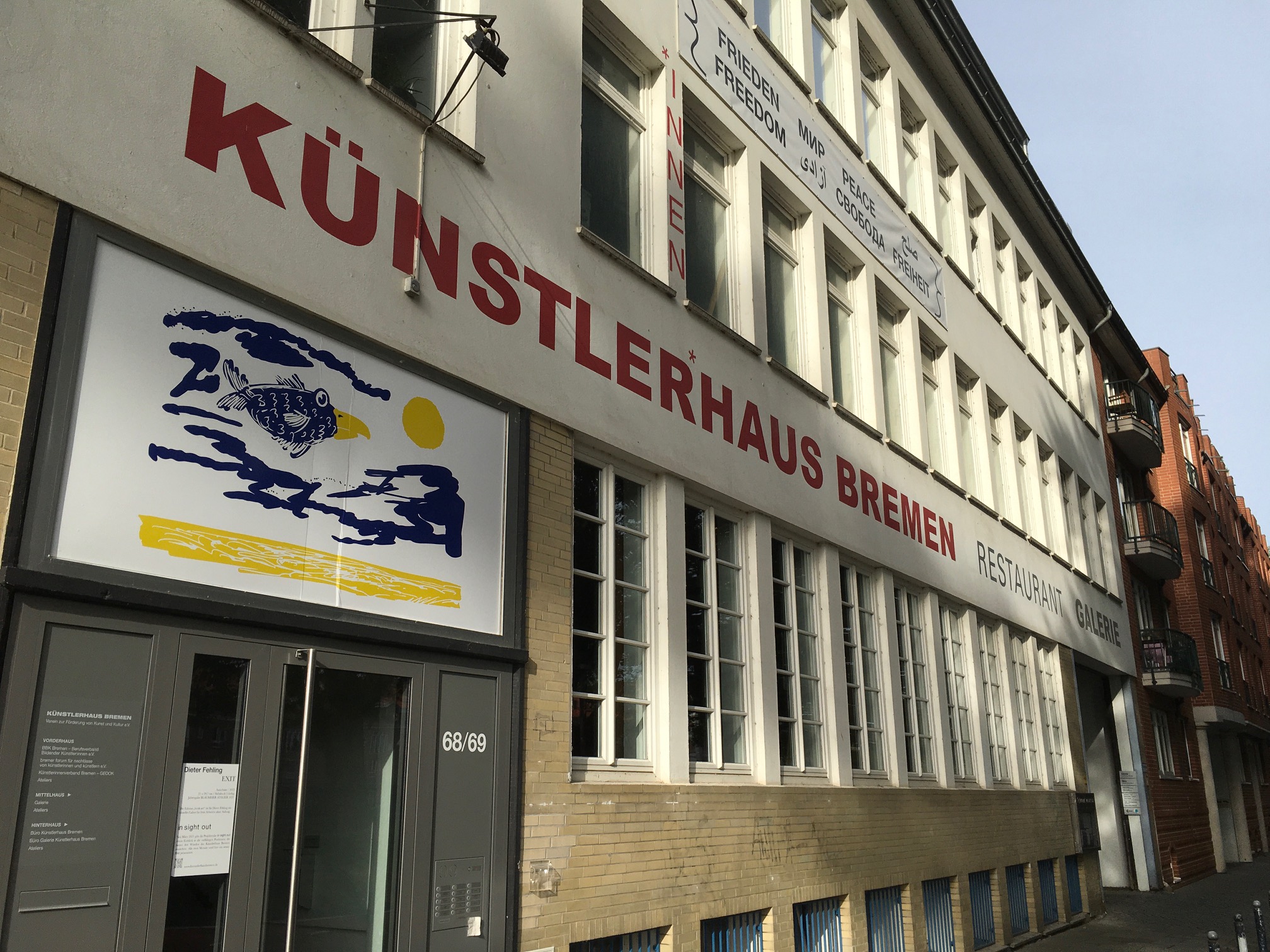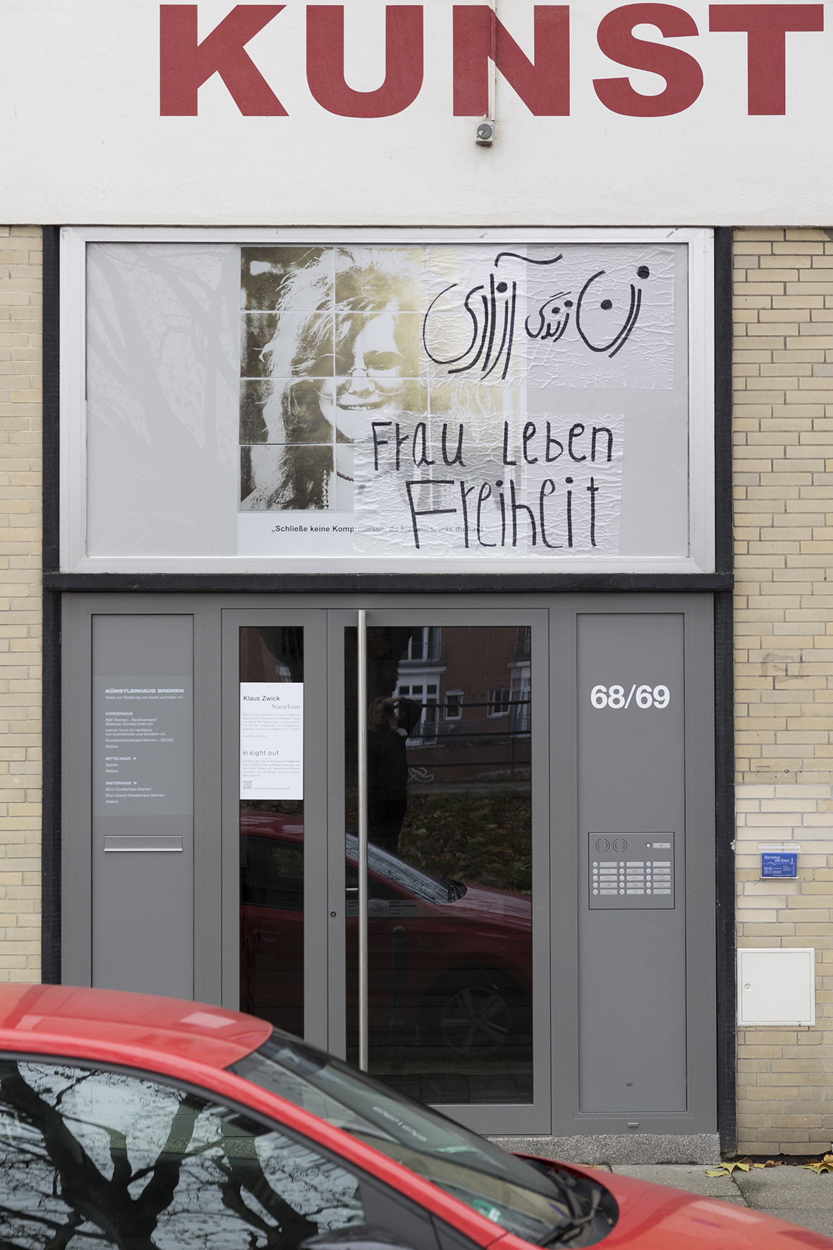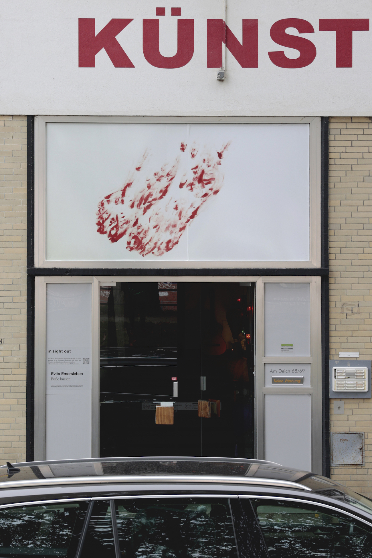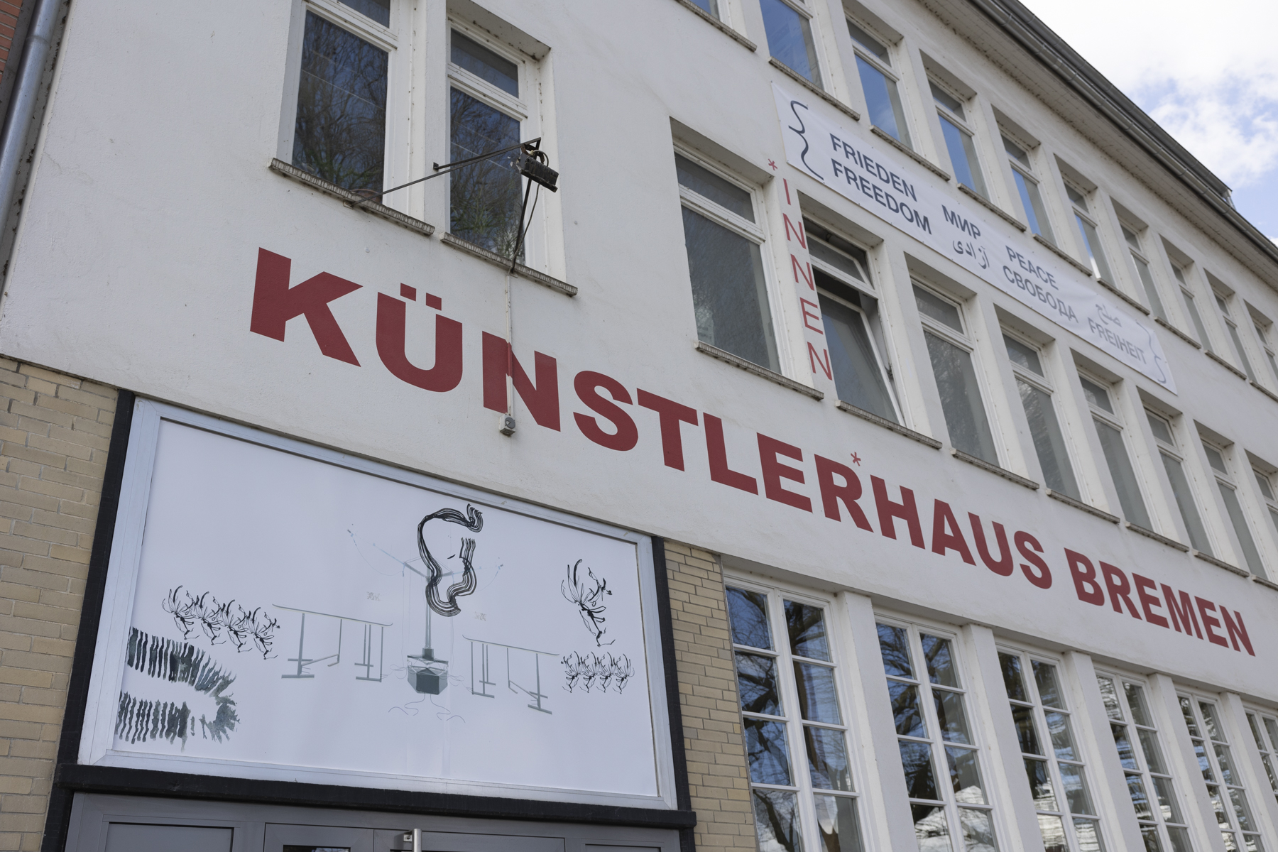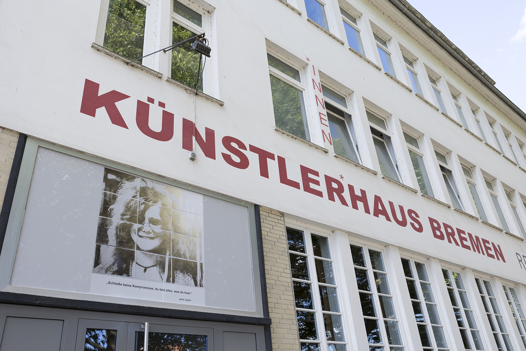 Auf einer Leerstelle der Fassade des Künstlerhaus Bremen – einem Fenster über der Eingangstür des Vorderhauses – präsentieren Künstler:innen der Ateliers und andere Mieter:innen der Werkstätten und Studios des Hauses seit März 2021 ihre Arbeit. Wie bei einem Blick durch ein Fenster wird hier das Schaffen im Haus nach außen hin sichtbar: Prozesshaftes bis Fertiges, Gezeichnetes und Fotografiertes, Skulpturales oder Fluides. Die Projektreihe in sight out gibt einen Einblick in die vielfältigen Positionen, die hinter den Wänden des Künstlerhaus Bremen entstehen.