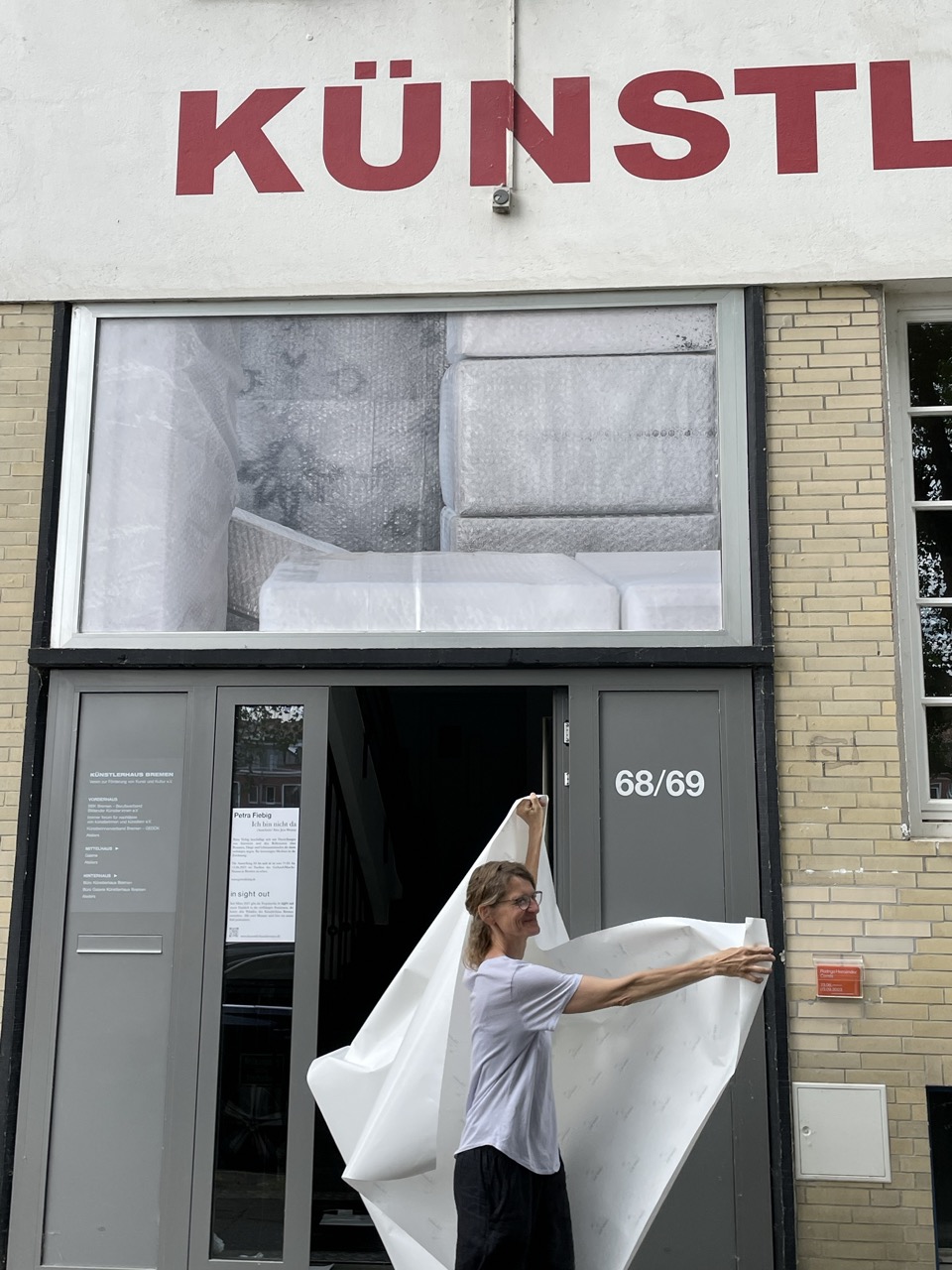 Im Rahmen der Projektreihe „in sight out“ an der Fassade des Künstlerhauses zeigt Petra Fiebig ihre Arbeit „Ich bin nicht da“. Fiebig beschäftigt sich mit Darstellungen von Interieurs und den Reflexionen über Personen, Dinge und Lebensumständen die darin verborgen liegen. Ihr bevorzugtes Medium ist die Zeichnung.