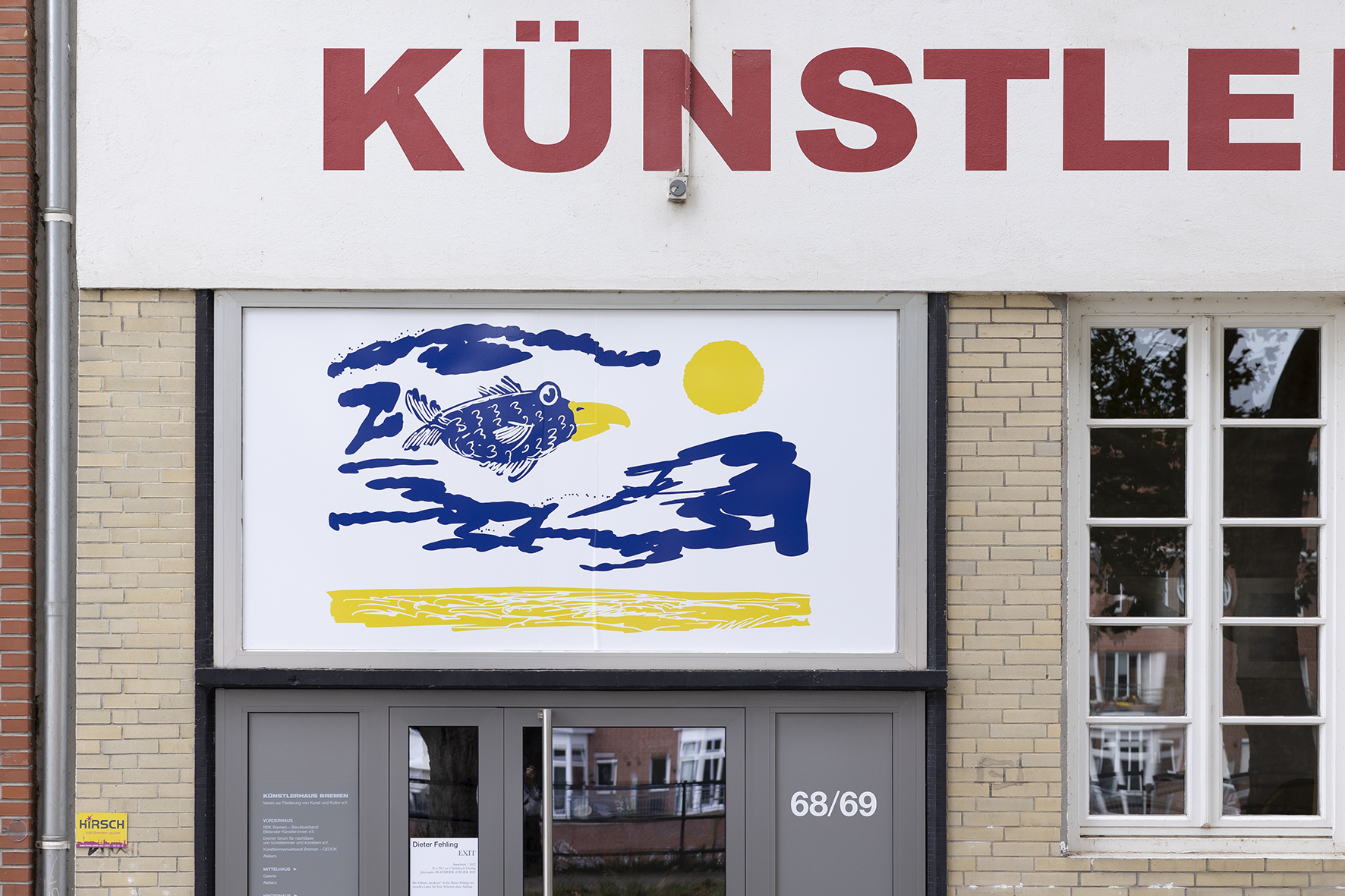 Im Rahmen der Projektreihe in sight out zeigt aktuell Dieter Fehling an der Fassade des Künstlerhauses seine Arbeit EXIT. Die Arbeit, eine Jahresgabe des Blaumeier-Ateliers, wurde als 2-farbige Siebdruckgrafik realisiert.