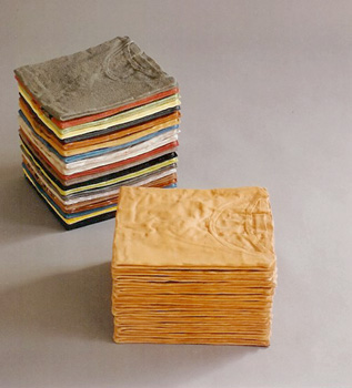 T-Shirts T-shirt-Stapel, 1996, Keramik, Fayence, farbiger Stapel aus 21 einzelnen Teilen; Stapel ohne Glasur 14teilig