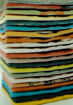 T-Shirts Ausschnitt, 1996, Keramik, Fayence, farbiger Stapel aus 21 einzelnen Teilen