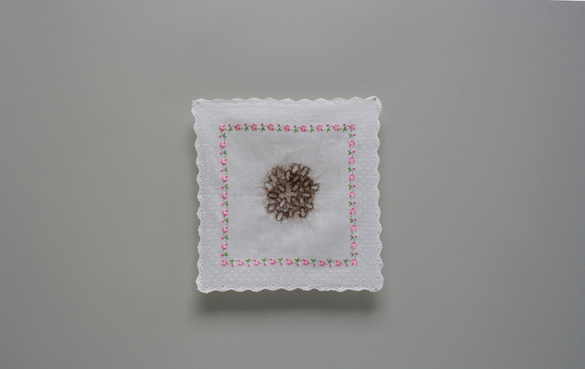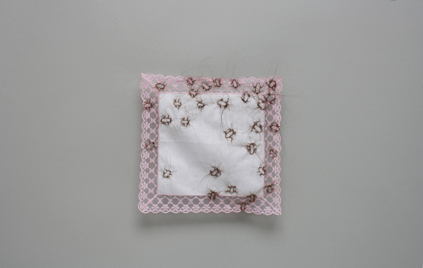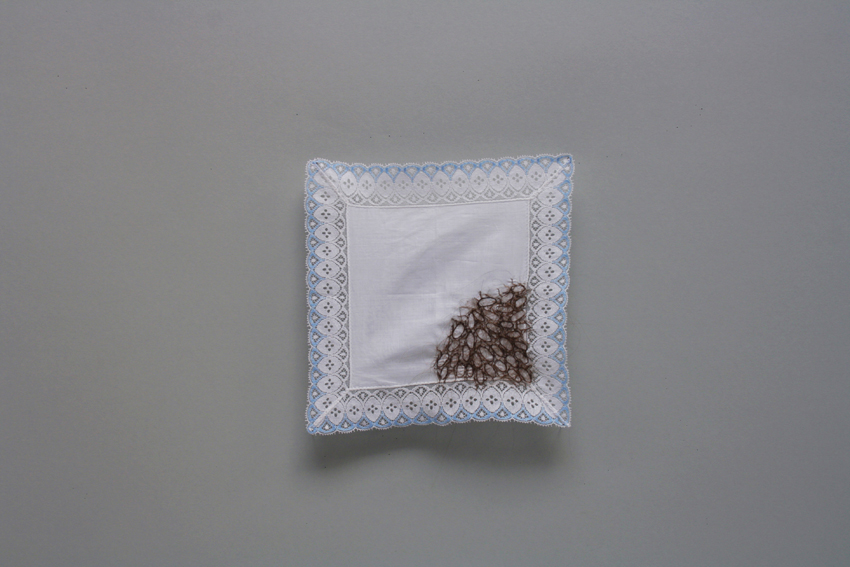 ohne Titel, 2015, Kopfhaar, Damen Stofftaschentuch, Stecknadeln , 28 x 29 cm
