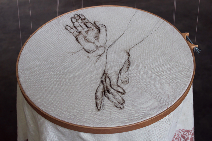 ohne Titel, 2015, Kopfhaar, weiße Tischdecke, Stickrahmen, Garn, 144 x 127 cm