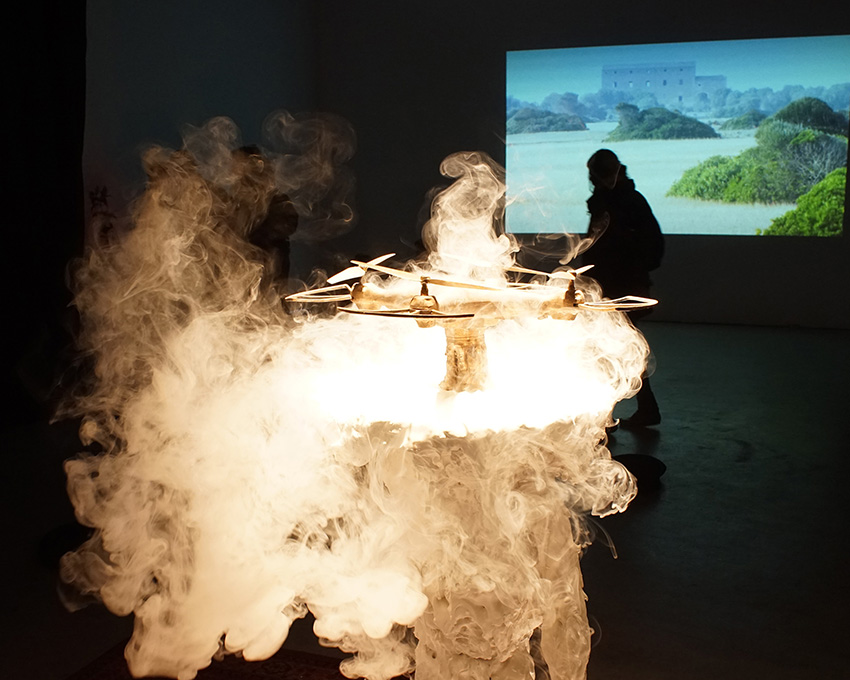 Rauminstallation (Bronzedrone, Gipsskulptur, Nebel)