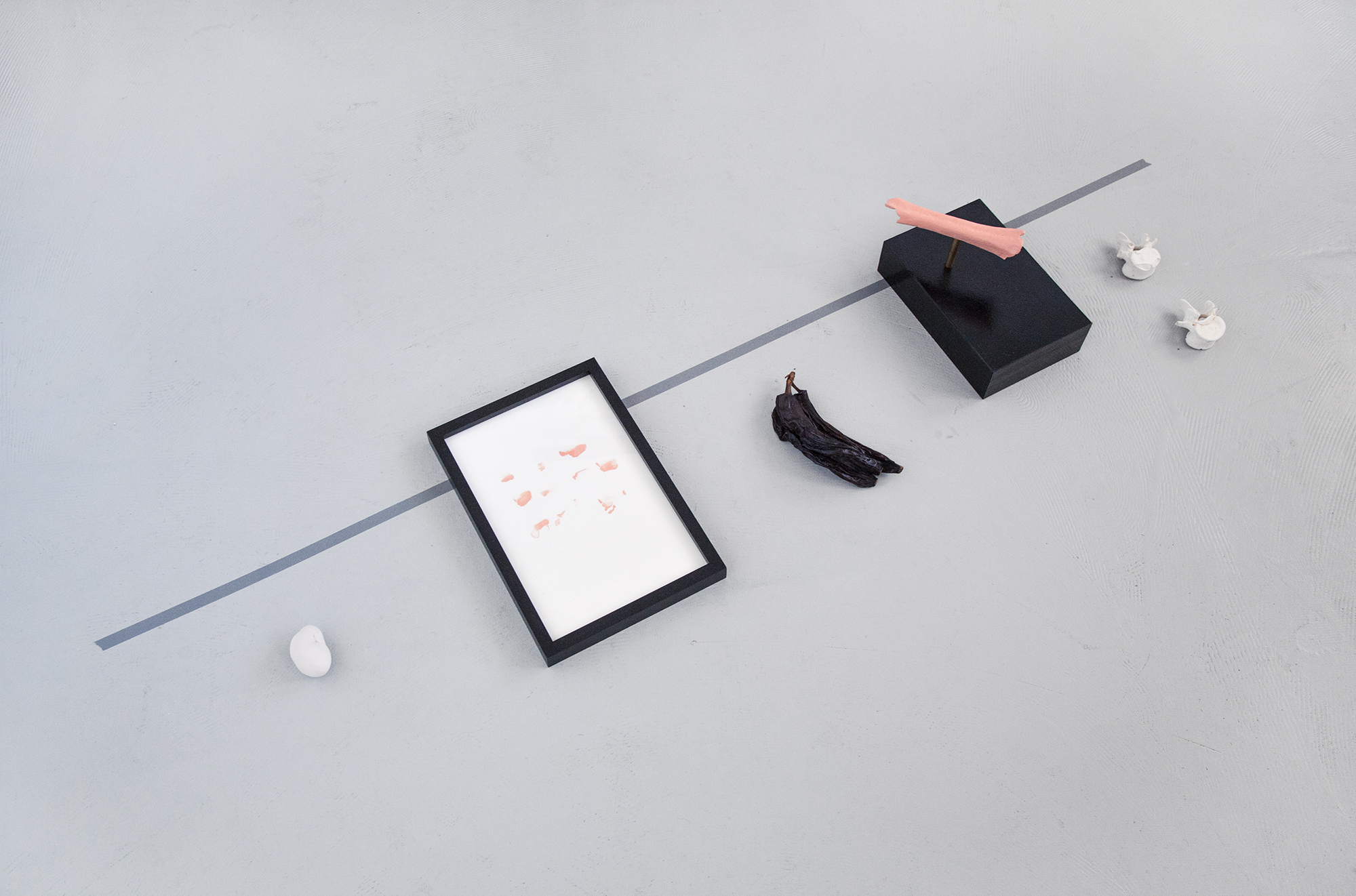 5 things on a line, 2019, Objekte: 1. gebrannter Ton, 2. Zeichnung, schwarzer Holzrahmen, 3. getrocknete Bananen, 4. Knochen, Acrylfarbe, Messingstange, MDF, schwarzer Lack, 5. Gips, Klebeband, ca. 150 x 40 cm