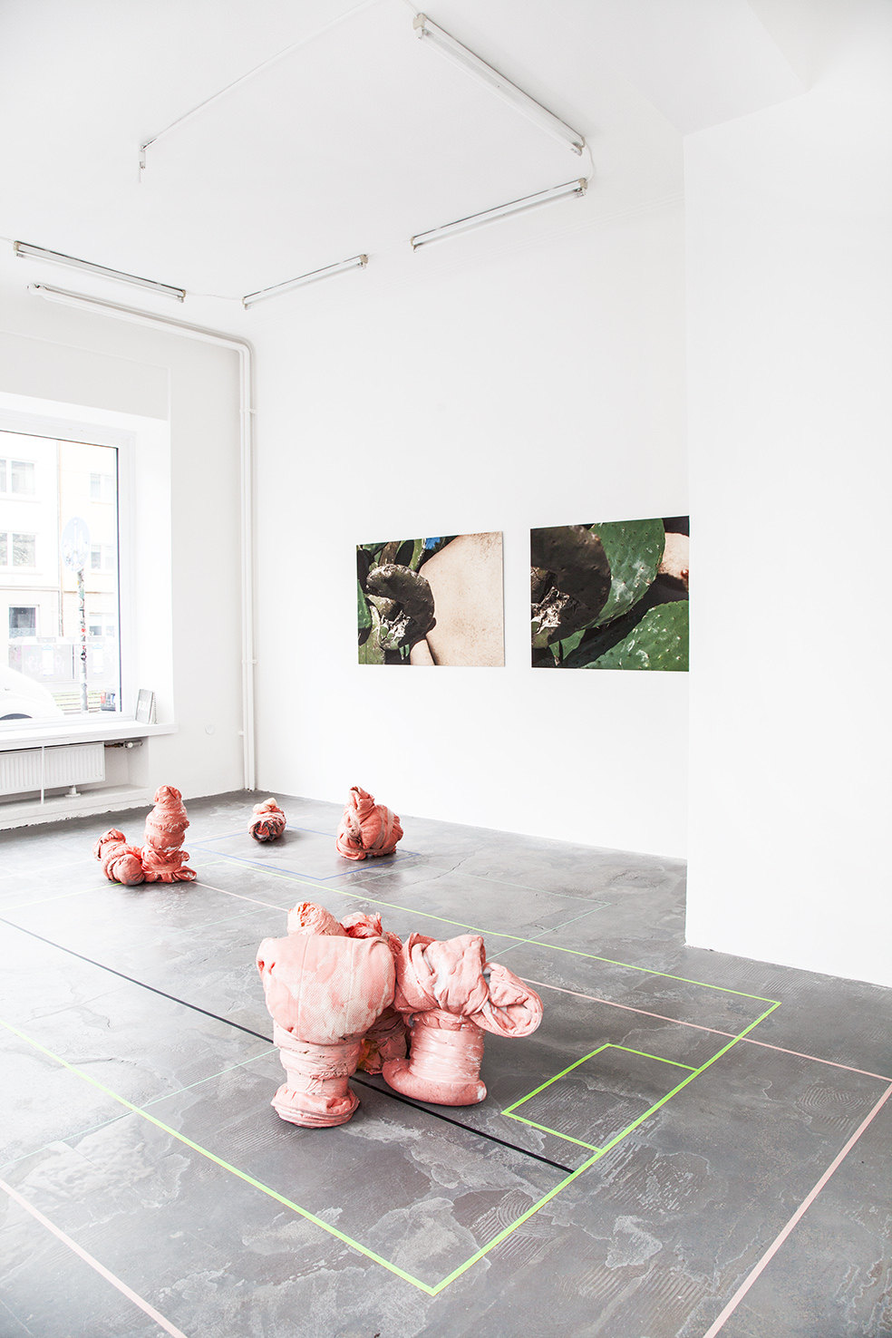 Sarah Lüdemann (Beauham) setzt in ihren Zeichnungen und Objekten auf materielle, haptische und formale Gegenüberstellungen. In den Zeichnungen fügen sich zu relativ schnell und grob gemalten rosa fleischfarbenen Acrylfarbsetzungen kleinteiligen, feine, langwierig zu zeichnende Tintenlinien. Beide Elemente erzeugen materielle wie figurative Assoziationen - an Fleisch und an Fell, an Körper- und an Pflanzenteile. Diese entstehen unter anderem durch die Zusammenfügung der so unterschiedlichen künstlerischen Mal- und Zeichnungsweisen, die eine merkwürdige Symbiose eingehen. Die besondere Hängung der sechs Zeichnungen verweist nicht nur auf deren serielle Zusammengehörigkeit, sondern führt zu einer choreographierten Bewegung der einzelnen dargestellten Körperobjekte. Eine ähnliche Bewegung der einzelnen dargestellten Körperobjekte. Eine ähnliche Bewegung durch Reihung zeigen auch die Bodenplastiken wobei hier der Gegensatz zwischen den weich wirkenden, ihre Bearbeitung zeigenden, grauen Tonobjekten und dem fest erscheinenden, mit Farbe dick bearbeiteten, rosafarbenen Plastikfolienwulst stärker bestehen bleibt als in den Zeichnungen. Dass die einen an Knochen und das andere an einen Fleischball denken lassen, kommt jedoch wieder durch das Zusammenspiel der Gegensätze. Mit ihrem Titel beschreibt Sarah Lüdemann (Beauham) zwei wesentliche Aspekte der künstlerischen Erarbeitung des Werks und dessen Rezeption. „Cadavre exquis“ ist ein bekanntes Spiel der Surrealisten in den 1920er Jahren, das wir heute abgewandelt vor allem mit Kindern spielen, wenn wir reihum gemeinsam Figuren zeichnen, deren Körperteile durch Umknicken für den nächsten Zeichner nicht sichtbar sind. Diese Strategie, um die künstlerische Kontrolle über den Inhalt des Werks auszuhebeln, ein malerisches Äquivalent zum automatischen Schreiben zu finden und dem Zufall einen Anteil an der Gestaltung zu überantworten, findet sich in der Arbeit von Sarah Lüdemann (Beauham) als Verfahren vor allem in den Tonobjekten, die sie Familienmitgliedern überlassen hat, die wiederum einigermaßen unkontrolliert ihre Fingerabdrücke ins Material gepresst haben. In den Zeichnungen gibt es eine Variation surrealistischer Vorgehensweisen, indem die Künstlerin hier auf eine eher spontane Setzung kontrolliert detailliert reagiert und figurative Assoziationen so herausarbeitet. Der exquisite Kadaver findet sich in den fleischfarbenen Teilen des Werks jedoch auch direkt visualisiert. Ähnlich als Beschreibung unserer Rezeption fungiert auch der haptische Genus - der haptische Fall, das haptische Geschlecht - im Untertitel, mit dem die Künstlerin verdeutlicht, wie zentral die haptische Ebene der Objekte ist, die sie als eine Art grammatikalische Bestimmung und damit als allgemein gültig definiert. Diese Haptik hat offensichtlich bei der Herstellung der Werke ebenso eine Rolle gespielt, wie sie der Ansatz der Betrachtung des Werkes ist, auch wenn sie visuell bleibt (und wir das Bedürfnis zügeln müssen, die Arbeit zu berühren).“