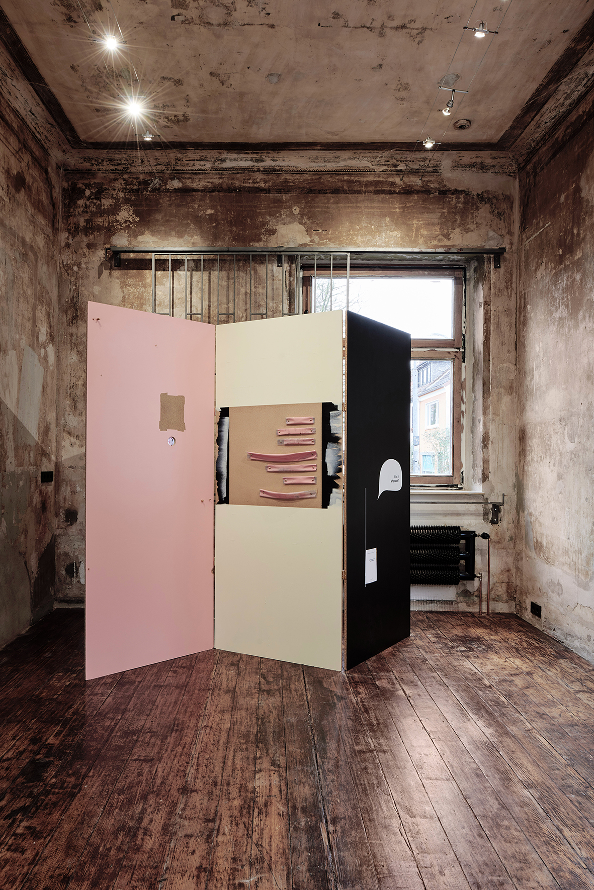 Mortadella statistics, 2020, Paravan mit Videoloop und Publikation (Sausage Operations - short manual), Pressspanholz, Messingschaniere und - schrauben, Plastikfolie, Acrylfarbe, ca. 220 x 300cm