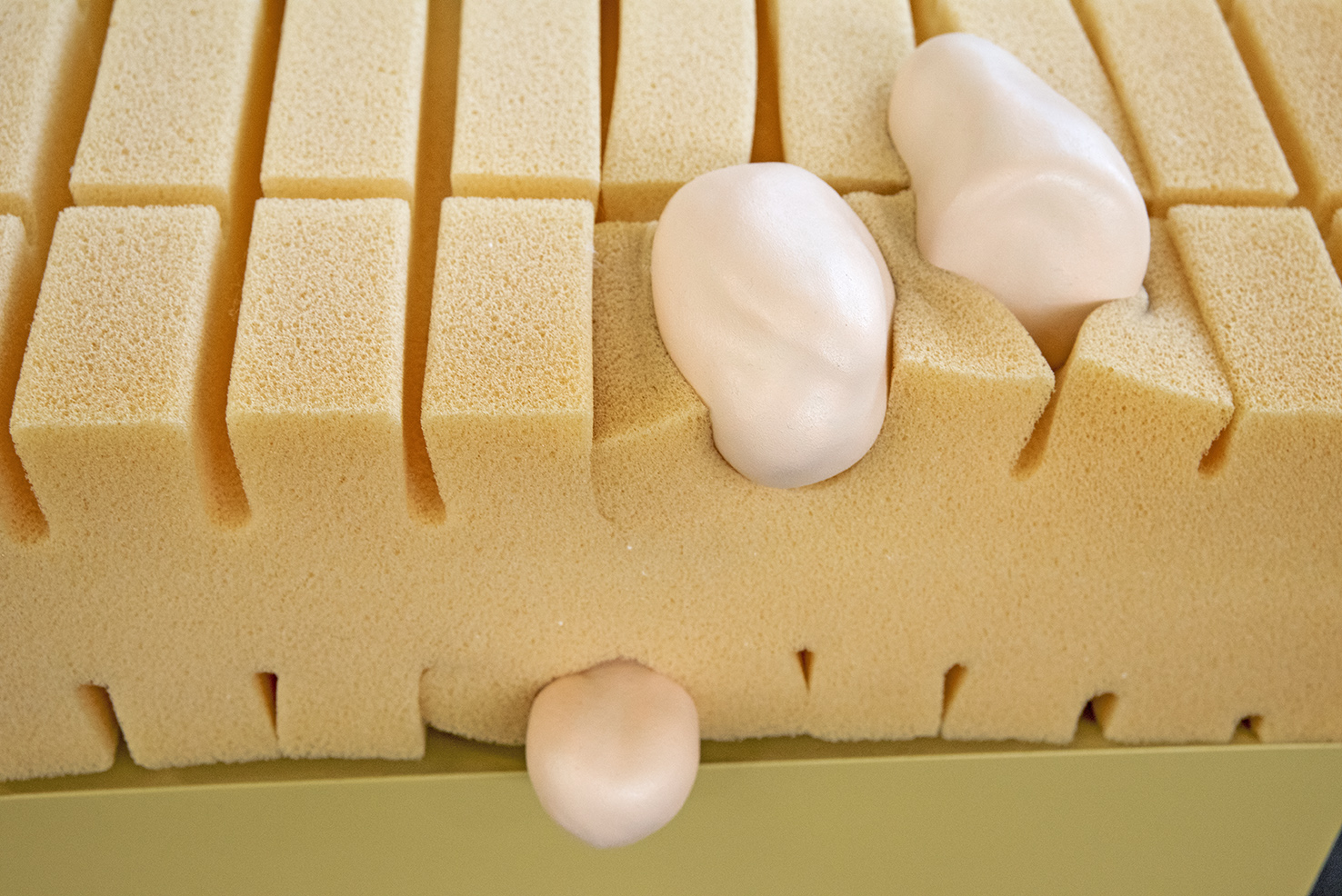 Resonator - Detail, 2020, gefundene Matratze, 7 großformatige Zeichnungen, 7 Skulpturen aus ungebranntem, lackiertem Ton, 120 x 200 x 90 cm