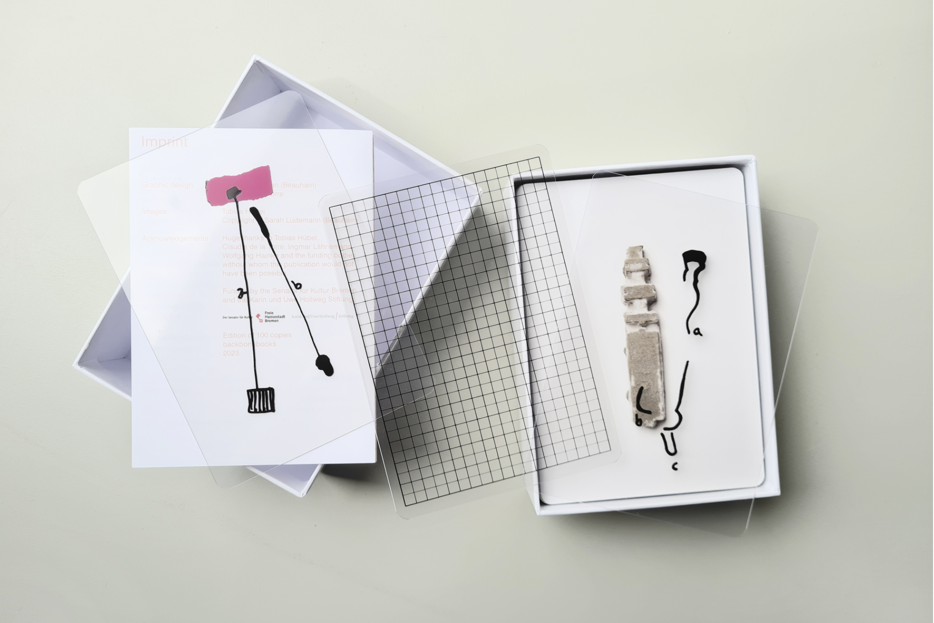 Objekte, Materialien und Werkzeuge. In ihrer nie vollständigen Gesamtheit ergeben diese “Bauteile” ein künstlerisches Werk, das als beauhamscher “Baukasten“ verstanden werden kann, als prozessualer, formaler und inhaltlicher Grundansatz innerhalb der künstlerischen Arbeit der Künstlerin. Die Publikation erscheint in Form eines „Spiels ohne Spielanleitung“ mit 98 farbigen Spielkarten, drei transparenten Siebdruckkarten und einem Leporello Index. Die Karten bieten Möglichkeiten des In-Beziehung-setzens, der Verbindung, Assoziation oder Forschung. Inhalte können durch die Objekte auf den Spielkarten alleine oder in Verbindung mit den graphischen Elementen der Transparente oder den Textfragmenten des Booklets generiert werden. Eine gesetzte Spielanleitung gibt es nicht, sondern kann selbst erdacht und immer wieder neu entworfen werden."