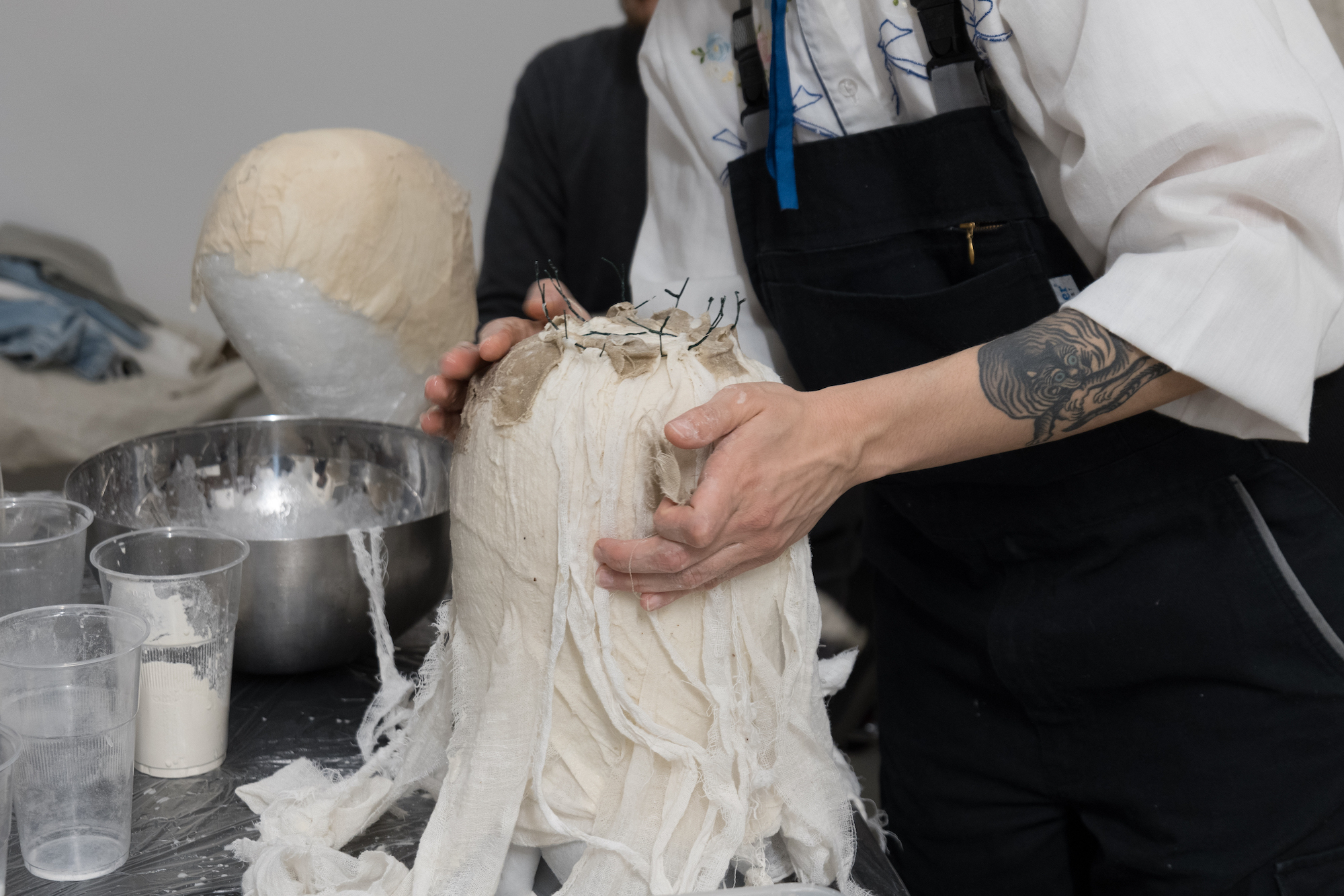 Aufbauend auf einem zuvor gemeinsam generierten Archiv aus KI-generierten Bildern und analogen Collagen stellen die Teilnehmenden Textilmasken aus Stoff-Maché her.