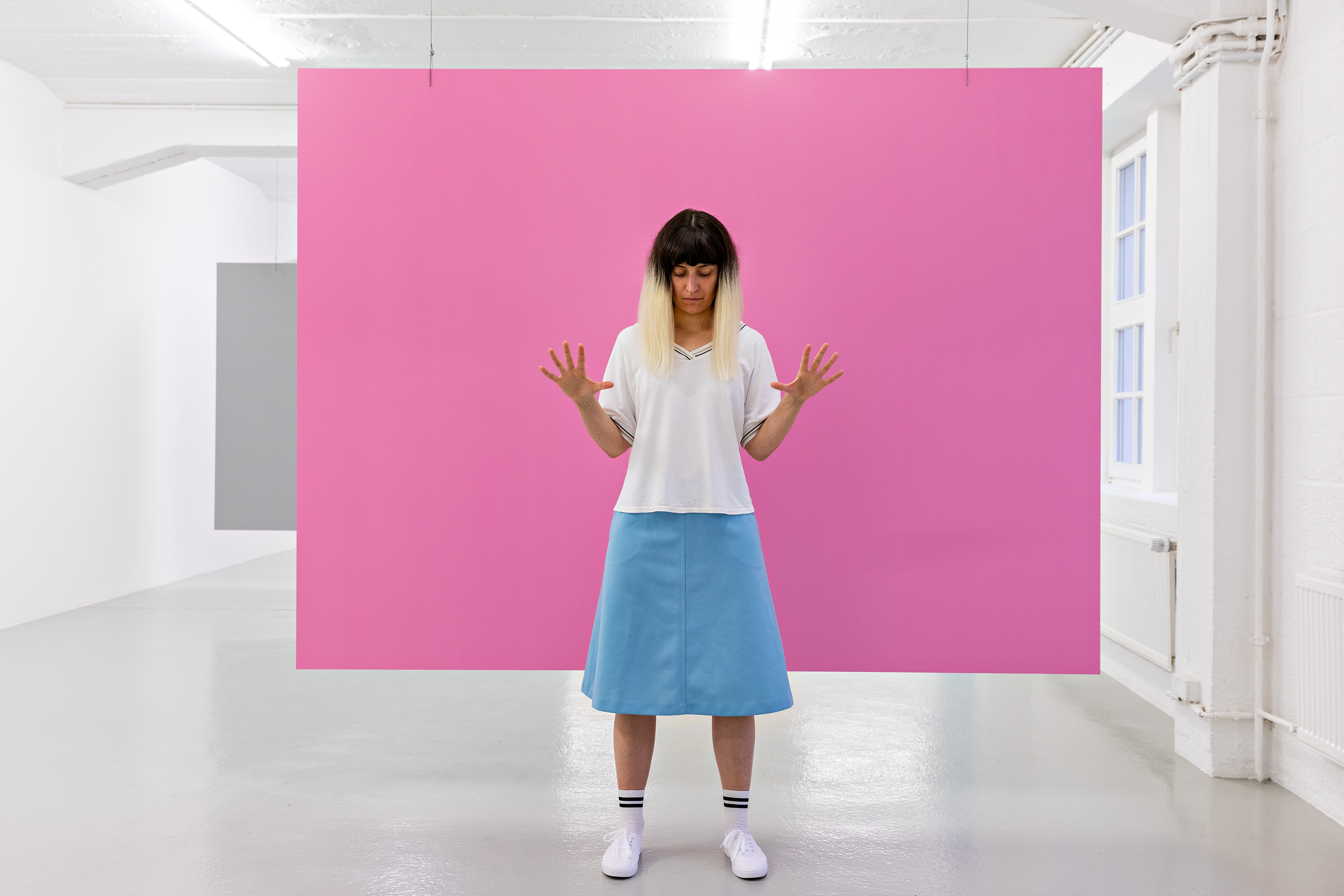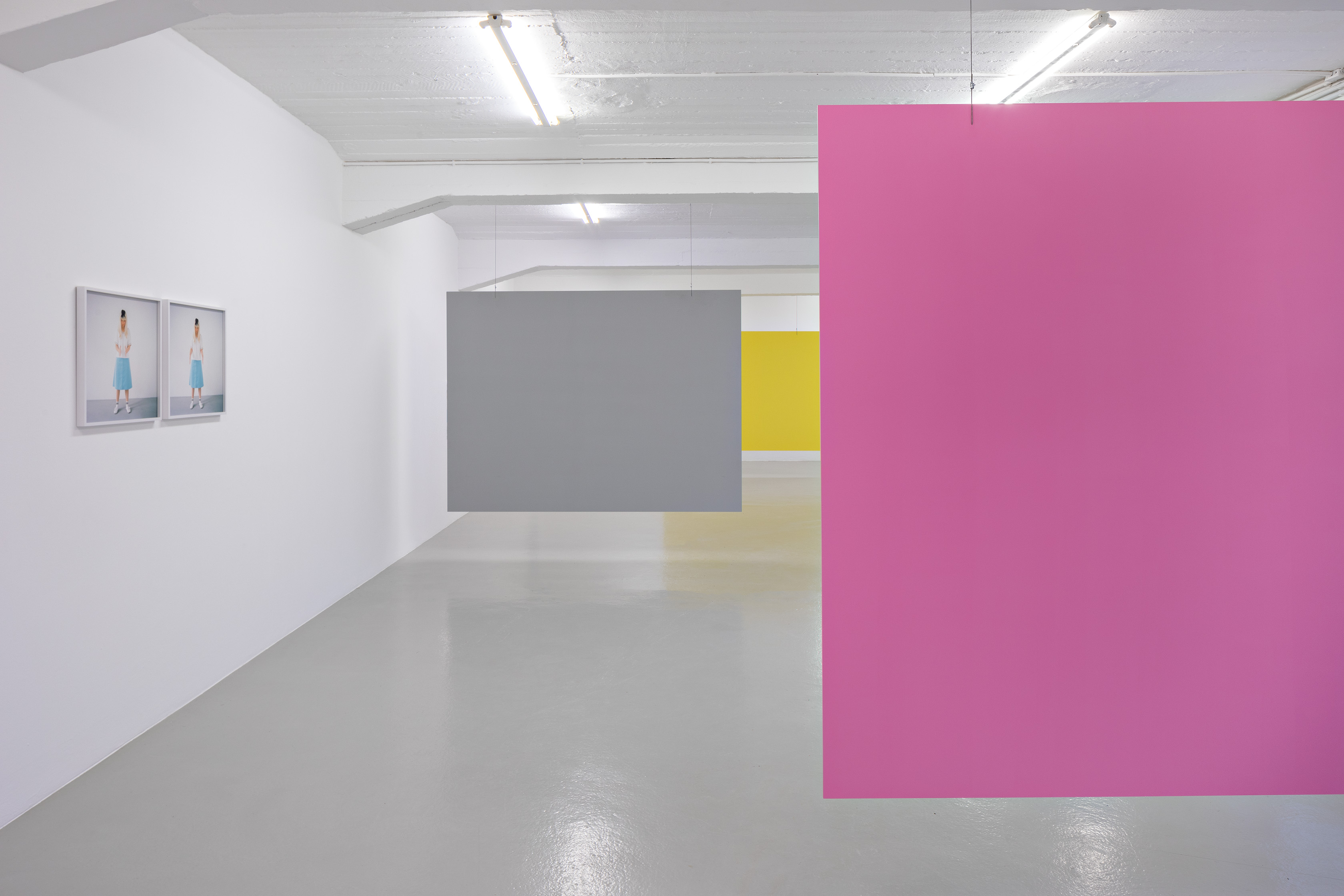 Unter dem Titel Methods for the Study of What Is Not There präsentiert Irina Gheorghe (* 1981 in Târgoviște, RO, lebt in Berlin) eine Performance und eine Installation aus Fotografien, farbigen Paneelen, einer Soundarbeit und Klebebandzeichnungen. Die formal strengen, aus rechteckigen Farbflächen zusammengesetzten Zeichnungen sind Studien zu der Performance Preliminary Remarks for the Study of What Is Not There, die Gheorghe zur Ausstellungseröffnung aufführt. Sie stellen Partituren dar für Choreografien, in denen Gheorghe mittels Sprache und Gesten eine imaginäre Landkarte von nicht-greifbaren Präsenzen im Raum entfaltet. Hinter farblich codierten Arrangements verbergen sich verschiedene Kategorisierungen nicht-wahrnehmbarer Entitäten, die sich zu einer Kartografie zusammenfügen. Elemente früherer Partituren überlagern sich in der Installation und erzeugen eine eigenwillige Zeitlichkeit, die die Gegenwart verzerrt. Fotografien zeigen die Künstlerin bei der Ausführung von Gesten, die sie in ihrer Performance anwendet. Der fragmentarische Charakter der Serien lassen ein unentzifferbares Gestenvokabular aufscheinen. Ähnlich wie der Text in der Performance und Audioarbeit erzeugen sie eine Atmosphäre von Absurdität und Entfremdung, in der das angewandte Zeichensystem als arbiträres System entlarvt wird. In der Performance verbindet Gheorghe mittels Körpersprache und Stimme den vorhandenen Raum mit einer anderen Dimension unsichtbarer Existenzen. Sie oszilliert zwischen Skript und Improvisation und bezieht sowohl die räumliche Situation als auch das Publikum mit ein.