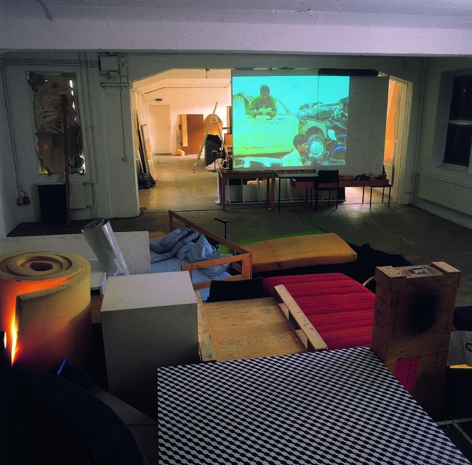 „Im vorderen Teil des Galerieraums standen / lagen außer Brettern, Möbeln und Relikten aus Bremer Kunstinstitutionen verschiedenes Werkzeug und eine Leiter. Dieser unfertige Charakter suggerierte die Möglichkeit, als Besucher verändernd einzugreifen. Der skulpturale Aufbau im hinteren Teil des Galerieraums liess sich als Tribüne zur Betrachtung des Films benutzen. Filmloop mit Sequenzen aus One plus one, Finger weg vom Freistaat, Auf der Kippe, Die Ferien des Monsieur Hulot, The Wild Bunch, Sprengfilme, Jet Pilot, Oskar Langenfeld, Die Fahne, Strategie der Schnecke, Studio 77 Out of Present, Ein großer graublauer Vogel, Bewegliche Ziele u.a. …..“ Dorothee Richter