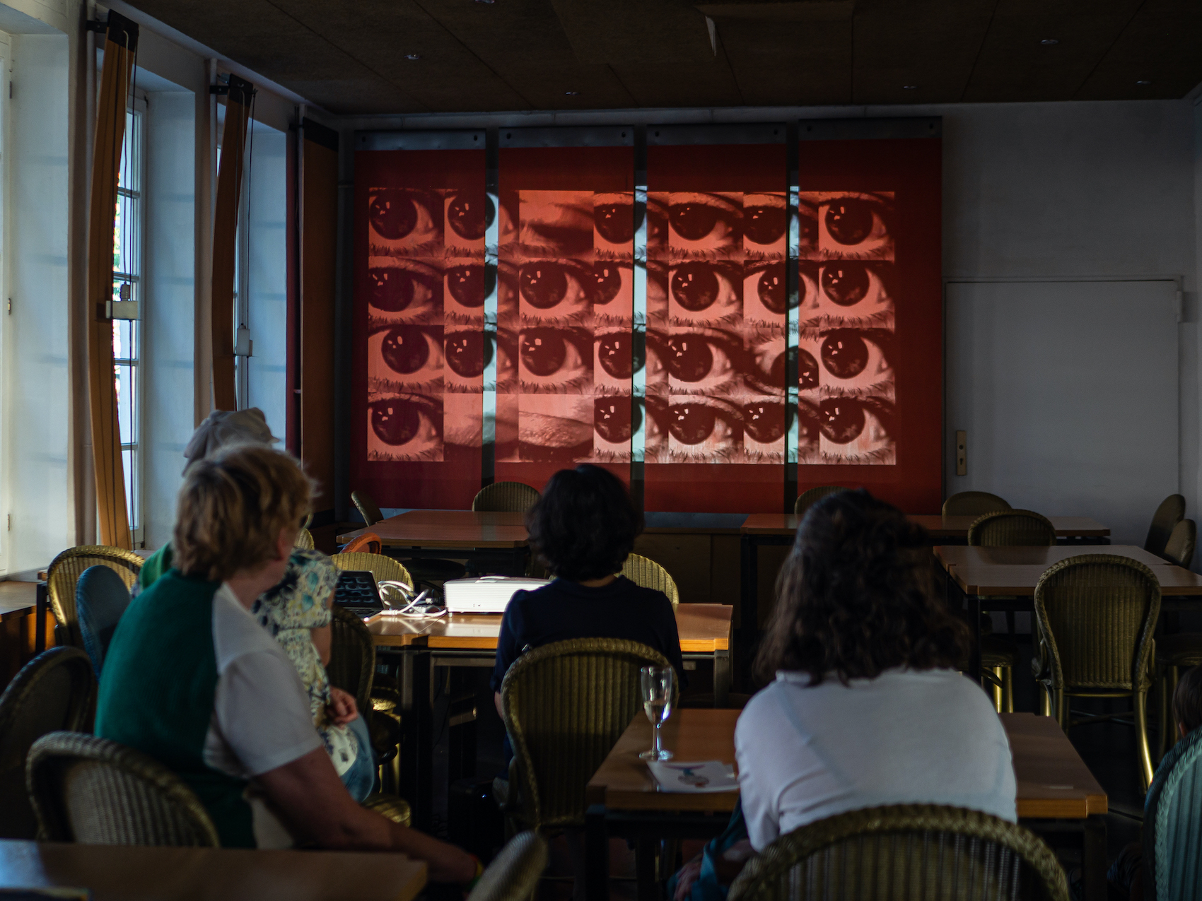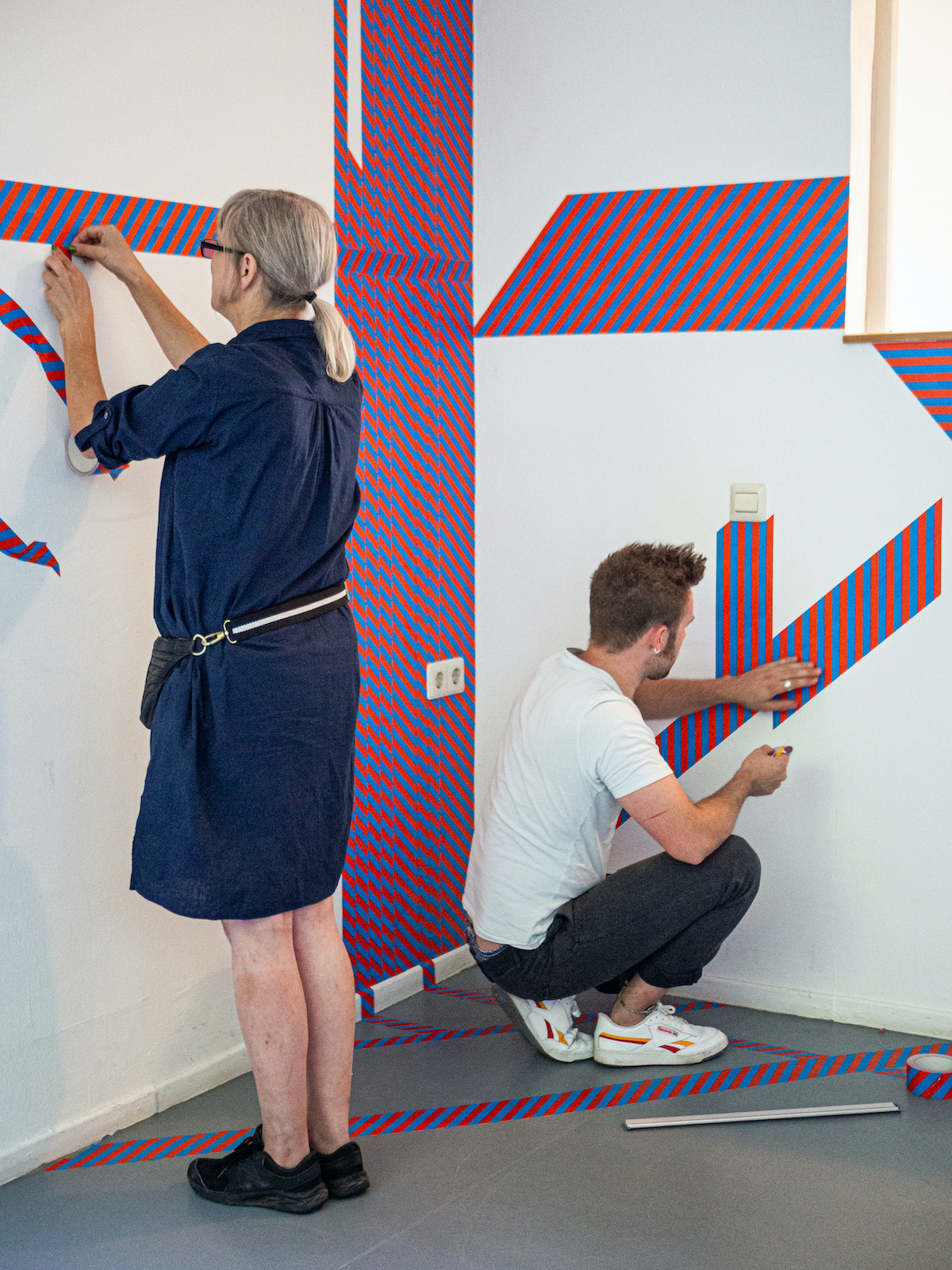 Hassan Sheidaei, Künstler und Mitglied im Künstlerhaus Bremen, zeigte im Restaurant am Deich im Kontext der Performance ZufallsDIALOGE: Freundschaft, Macht, Tod, die er zusammen mit Beata Frenzel konzipiert hat, eine Videoarbeit und lud zu Begegnungen im Restaurant und Gesprächen über sehr persönliche Antworten auf große Lebensfragen ein. Bei der Aktion TAPE IT! gestalteten Besucher:innen gemeinsam mit der Künstlerin und ehemaligen Mitglieds im Künstlerhaus Bremen, Barbara Rosengarth das Gastatelier zu einer Installation mit bedrucktem Tape um.
