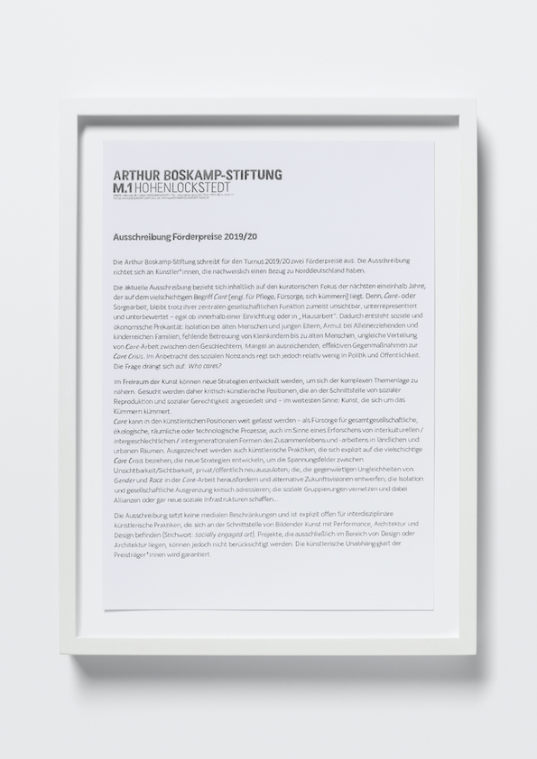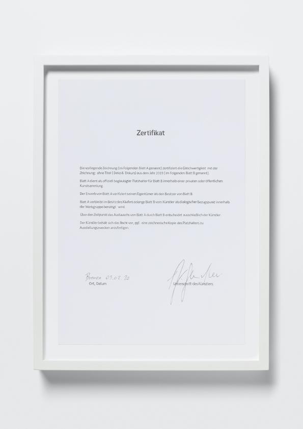 In einem zweistufigen Verfahren wurde er unter anderem für seine Zeichnungen aus der Serie Deko und Diskurs als Preisträger ausgewählt. Diese besteht aus sechs Zeichnungen, von denen fünf in der Ausstellung in der Städtischen Galerie Bremen gezeigt werden. Die übrige Zeichnung befindet sich in einer privaten Kunstsammlung und wird stellvertretend durch eine der anderen Zeichnungen repräsentiert. Ausgangspunkt der Serie ist eine Ausschreibung der Arthur Boskamp-Stiftung, in der nach „{…} Positionen {gesucht wird}, die an der Schnittstelle von sozialer Reproduktion und sozialer Gerechtigkeit angesiedelt sind.“