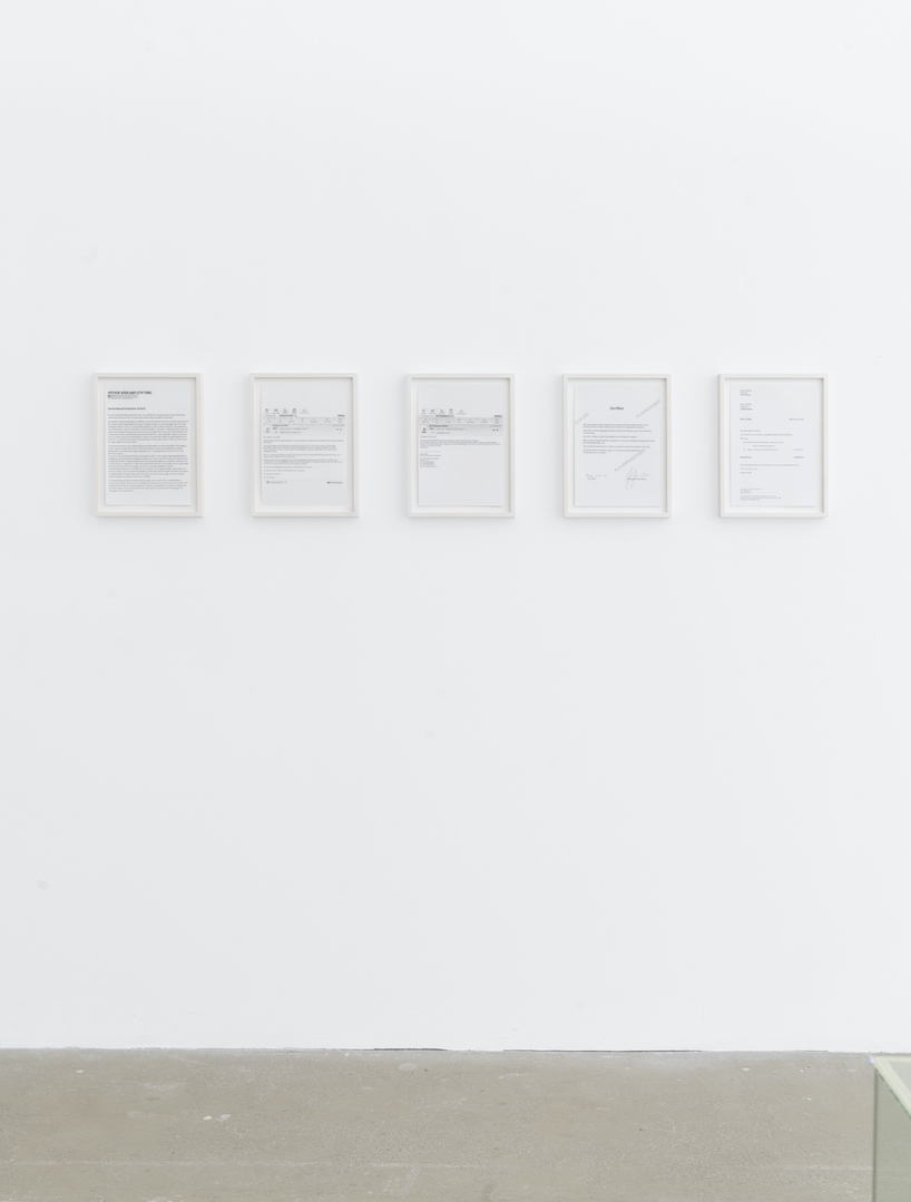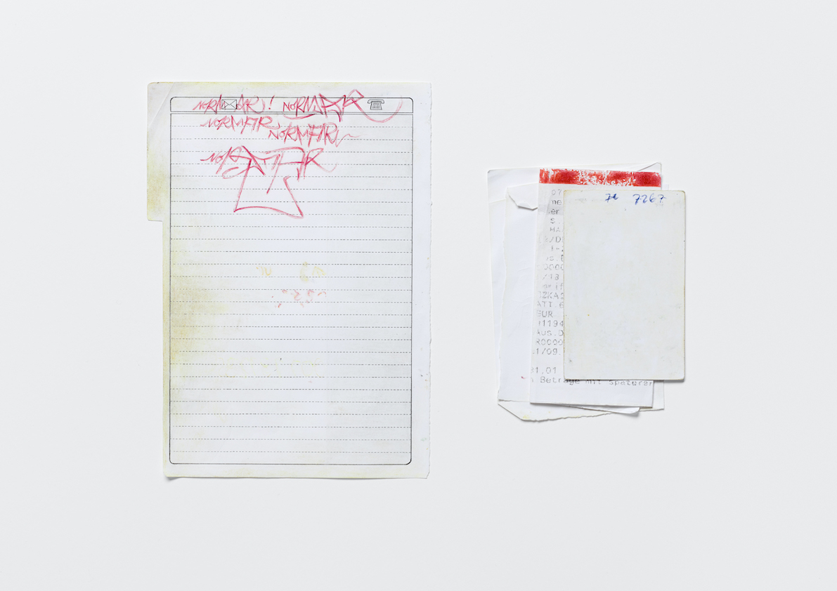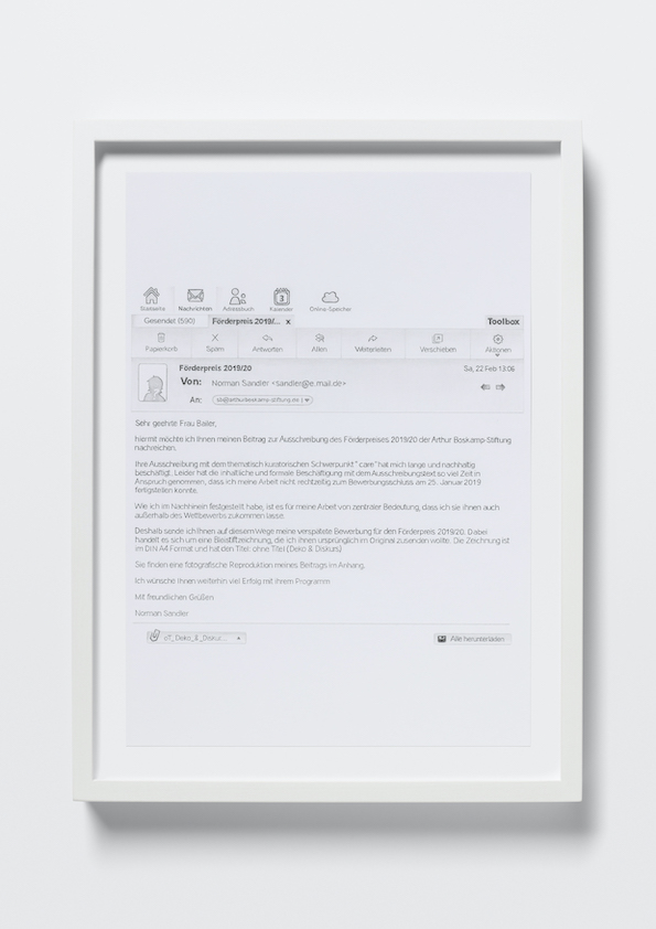 „Dass Norman Sandler ein virtuoser Zeichner ist, erschließt sich erst auf den zweiten Blick – zunächst erscheinen die gerahmten Schriftstücke seiner sechsteiligen Arbeit „Deko und Diskurs“ wie Ausdrucke einer PDF, Screenshots von E-Mail-Korrespondenzen und eine Rechnungskopie, deren Druckbild einen baldigen Kartuschenwechsel empfiehlt. In der Installation „Ohne Titel“ mutet ein Portemonnaie-Sammelsurium – Kontoauszüge, Quittungen, verfärbte Zettel – an, als sei es nachlässig in einer Ausstellungsvitrine vergessen worden.