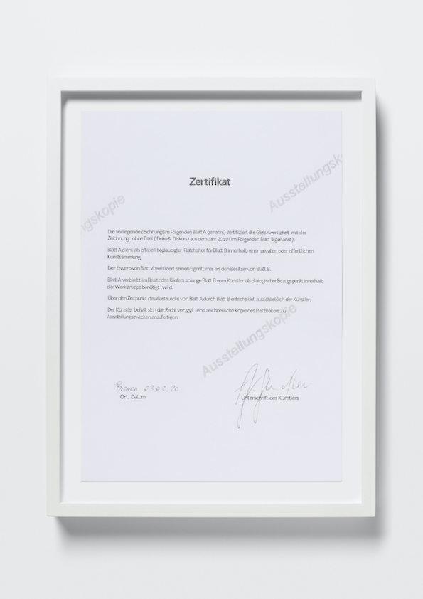 „Durch die zeichnerische Adaption des Textes wird dieser selbst zum Thema der Arbeit. Er wird zum Bild und damit Grundlage und Ausgangspunkt für eine bildnerische Spekulation über Wert und Rolle der Kunst zwischen Autonomie, Produkt und Forderungen nach gesellschaftlicher Relevanz.“ (Norman Sandler)