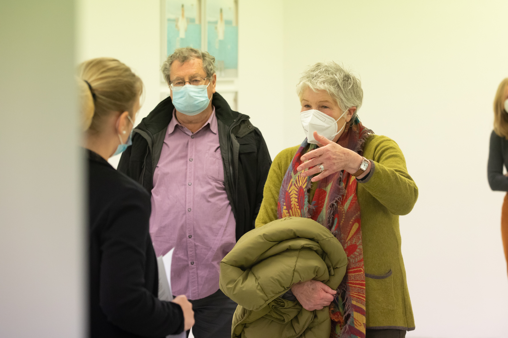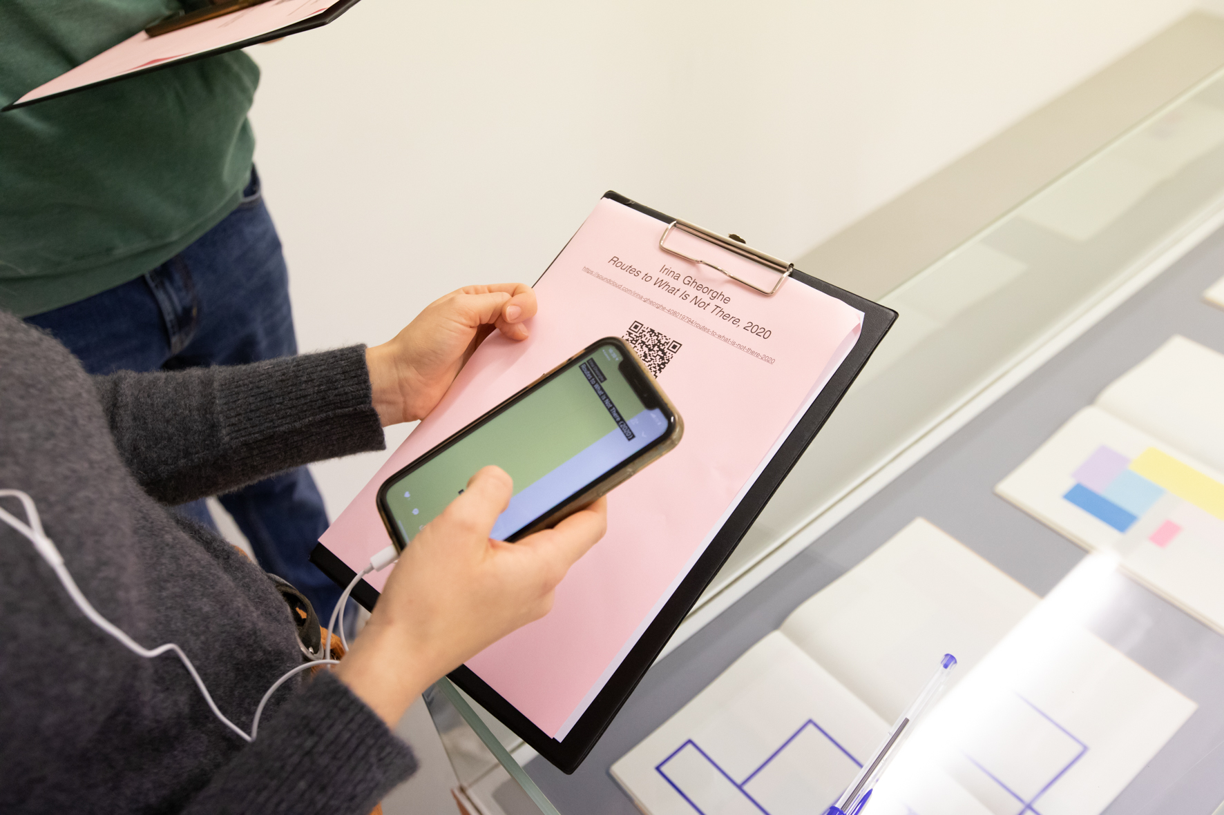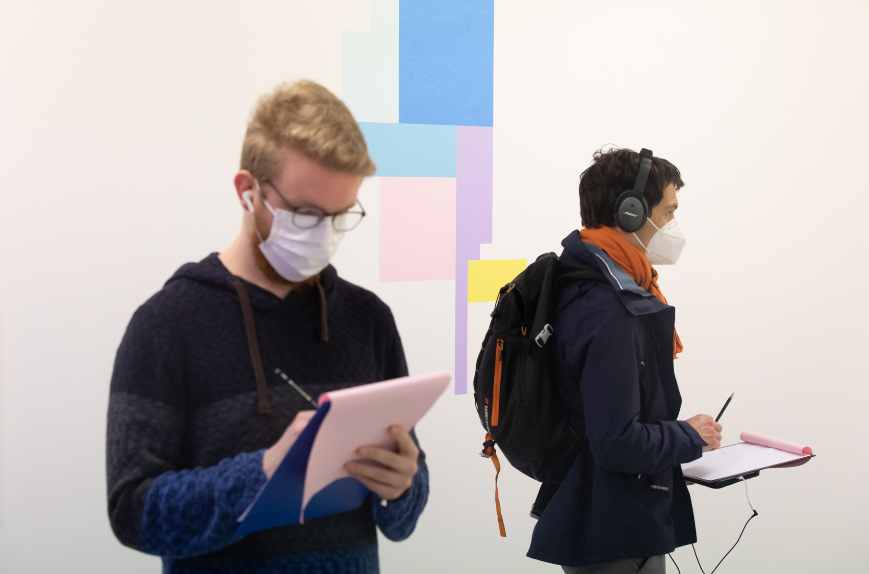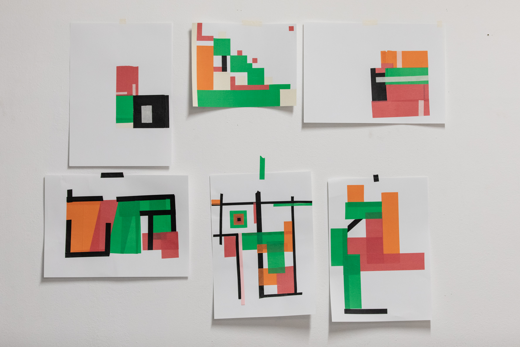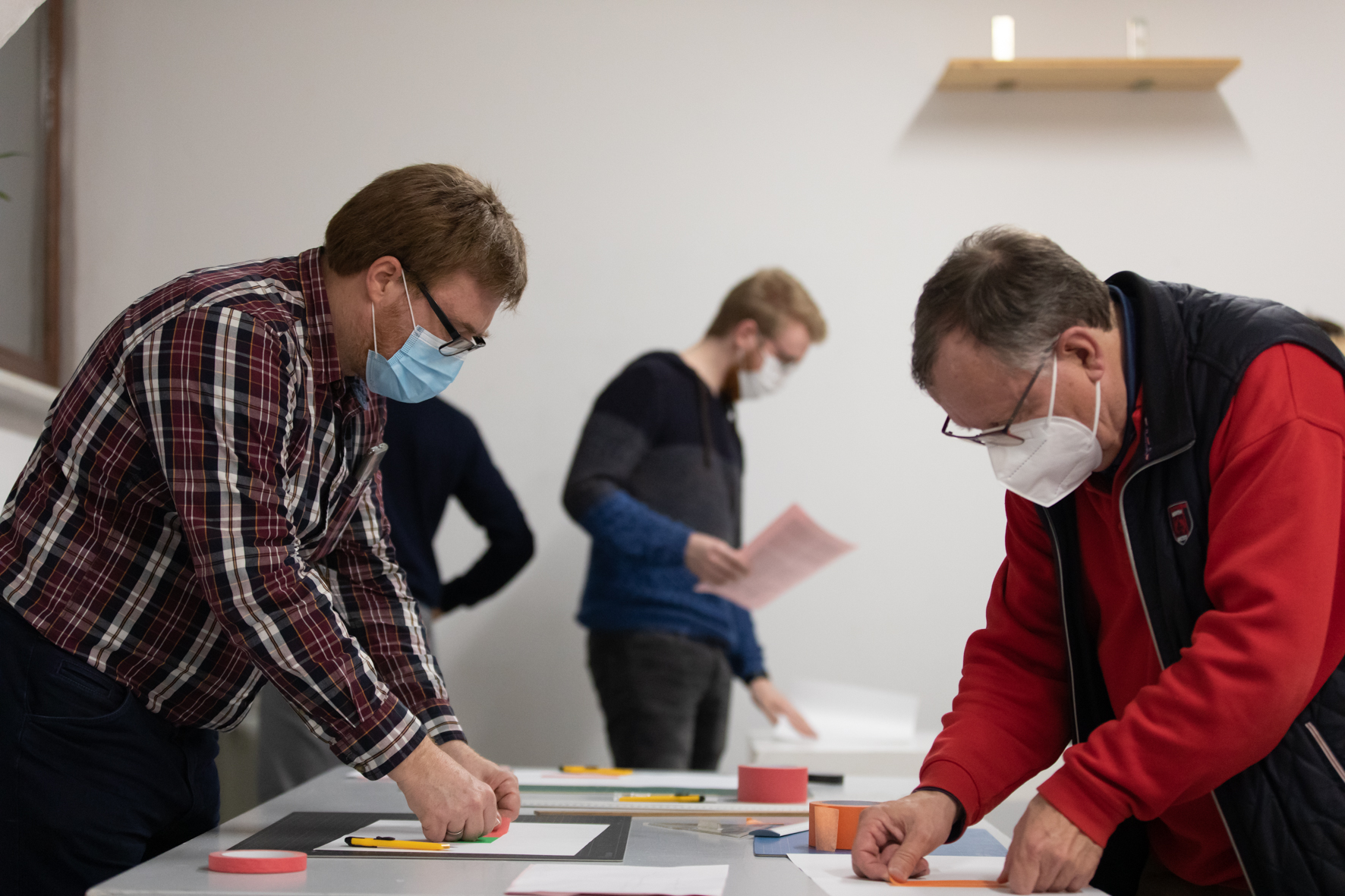 Innerhalb der Ausstellung Methods for the Study of What Is Not There von Irina Gheorghe lud die kuratorische Assistentin Julika Wagner das Team des Olbers Planetariums am 11. November 2021 zu einem Workshop ein. Teilgenommen haben der Leiter Andreas Vogel sowie neun Mitarbeiter:innen und Studierende unterschiedlichen Alters. Der Workshop setzte sich aus einer kurzen Führung durch die Ausstellung, einer interaktiven Rezeption von Gheorghes Soundarbeit Routes to What Is Not There (2020) und der Herstellung eigener Collagen zusammen. Die Teilnehmer:innen des Olbers Planetariums hatten die Aufgabe, sich in der Ausstellung zu verteilten, die Soundarbeit via QR-Code auf ihrem Smartphone oder auf den von uns zur Verfügung gestellten MP3-Playern mit Kopfhörern anzuhören und den Raum durch Abschreiten nach Anweisung der Künstlerin in verschiedene Kategorien des Unsichtbaren einzuteilen. Gleichzeitig hielten sie diese als Skizze auf Papier fest. Nachdem sie ihre eigenen „Landkarten“ nicht greifbarer Präsenzen im Raum erstellt haben, wurden in einer Feedbackrunde die individuellen Erfahrungen zusammengetragen. Im Fokus stand hier die Raumerfahrung jeder einzelnen Person und die Frage, ob und inwiefern sich diese im Zuge der Rezeption der Soundarbeit verändert hat. Anschließend durften sie im Gastatelier des Künstlerhauses eigene Klebebandzeichnungen erstellen. Für Irina Gheorghe bilden die „Tape Drawings“ aus der Serie Things of Which We Cannot Say (2017–fortlaufend) einen Ausgangspunkt für ihre Recherche. Sie zeichnet sie in Notizbücher, wo sie wie Diagramme für eine geheime Wissenschaft, wie Kartografien oder Grundrisse für unbekannte Räume erscheinen. Gheorghe hat ein Farbschema entwickelt, in dem jede Farbe der rechteckigen Farbflächen für eine andere Kategorie von Abwesenheit steht. Dem Team des Olbers Planetariums wurden Papier, farbige Tapes und Schneide-Utensilien zur Verfügung gestellt, um diese Methodik selbst anzuwenden. Dabei dienten ihnen die in der Ausstellung erstellten Raumskizzen als Vorlage. Die Resultate sind visuelle Zeugnisse der individuellen Raumwahrnehmungen der Teilnehmer:innen, die verschiedene Kategorien des Nicht-Wahrnehmbaren als deren Ausgangspunkt in den Vordergrund rücken.