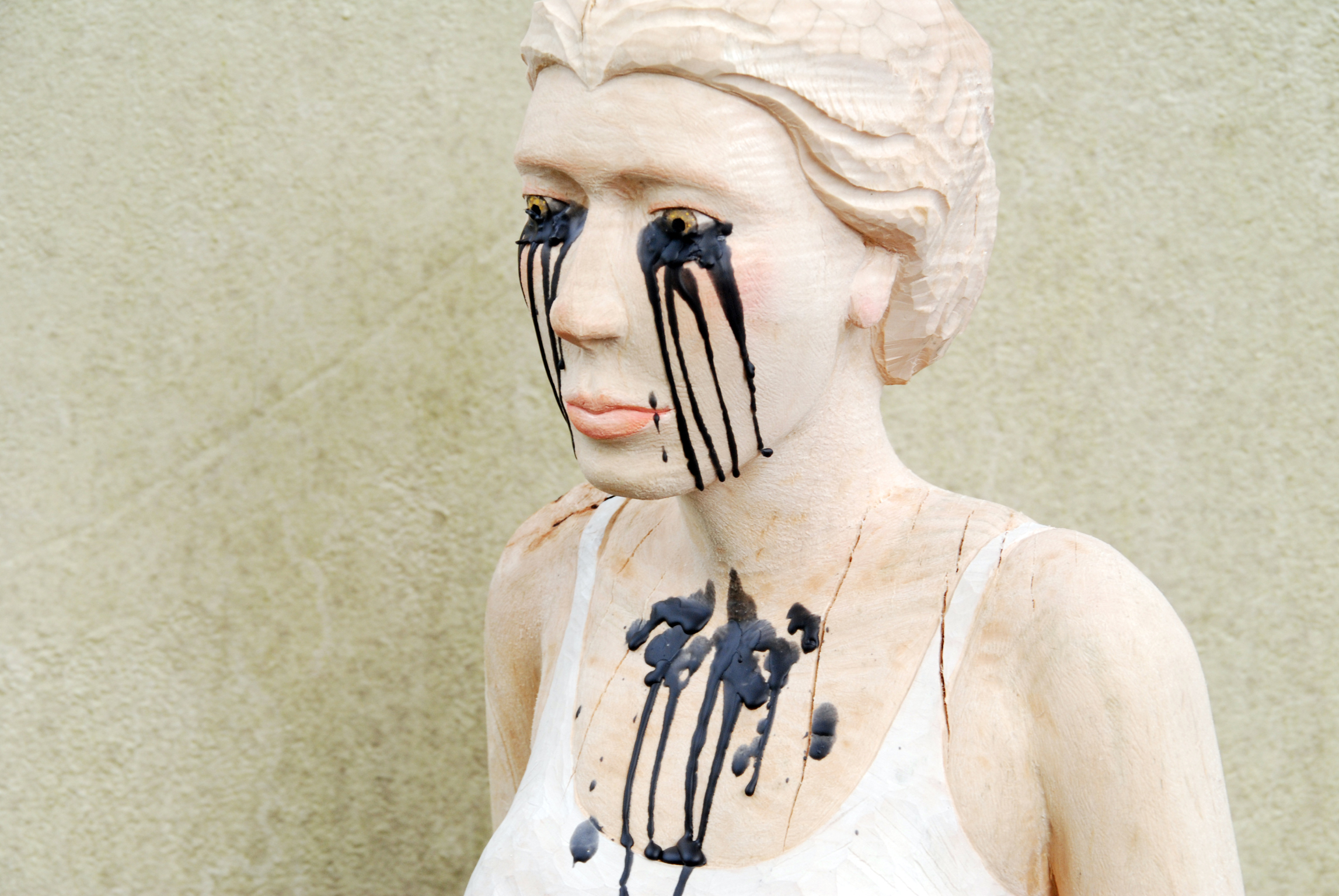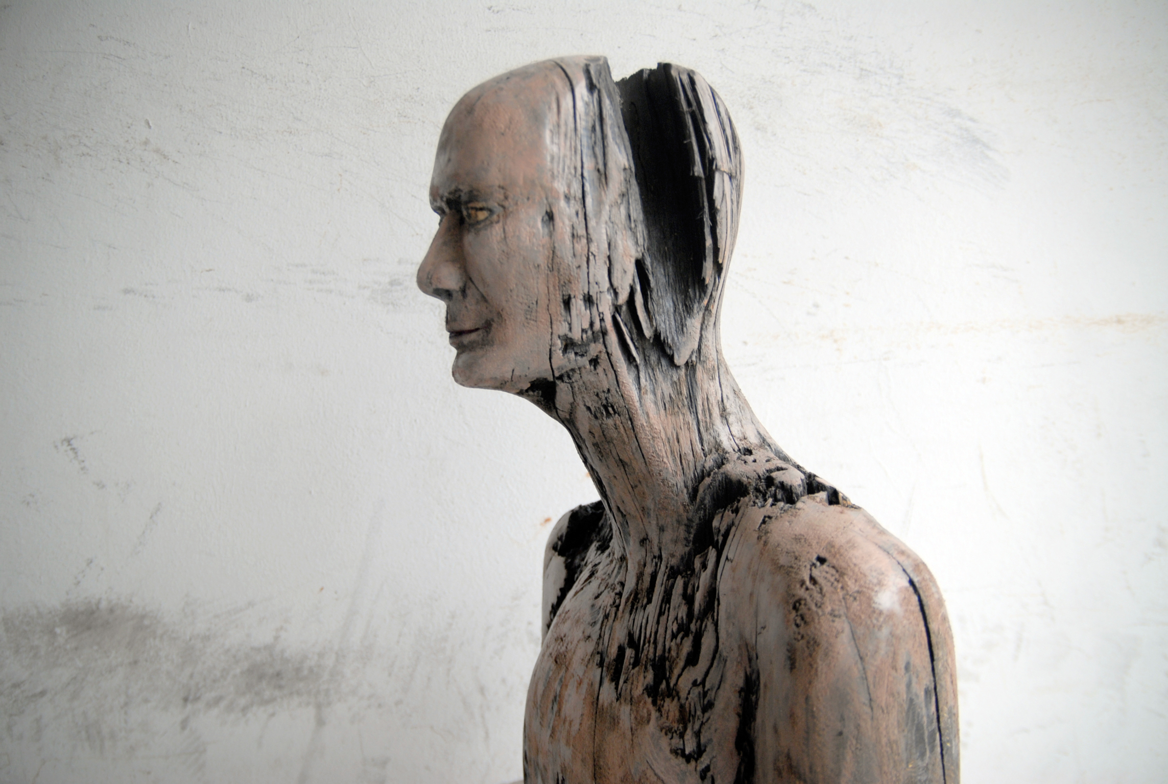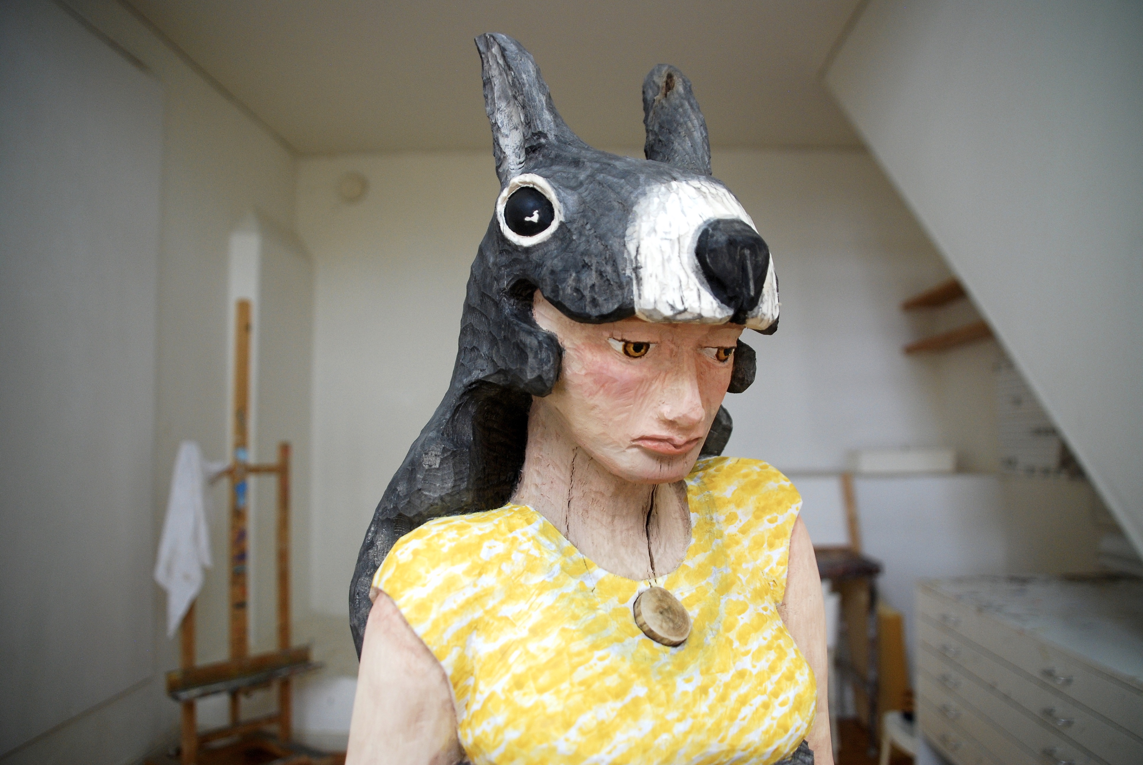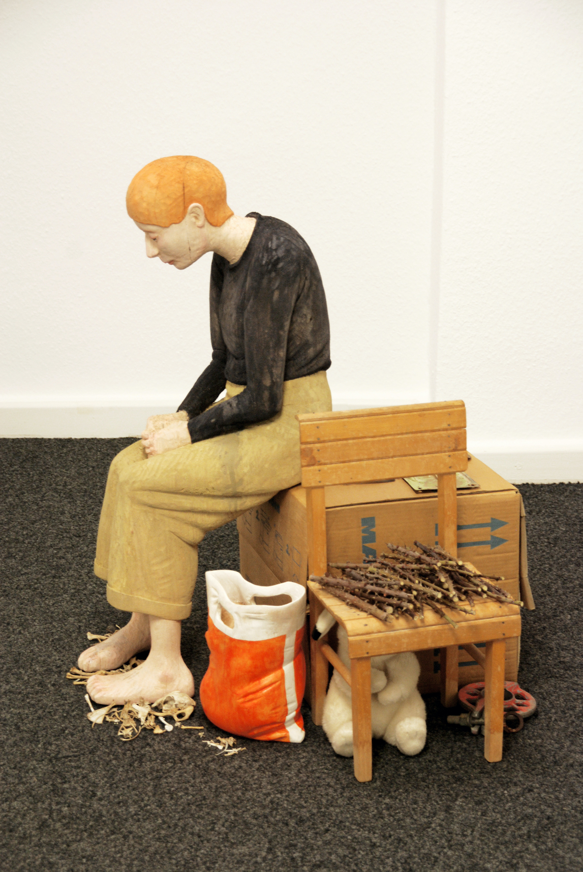 „Ich habe bestimmte, skulpturale Eindrücke und Einflüsse gesucht, und andere, illustrative gefunden, zufällig, ganz im glücklichen Sinne der Serendipität. Helsinki hat mir viel Interessantes für die Arbeit gegeben, ich habe es dankbar aufgenommen und hoffe, etwas davon durch meine Arbeit zurückgeben zu können. Die Skulptur „Suomi“ basiert auf zwei Inspirationsquellen: zum einen eine lebensgroße Bronze des finnischen Bildhauers Walter Runeberg von 1885 und zum anderen die Arbeit „Stereotypie“ des zeitgenössischen Helsinkier Illustratoren Eero Lampinen. Einiges aus beiden Werken habe ich aufgenommen, verändert, und schließlich in meine eigene Sprache übersetzt. Entstanden ist eine Holzskulptur, die ernst und etwas ironisch zugleich nach der heutigen finnischen Identität fragt, ohne Wertung, aber voller Phantasie.“