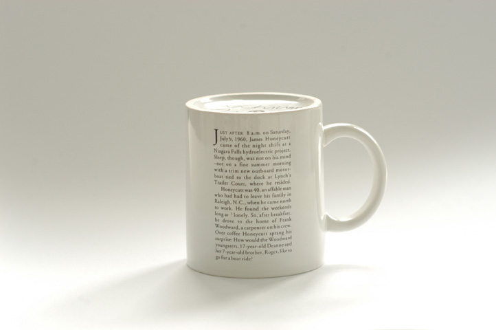Wie bereits in vorangegangenen Werken nimmt Jonathan Monk (*1969 in Leicester/GB, lebt in Berlin) auch bei dieser Arbeit Bezug auf einen Konzept-Künstler der 60er und 70er Jahre: Bas Jan Ader. Er greift dessen Künstlerbild und Utopie in zugleich ernsthafter und humorvoll-ironischer Weise auf. Im Rahmen einer Performance im Kabinett für aktuelle Kunst, Bremerhaven, las Bas Jan Ader 1972 aus der Abenteuergeschichte The Boy who fell over the Niagara Falls vor, welche sich heute verteilt auf den 24 Tassen von Jonathan Monk wiederfindet. Der Künstler als Erzähler, zugleich der Bezug der Geschichte auf dessen Selbstverständnis als Abenteurer sowie der Akt des Fallens wurden hier von Ader thematisiert. In humorvollen Andeutungen und auf seine Weise neu interpretiert, bezieht sich auch Jonathan Monk auf jene drei Aspekte. Dem Nutzer einer einzelnen Tasse überlässt er dabei nur ein Bruchstück der erzählten Geschichte und wer, bevor er seine Tasse geleert hat, neugierig lesen will, was dort geschrieben steht, wird selbst ein Abenteuer erleben, wird selbst zum Mug*.