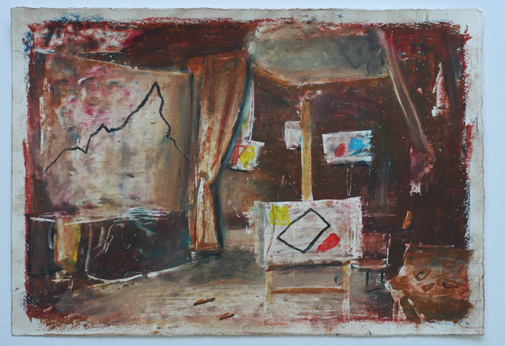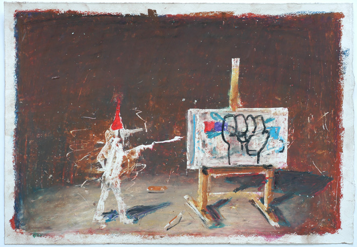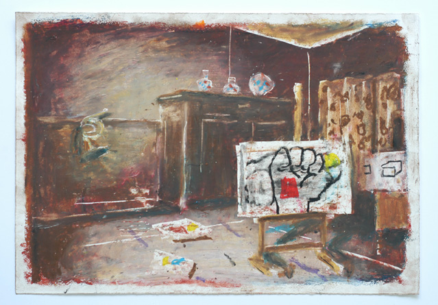 Der vielschichtige braune Grund der Bilder, die schweren, dichten Vorhänge und die dunklen Holzmöbel stehen im auffälligen Kontrast zu den im Raum verteilten Gemälden. Diese wirken wie Stereotype abstrakter Malerei. Dominiert werden die drei dargestellten Räume von einer Staffelei, auf der eine Leinwand steht. Kämpferisch erstrahlt eine Faust. Der sozialistische Gruß wird zur Kurzformel einer Utopie stilisiert. Atmosphärische Versatzstücke erscheinen als Elemente einer Karikatur. Eine der drei Arbeiten zeigt eine Figur, den Maler, hineingekratzt in den Grund der Zeichnung. Zerrissen zwischen den Epochen oszilliert sie in grotesker Verzerrung zwischen Narr und Magier.
