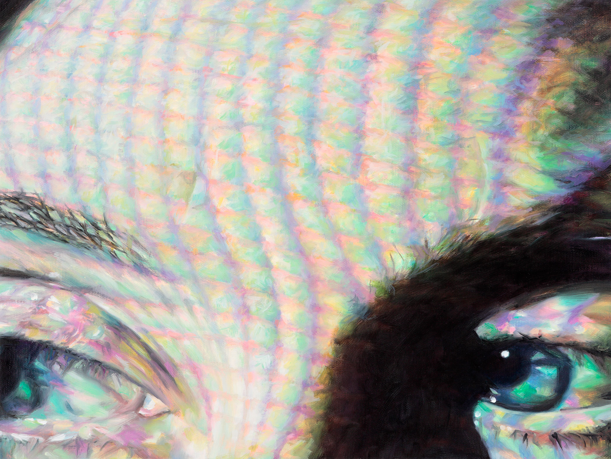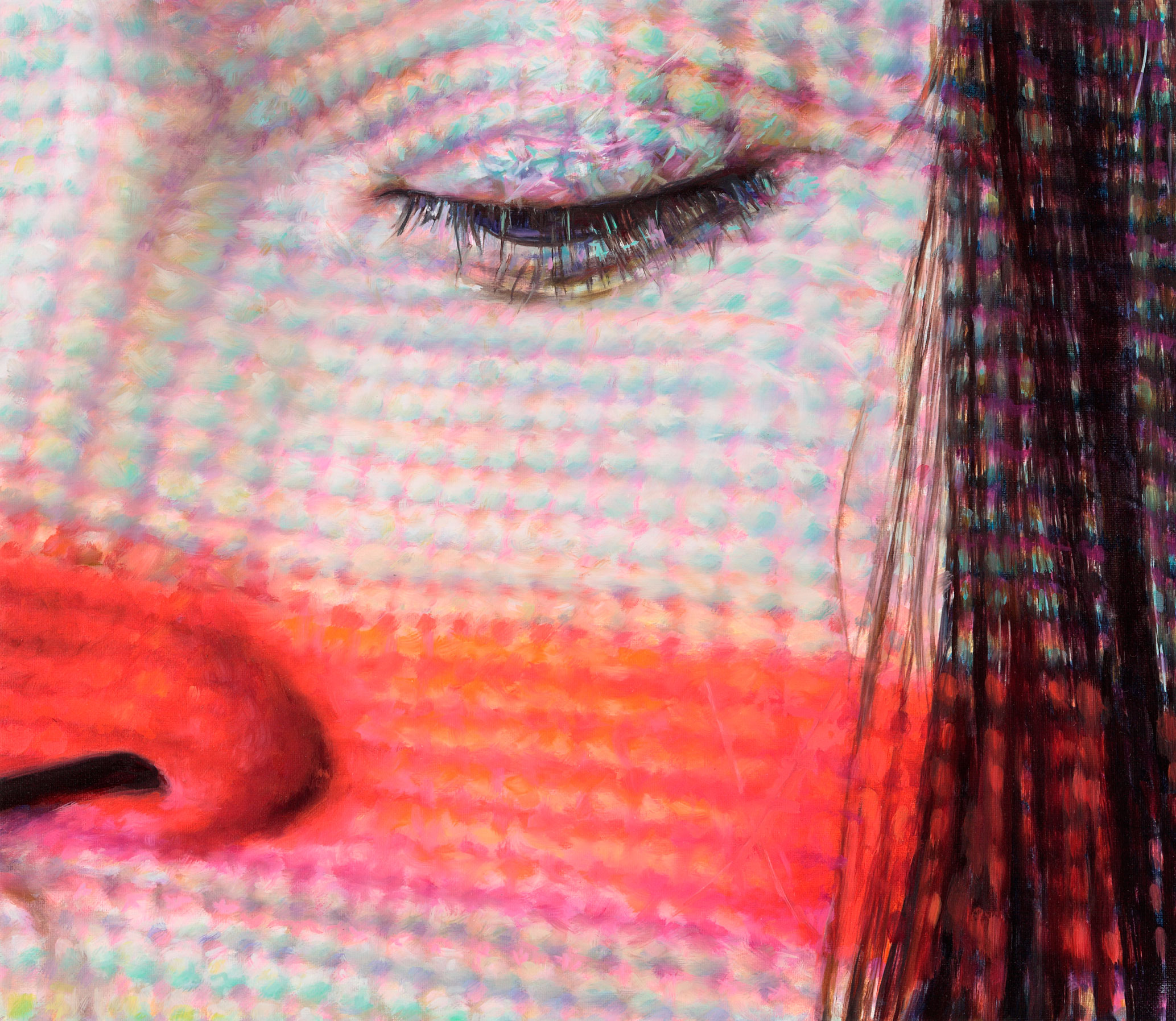 Aufmerksame Beobachtung, Vergrößerung und Detail sind Voraussetzungen für die Malerei Marina Schulzes (*1973 in Delmenhorst). Sie bringt Ausschnitte und Oberflächen mit einer Genauigkeit auf die Fläche, die sich der fotografischen annähert und erreicht dadurch eine Monumentalisierung des abgebildeten Gegenstandes. Immer wiederkehrend sind Arbeiten, in denen sich die Künstlerin auf Teile des menschlichen Körpers konzentriert. o.T. (GA IX), o.T. (GA X), o.T. (GA XII) reihen sich in eine Serie von Gesichtsausschnitten ein, an der Marina Schulze seit einiger Zeit arbeitet. Überzogen von einer farbigen Lichtrasterung erhalten die hyperrealistisch dargestellten Gesichtspartien ein unnatürliches und befremdliches Aussehen. Das virtuose Spiel mit der Oberfläche der Haut, ihren Strukturen und Eigenheiten sowie das Auftreffen des Leuchtrasters, schaffen eine Annäherung an die ungegenständliche Malerei. So verwandeln sich figürliche Motive in abstrakte, gegenstandlose Flächen, die eine Illusion von Detail und Gesamtbild, von Realität und Wahrnehmung schaffen.