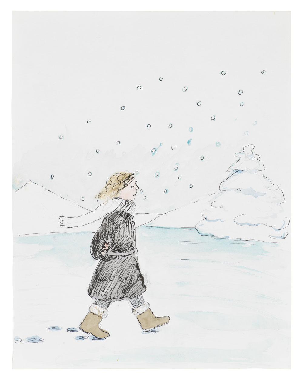 Ihre Jahresgabe ist einer der unveröffentlichten Coverentwürfe für das Buch Am Kühlen Tisch (Portikus, Frankfurt a.M., 2014). Der gleichnamige Zeichnungenzyklus ist von Selbstironie und Selbstzweifel geprägt und stellt ebenfalls Eröffnungssituationen, Gespräche mit befreundeten Künstler*innen oder mit Gallerist*innen dar, sowie fantasierte Unterhaltungen zwischen der Künstlerin und Goya. Von Wulffens Selbstporträt stellt mit einfachen Mitteln die Künstlerin allein beim Spazieren durch den Schnee dar. Das Aquarell ruft das traditionelle Motiv des Künstlers gegenüber der Natur ins Gedächtnis, distanziert sich jedoch deutlich von romantischen Modellen und weist einen pragmatischen, realistischeren Ton vor.