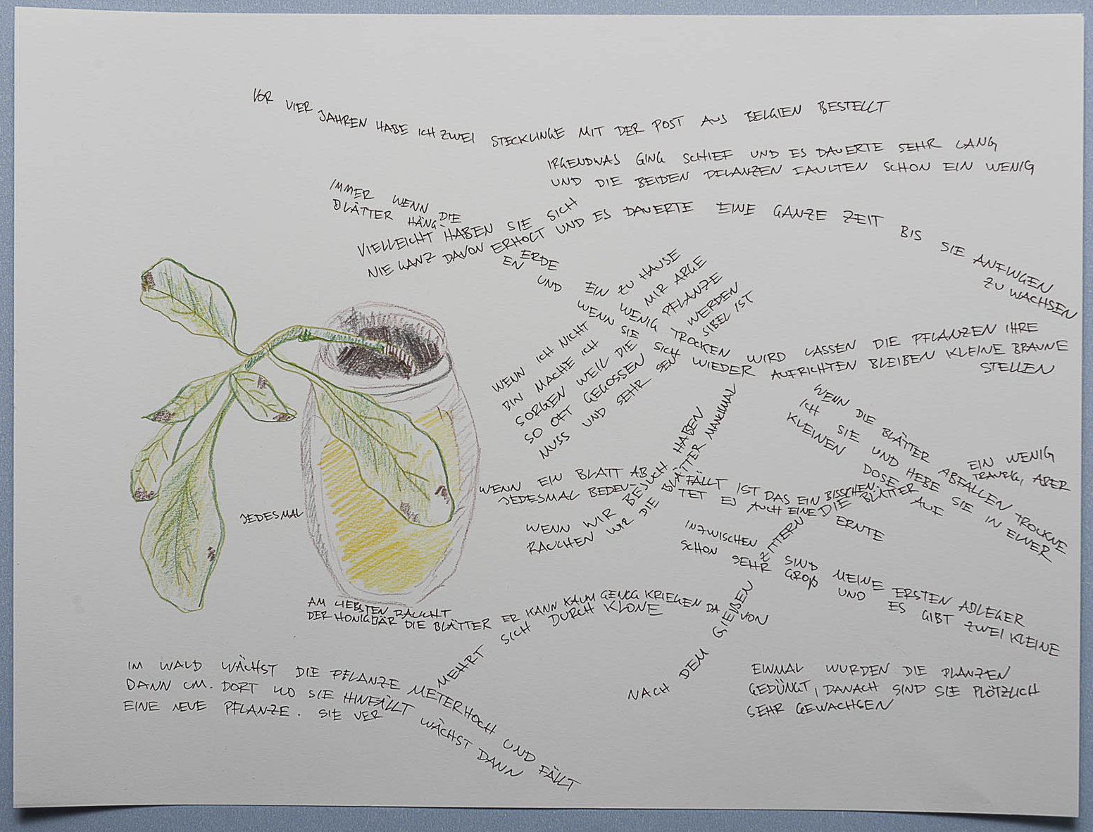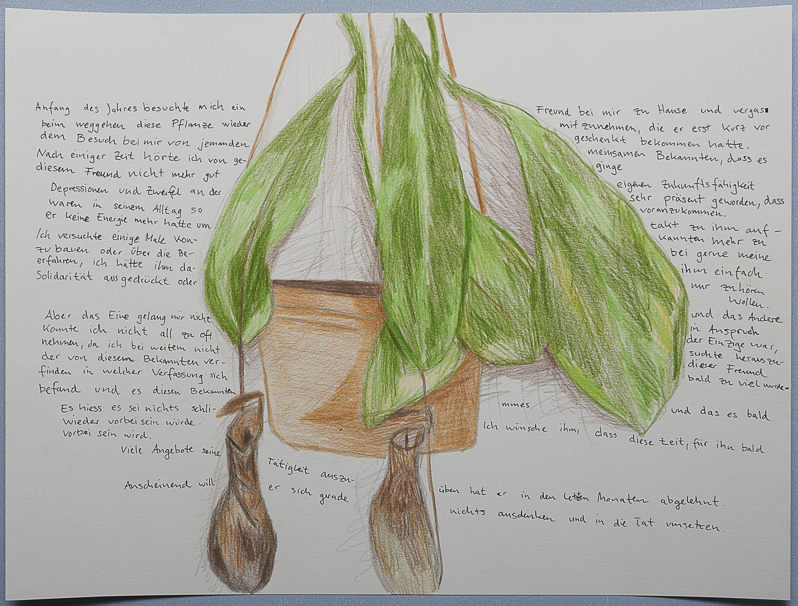 Als Jahresgabe haben sie jeweils eine Zeichnung angefertigt, ein ungewöhnliches Medium in ihrer Arbeit. Die Künstler zeigen damit eine Auswahl ihrer jeweiligen Zimmerpflanzen, begleitet von einer Beschreibung ihres Verhältnisses zu jeder von ihnen. Die zwei Zeichnungen deuten die vielschichtigen Vernetzungen dieser scheinbar beliebigen Pflanzen an. Ihre Präsenz ist nicht nur von einer bestimmten Handelsinfrastruktur bedingt, die sich an die Sehnsucht nach Natur anlehnt, um diese in einem häuslichen Format umzuwandeln. Sie stehen auch für ein Netzwerk von Geschichten und Freundschaften, durch welches diese allgegenwärtigen Gewächse zu den Künstlern nach Hause gekommen sind. Mit einfachen, bescheidenen Mitteln stellt die Arbeit die Durchlässigkeit zwischen dem privatem Bereich und der vom Markt bedingten Verbindung zur Natur heraus.