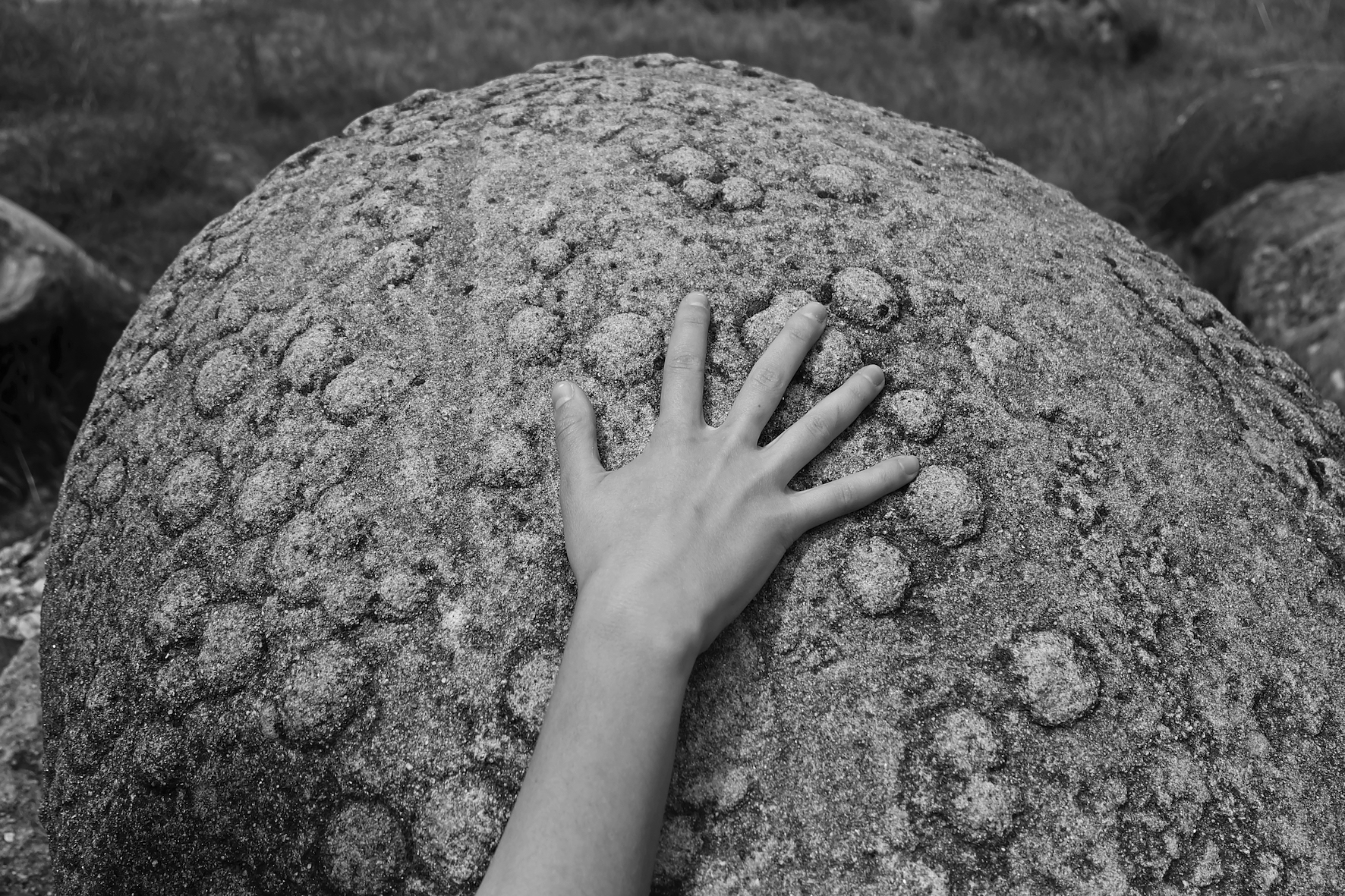 Nona Inescu (* 1991 in Bukarest, lebt in Bukarest) präsentierte in ihrer ersten institutionellen Einzelausstellung im Künstlerhaus Bremen im Sommer 2019 Arbeiten, die die menschliche Interaktion mit natürlichen und primitiven – animierten und unbelebten – Materialien in den Blick nehmen. Die Künstlerin zeigt Analogien zwischen menschlichen, tierischen, pflanzlichen und mineralischen Formen auf und schlägt mögliche Wechselwirkungen zwischen menschlichen und nicht-menschlichen Körpern durch Körperkontakt oder Berührung vor. So auch auf dieser Fotografie, auf der eine Hand den Körper einer Sandsteinkonkretion ertastet. Der Titel der Arbeit, Rugosa, verweist auf die ausgestorbene Runzelkoralle sowie auf die raue Struktur des Steins. Das Bild erinnert an eine Hand, die einen Bauch ergreift. Inescus Arbeit stellt die herkömmliche Subjekt-Objekt-Beziehung in unserem Verhältnis zur »Natur« in Frage.