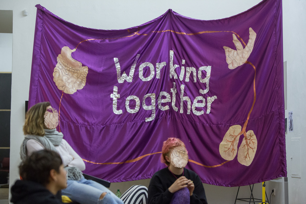 Die Feministische Gesundheitsrecherchegruppe (Julia Bonn/Inga Zimprich) erprobt seit 2015, wie Praxen gegenseitiger Fürsorge im Kunstfeld angewandt werden können. Sie hinterfragt ableistische Produktionslogiken im Kunstbereich und erarbeitet selbstermächtigende, feministische Perspektiven auf Gesundheitsversorgung. Dabei ist sie auch interessiert, wie sie aus dem Kunstfeld Diskussionen und Forderungen nach diskriminierungsfreier, zugänglicher Gesundheitsversorgung unterstützen kann.