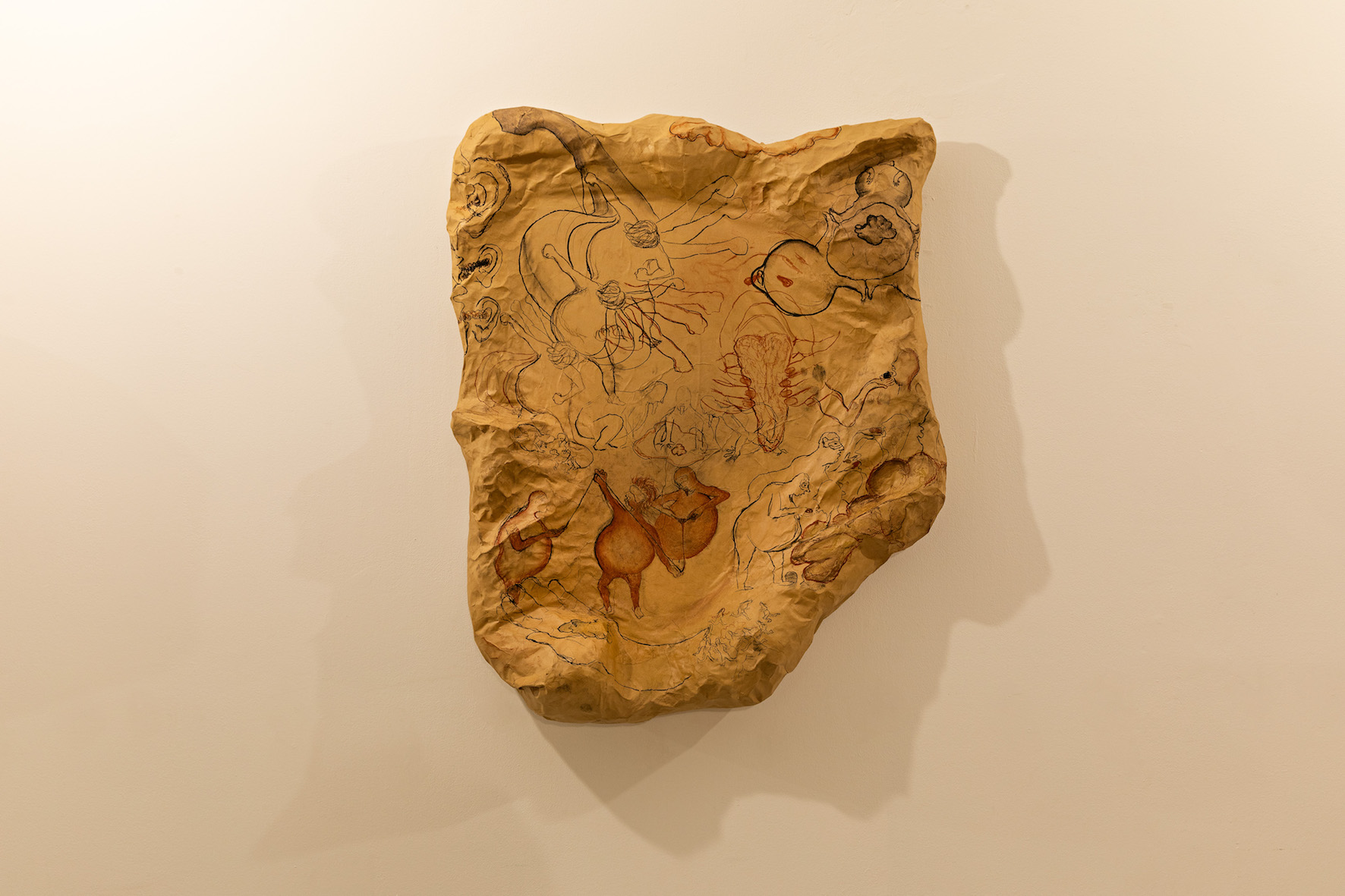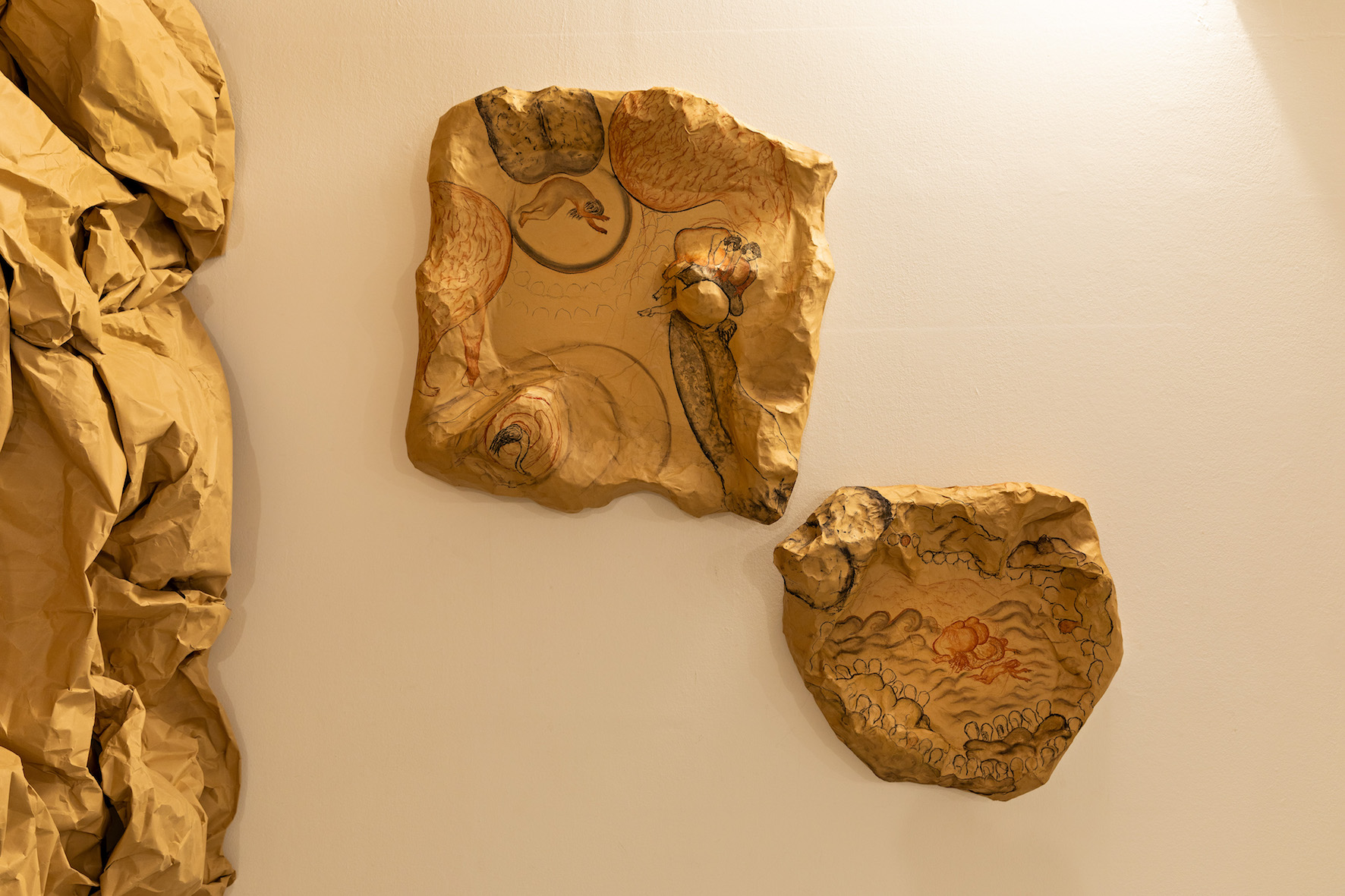 Dafna Maimon (b. 1982 in Porvoo, Finland) produces performances, videos, installations and situations that play with incorporated social norms and cultural codes, deconstructing them through grotesque exaggeration. In her solo exhibition, Mutating Mary, Maimon sets up an absurd scenario that weaves together the historical figure of Mary Mallon (1869–1938), aka "Typhoid Mary,” reproductive ideologies and the idea of "viral" infection in an immersive installation. The show is a continuation of a performance, titled Wary Mary, that was staged in the Tieranatomisches Theater in Berlin in August 2019. For the installation, the artist regurgitates elements of the performance into the space: Infectious body parts invade the gallery while drawings, costumes, texts and sound provide testimonies of the development of events passed. The rough drawings, displayed like primitive cave-paintings, capture, ruminate on, and archive the movements the protagonists exercised and embodied in the performance. They will be reactivated during the finissage. In Mutating Mary Maimon creates an emotional landscape and space for critical examination in which humor – like in Greek drama – is applied as a means for catharsis.