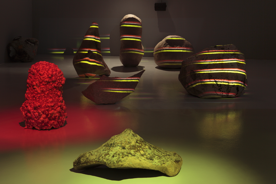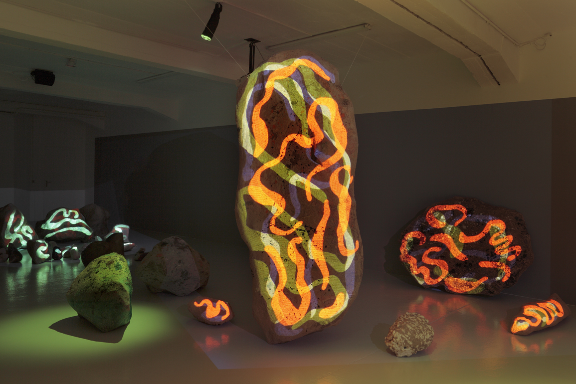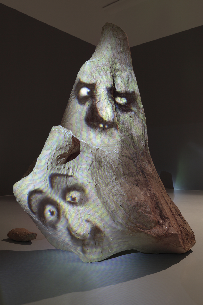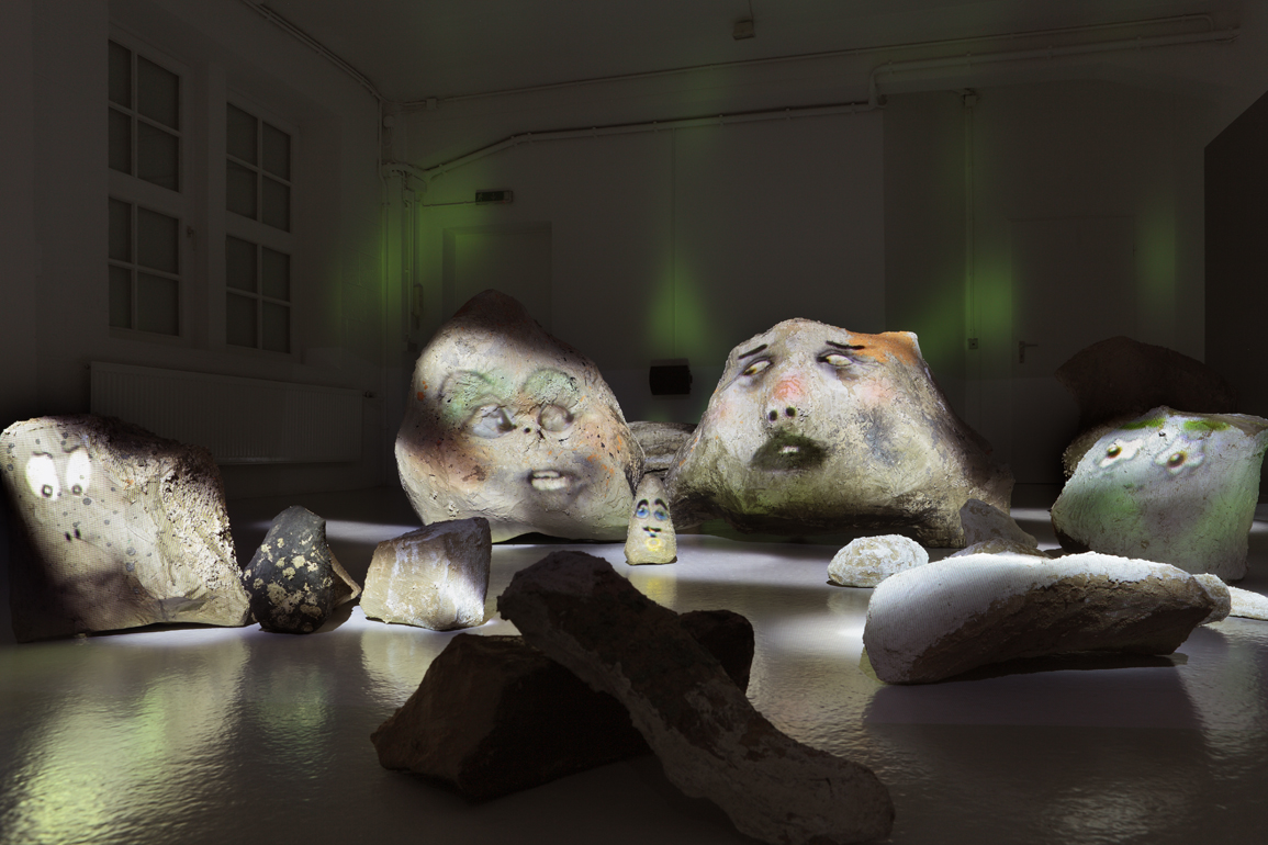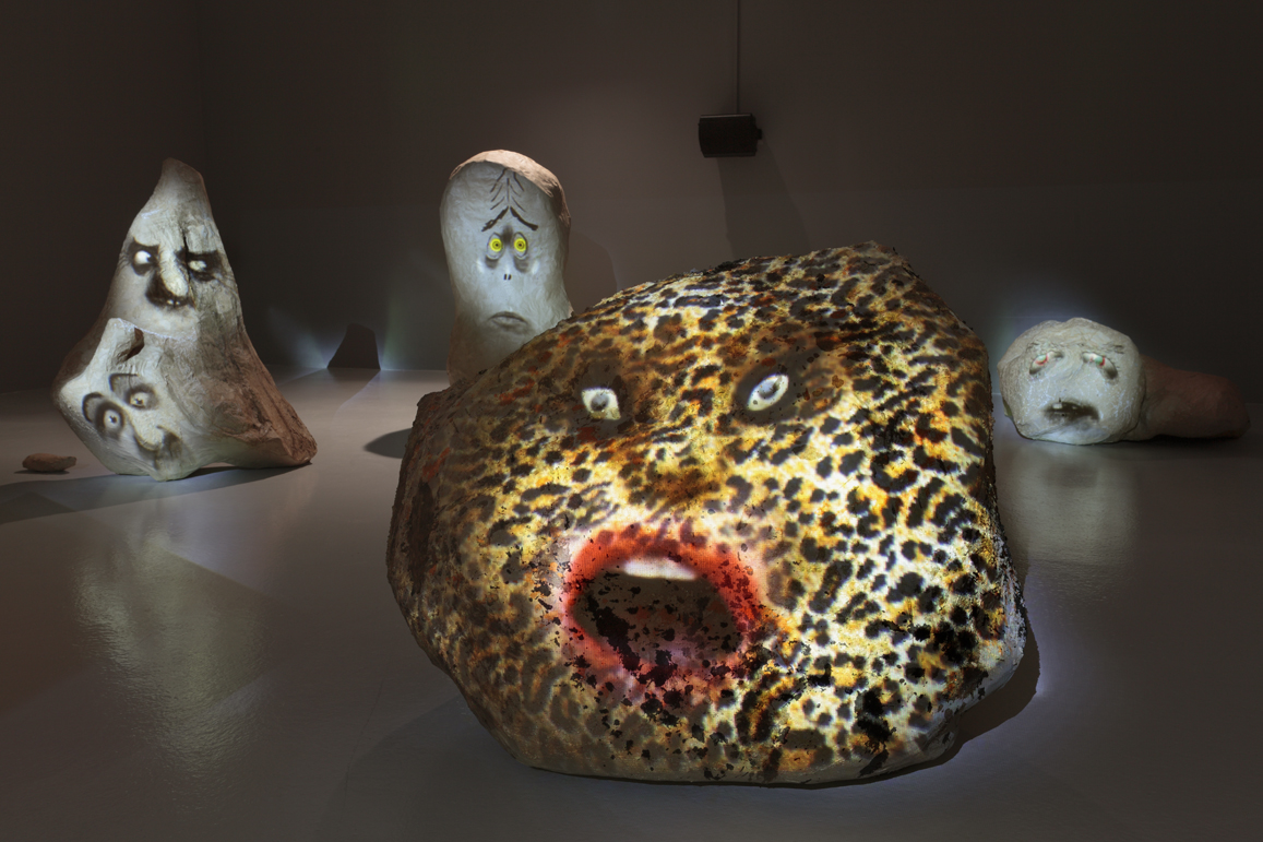 STONES - in his latest work Egill Sæbjörnsson takes a very different view of this lifeless mass of rocks. He enables it to lead a life of its own, thereby enabling us to become observers of their peculiar little world. The exhibition space is densely populated with talking and singing stones. They engage in dialogue and exchange views about their essence, their desires and their dreams. In doing so they exhibit altogether human features, and finally join together in song. Nothing is as expected in this fantastic universe. Yet is it not perhaps a kind of projection of our ideas of things that differs from the usual projection? Here, art candidly exposes itself as a tool for exploring and enriching the world. Play and experiment, humour and earnestness melt together and a new microcosm opens up.