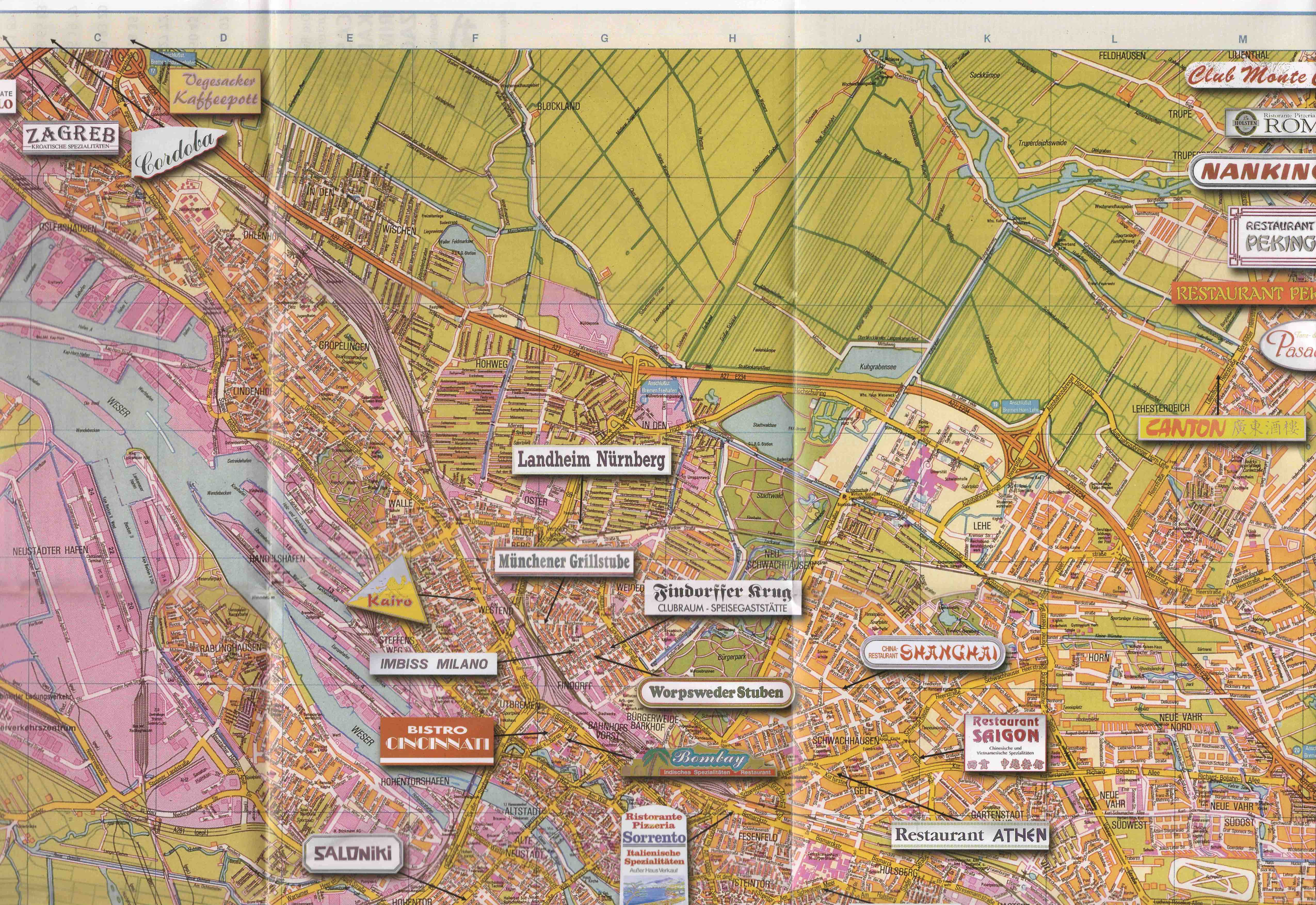 On a folding map of Bremen, as also available in the sales outlets of the tourist office, this new city map lists all the pubs in Bremen that have a city name - from "Athens" to "Hasenbürener Krug" and "Münchener Grillstube" to "Zagreb".