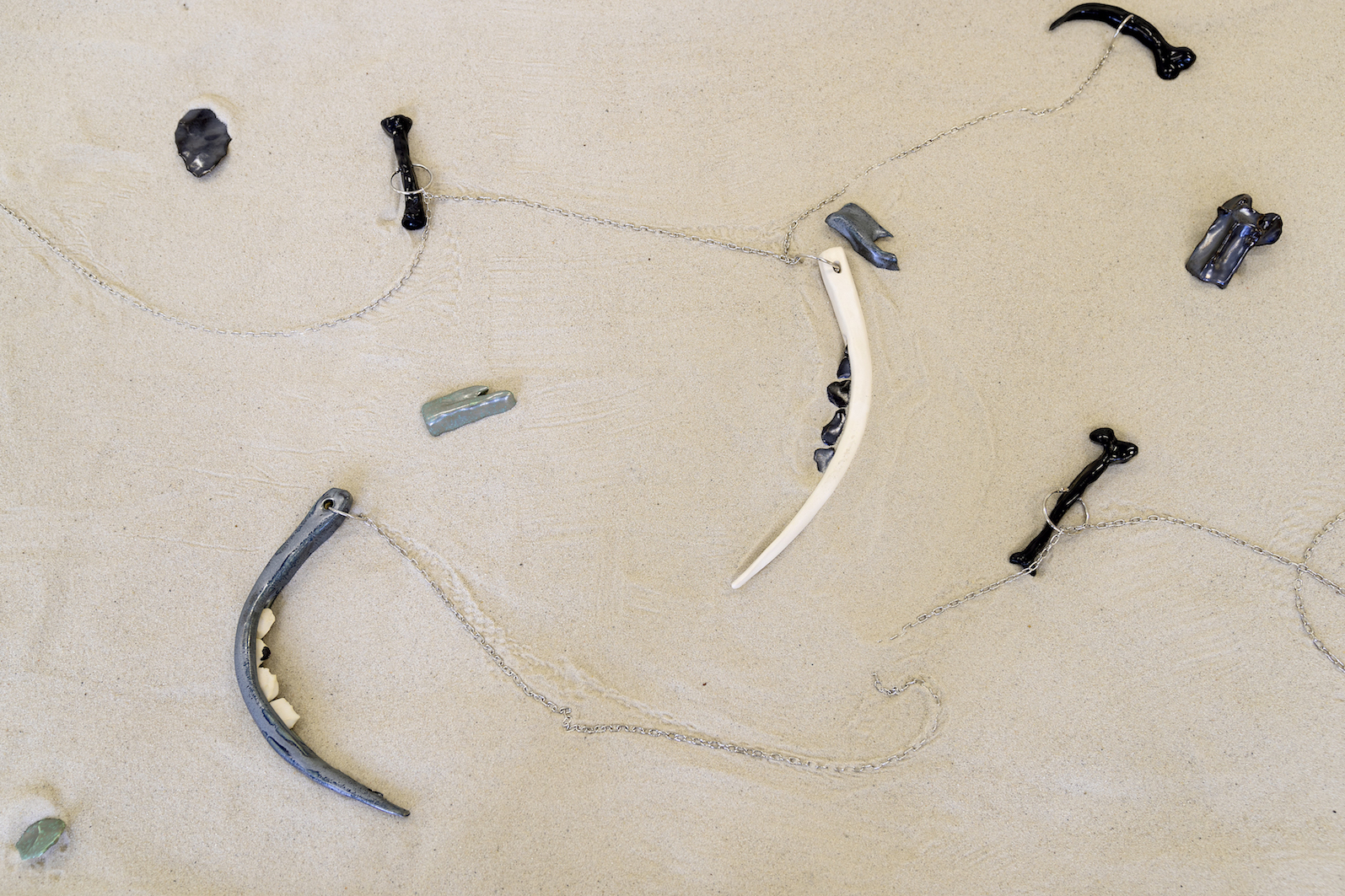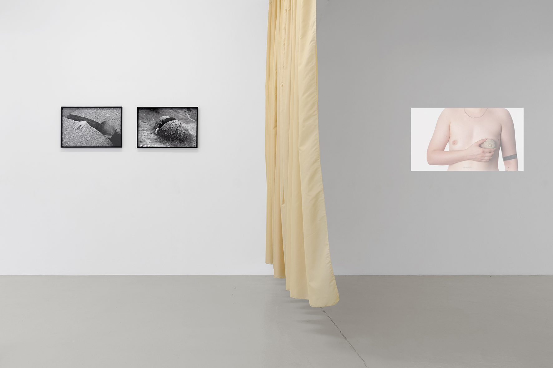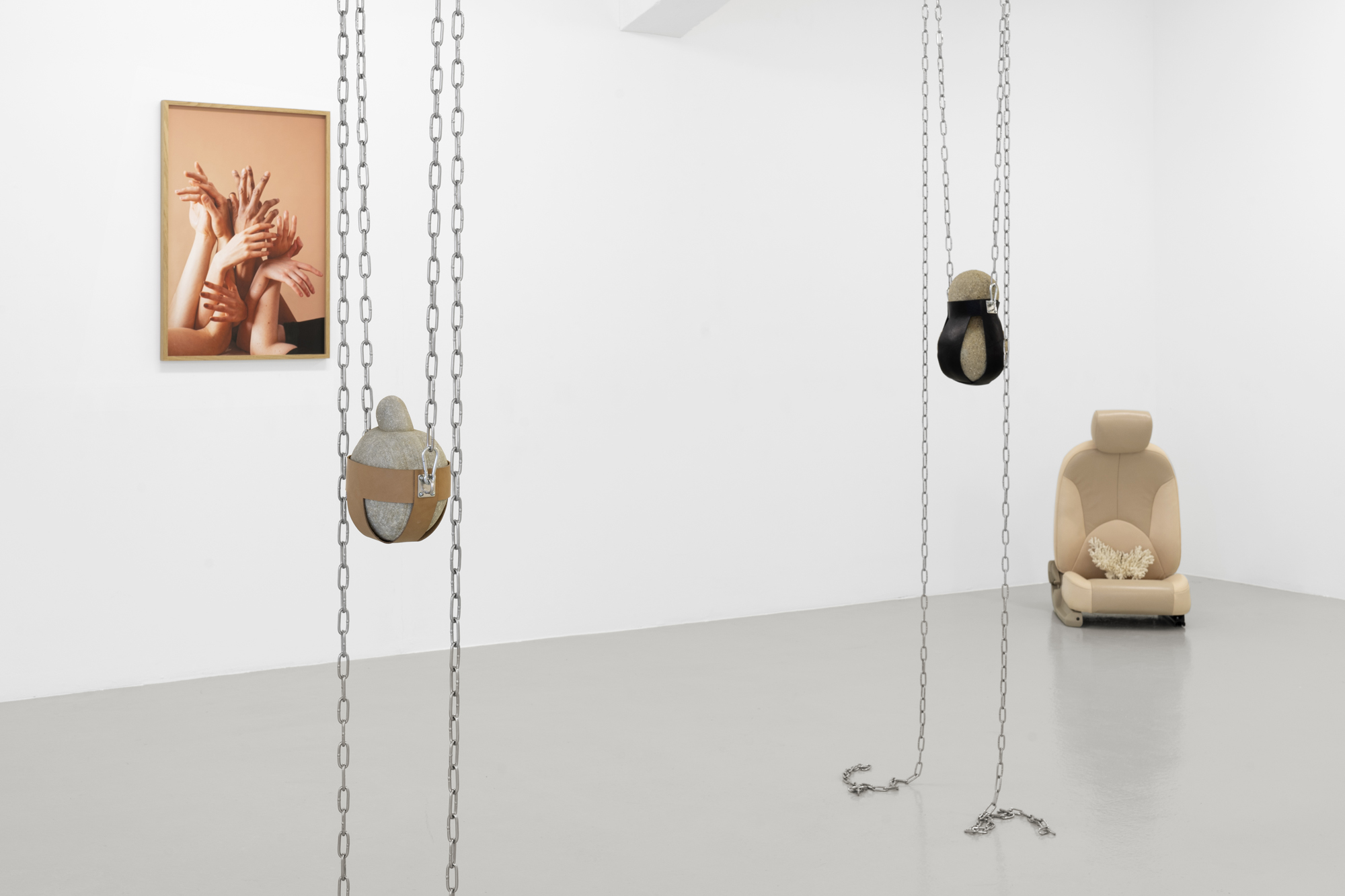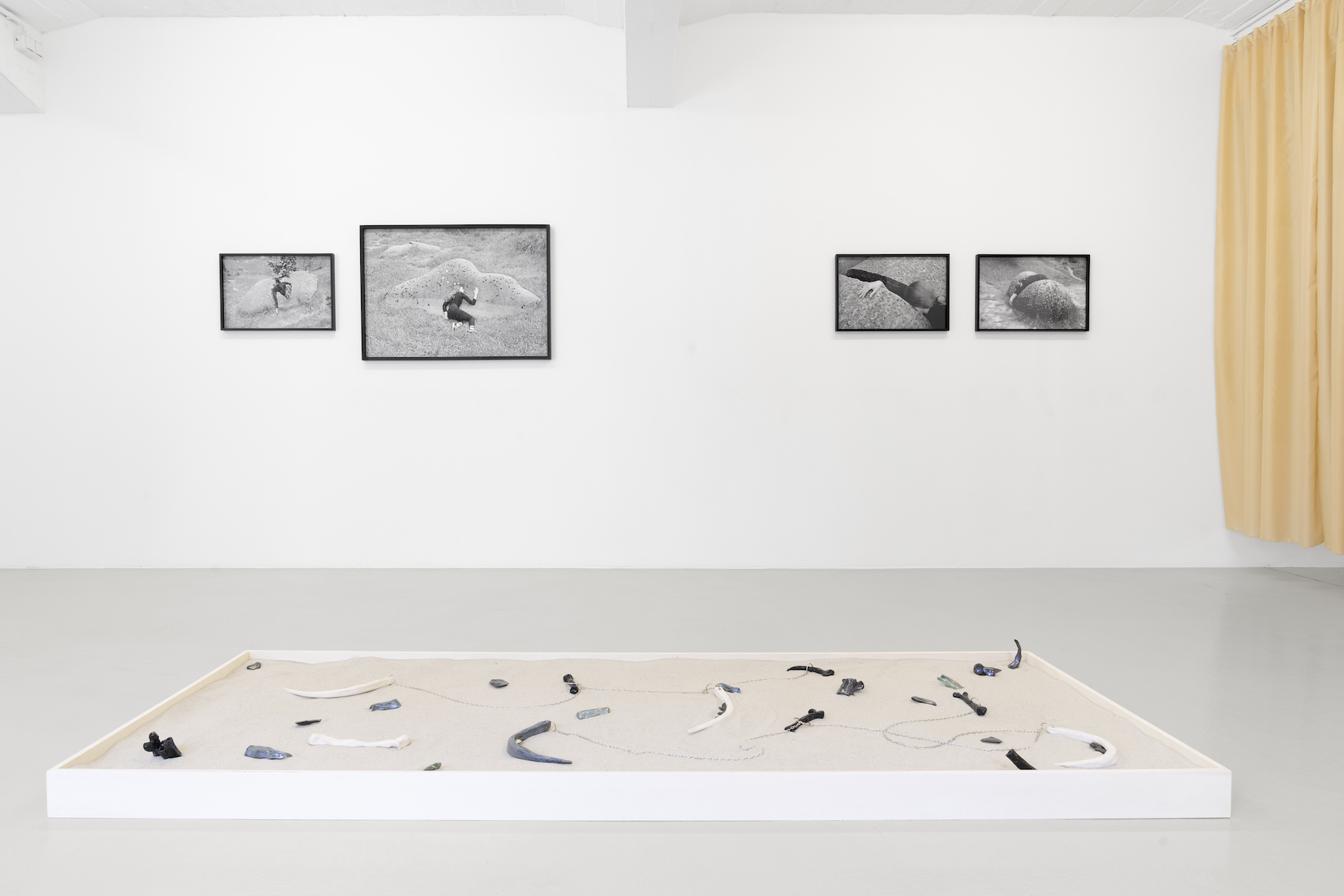 The solo show, Corporealle, presents works by artist Nona Inescu (*1991 in Bucharest) that focus on the human interaction with natural and primitive materials – animate and inanimate. In her photographs, videos, sculptural installations and objects, Inescu combines found objects from nature, such as stones or corals, with artificial or processed materials that imitate natural qualities, as for example leather. She dissects objects, removing them from their contexts, to carefully arrange themin sensual, poetic compositions of formal similarities and material juxtapositions in the exhibition space. Stones are enlivened; subject and object merge into each other and are no longer clearly distinguishable. The artist draws analogies between human, animal, vegetal and mineral features and proposes possible interactions between human and non-human bodies through physical contact or touch.