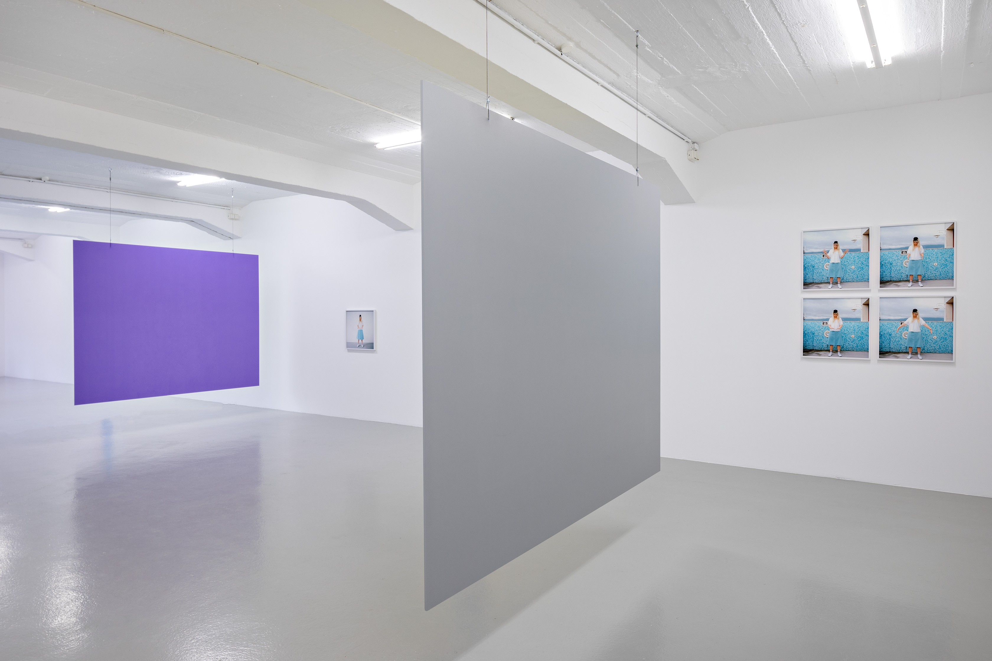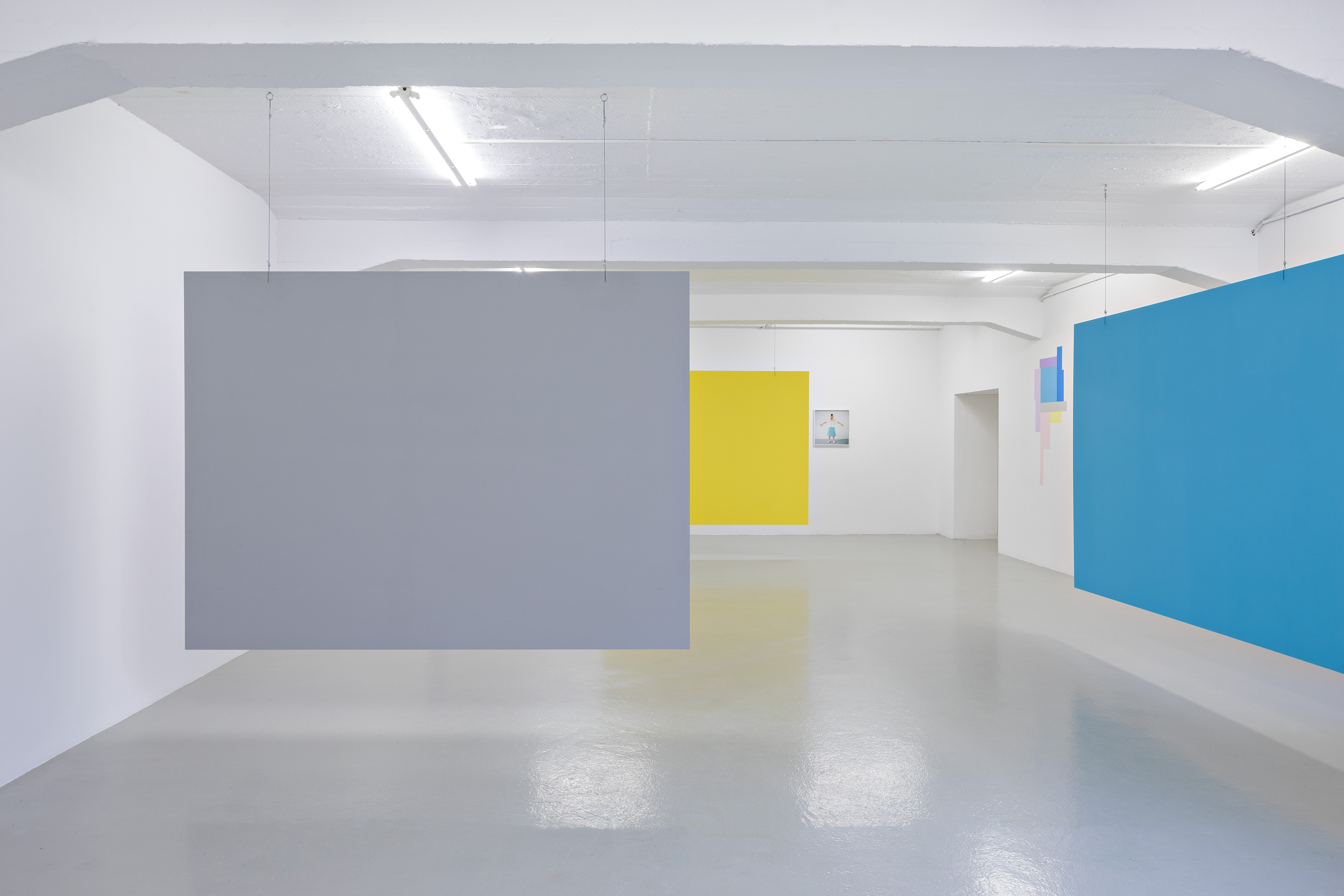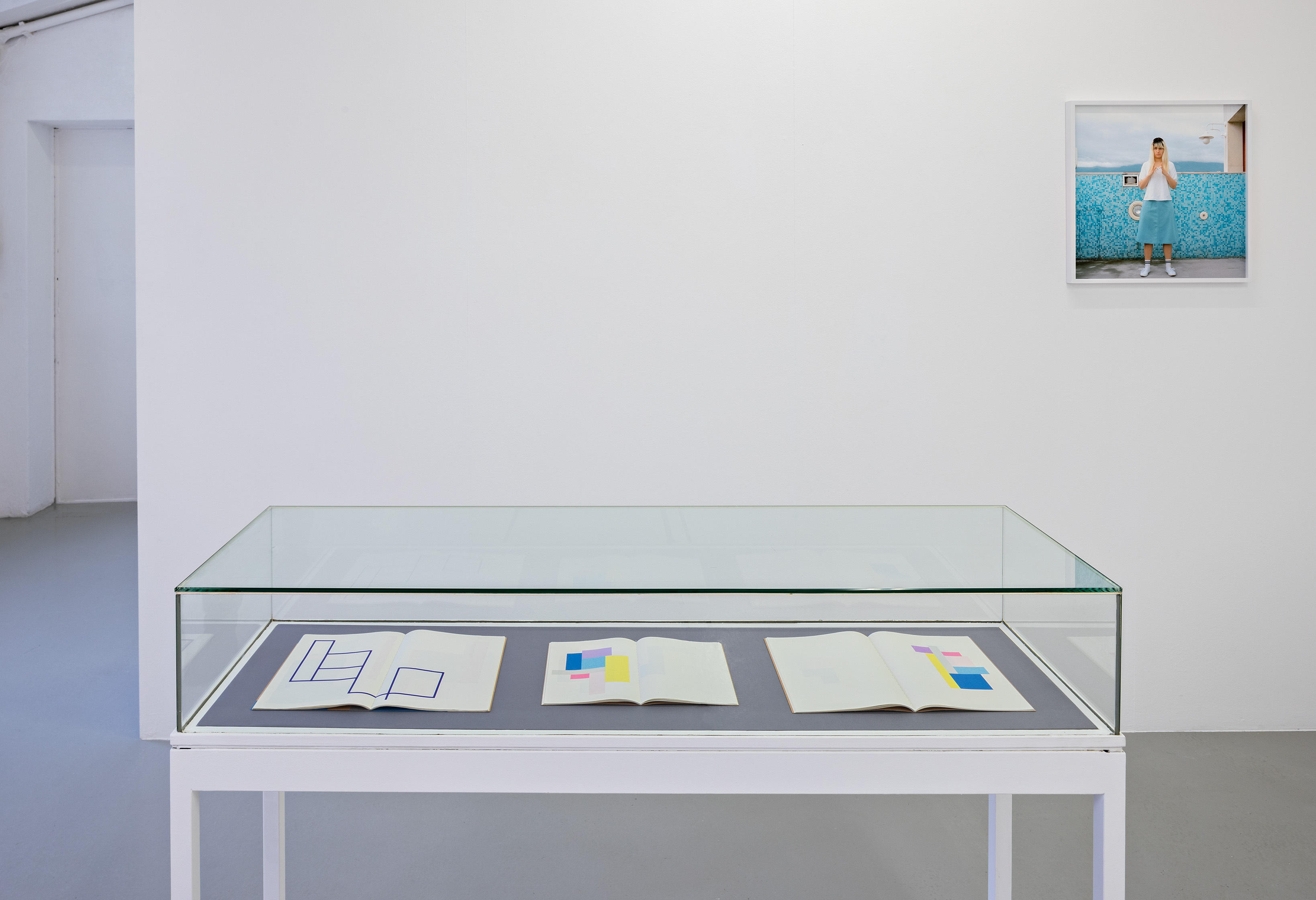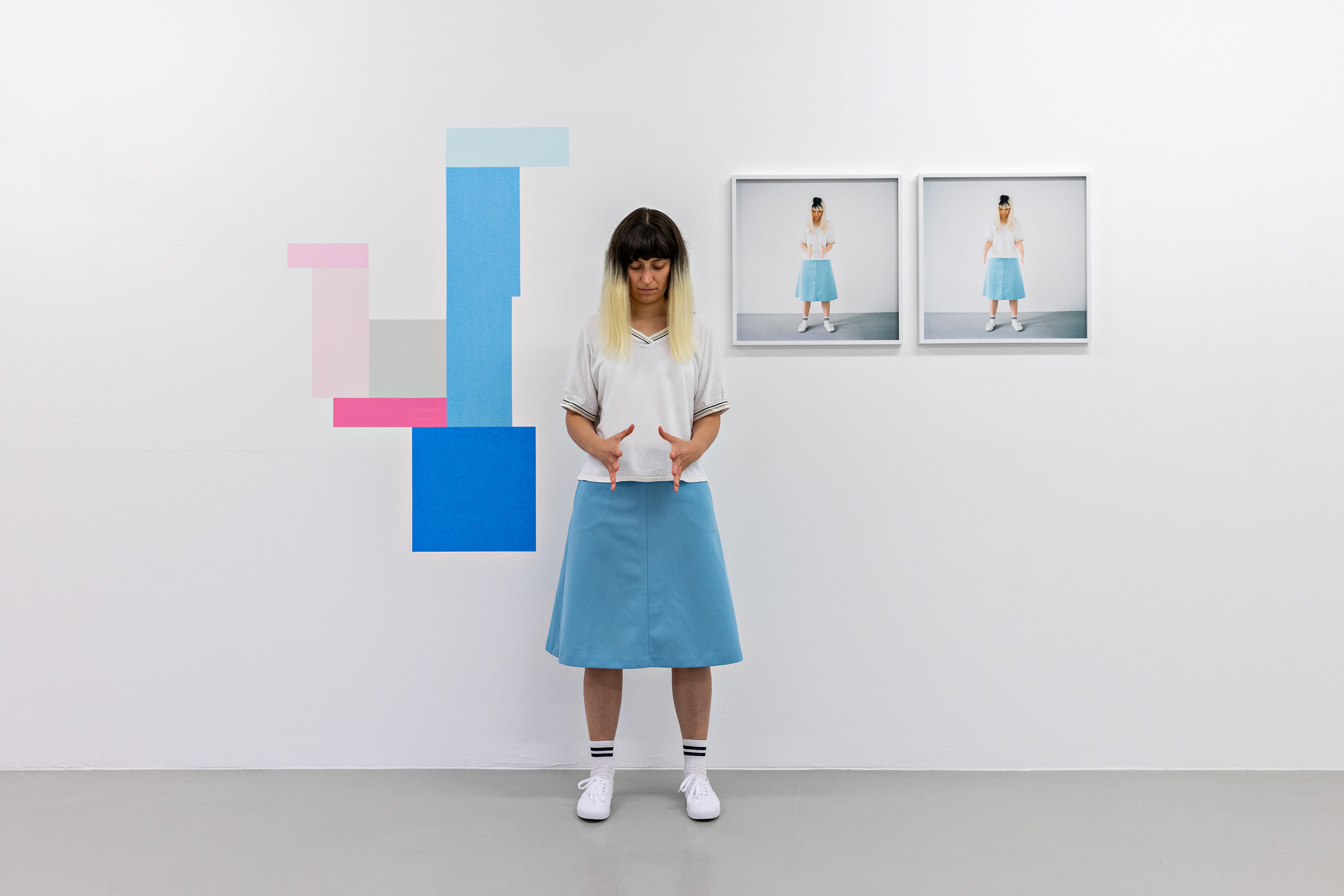 Under the title Methods for the Study of What Is Not There, Irina Gheorghe (b. 1981 in Târgoviște, RO, lives in Berlin) presents a performance and an installation comprising photographs, colored panels, a sound work and tape drawings. The formally rigorous drawings, composed of rectangular areas of color, are studies for the performance Preliminary Remarks for the Study of What Is Not There, which Gheorghe will perform at the opening of the exhibition. They are scores for choreographies in which she uses language and gestures to unfold an imaginary map of intangible presences in the space. Color-coded arrangements conceal various categorizations of non-perceptible entities that come together to form a cartography. Elements of earlier scores overlap in the installation and create an idiosyncratic temporality that distorts the present. Photographs show the artist executing gestures that she uses in her performance. The fragmentary character of the series allows an indecipherable vocabulary of gestures to emerge. Similarly to the text in the performance and audio work, they create an atmosphere of absurdity and alienation in which the applied sign system is debunked as an arbitrary system. In the performance, Gheorghe uses body language and voice to connect the existing space with another dimension of invisible existences. She oscillates between script and improvisation and involves both the spatial situation and the audience.