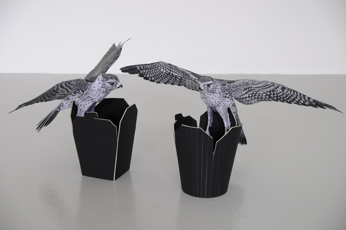The works of Preechaya Siripanich (*1973 in Saraburi, lives in Bremen) are foreign bodies in a familiar world. The Thai artist captures objects, materials, and pictures known to us in bizarre constellations, arranges them in new contexts. This is also true of his work Bettlerjagd (2008), which is already odd because of its title. A paper falcon, figure of the sun and the light, on a black container– on closer inspection it turns out that the bird is not sitting but hooked on the replica of a box for fried noodles, which one comes across at every Asian take-away. The creature meets a civilizing fragment, nature and city collide. The title and the 1-Euro coin embedded in the bottom of the box open up an additional reading: The wonders of civilization have a flip side, they are Janus-faced and thus ambiguous in their function. The familiar is transformed into something strange, which transports a deep sense of being uprooted.