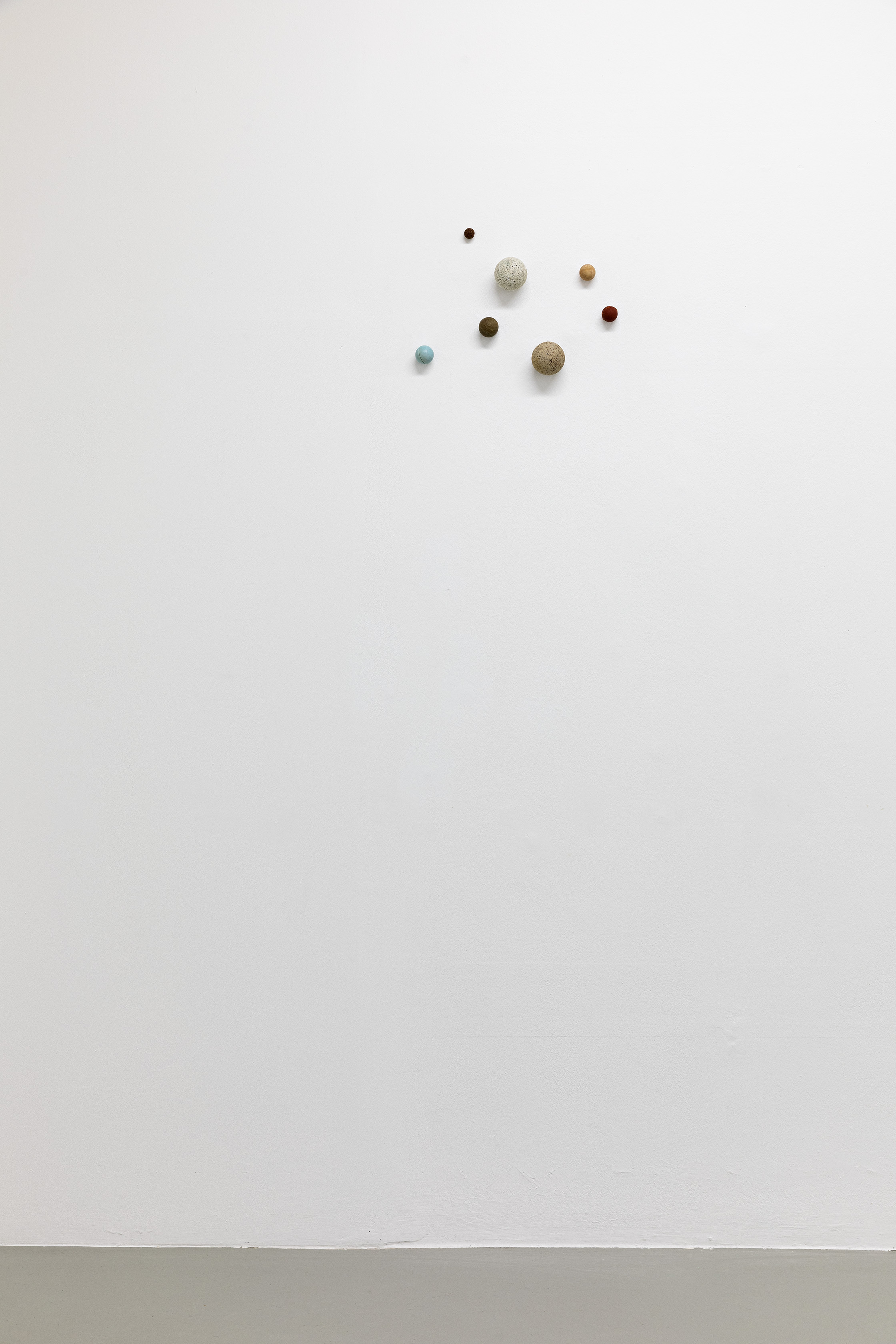 The Swedish artist Sofia Hultén (*1972 in Stockholm, lives in Berlin) shaved seven different ball types for her work Skinned Balls. The skins were removed down to the innermost layer and what remained was the core of the whole. Sofia Hultén sets out in search of the last indivisible particle that slumbers within each body and is different in each ball, as can be seen here. However, the installation on the wall opens up another level: The Skinned Balls form a kind of constellation and thus represent a cosmological finding beyond themselves. In this work, the artist also traces the overriding principles inherent in the objects. Relationship between human beings and objects, as well as the nature of objects and the durability of fabrics appear in a new light.