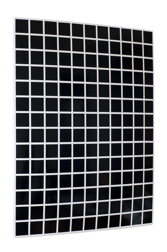 With her diverse approaches and questions Heike Bollig’s artistic practice is often interdisciplinary. In the work series Errors in Production, for example, she has been tracking down errors, collecting and exhibiting objects with manufacturing defects since 2004. Grid (Enamel) is also an industrially produced object, namely a slightly curved enamel plate with black squares on a white background. The sign bears the geometric pattern known as the Hermann-grid, which creates an optical illusion. The schematic clarity resulting from the reduction to simple, serially repeating basic geometric structures is reminiscent of the formal vocabulary of Minimalism. In further development of the work cycle Op Ad, in which the artist adapts the appearance of informal notices of requests and offers from public space and combines them with strictly graphic patterns, such as Grid (Enamel), where she also undermines the traditional function of the enamel sign as an advertising medium.