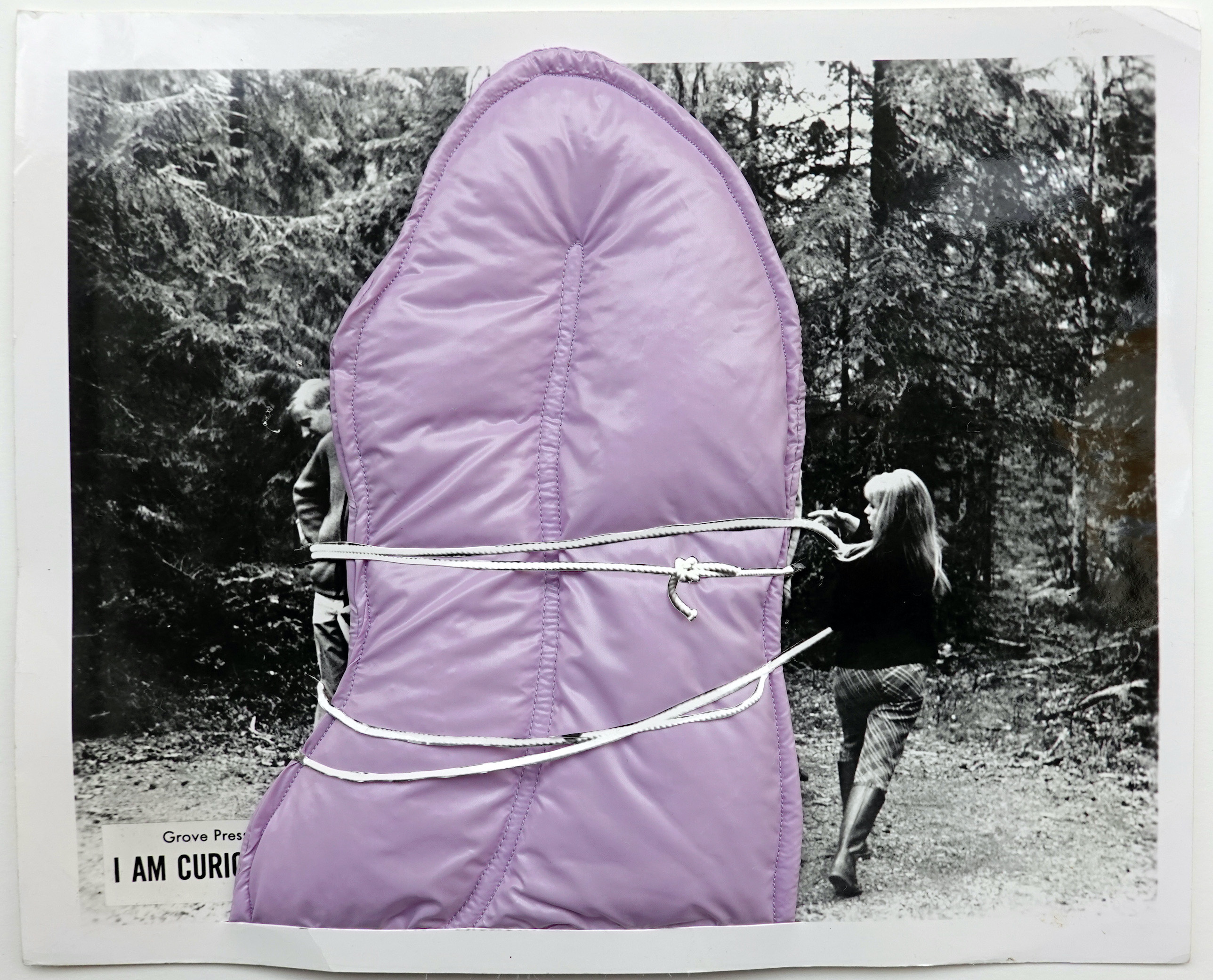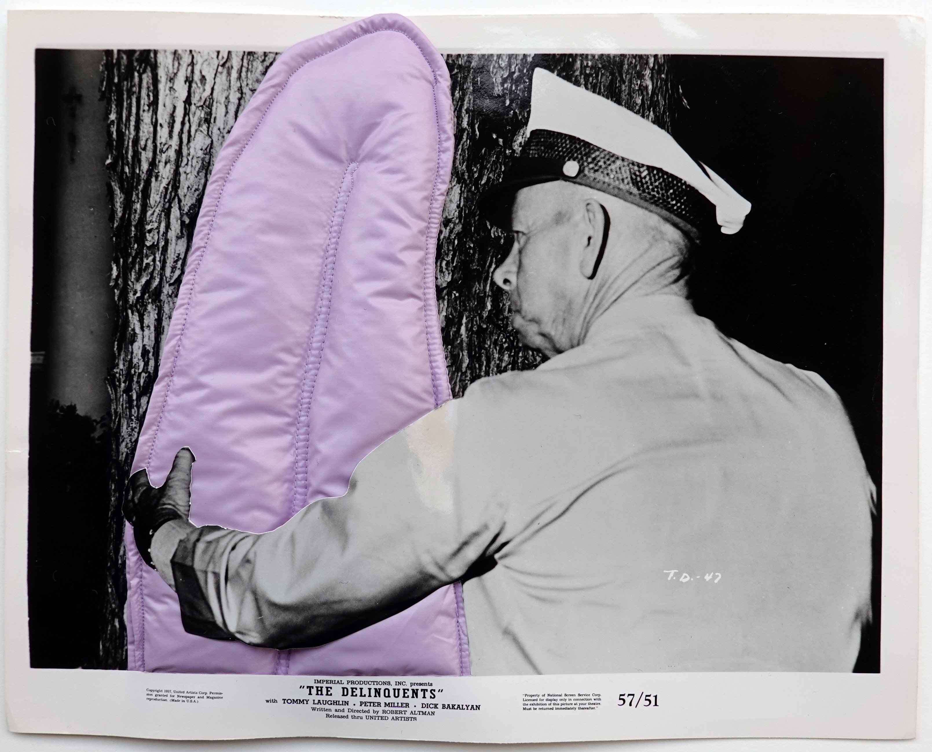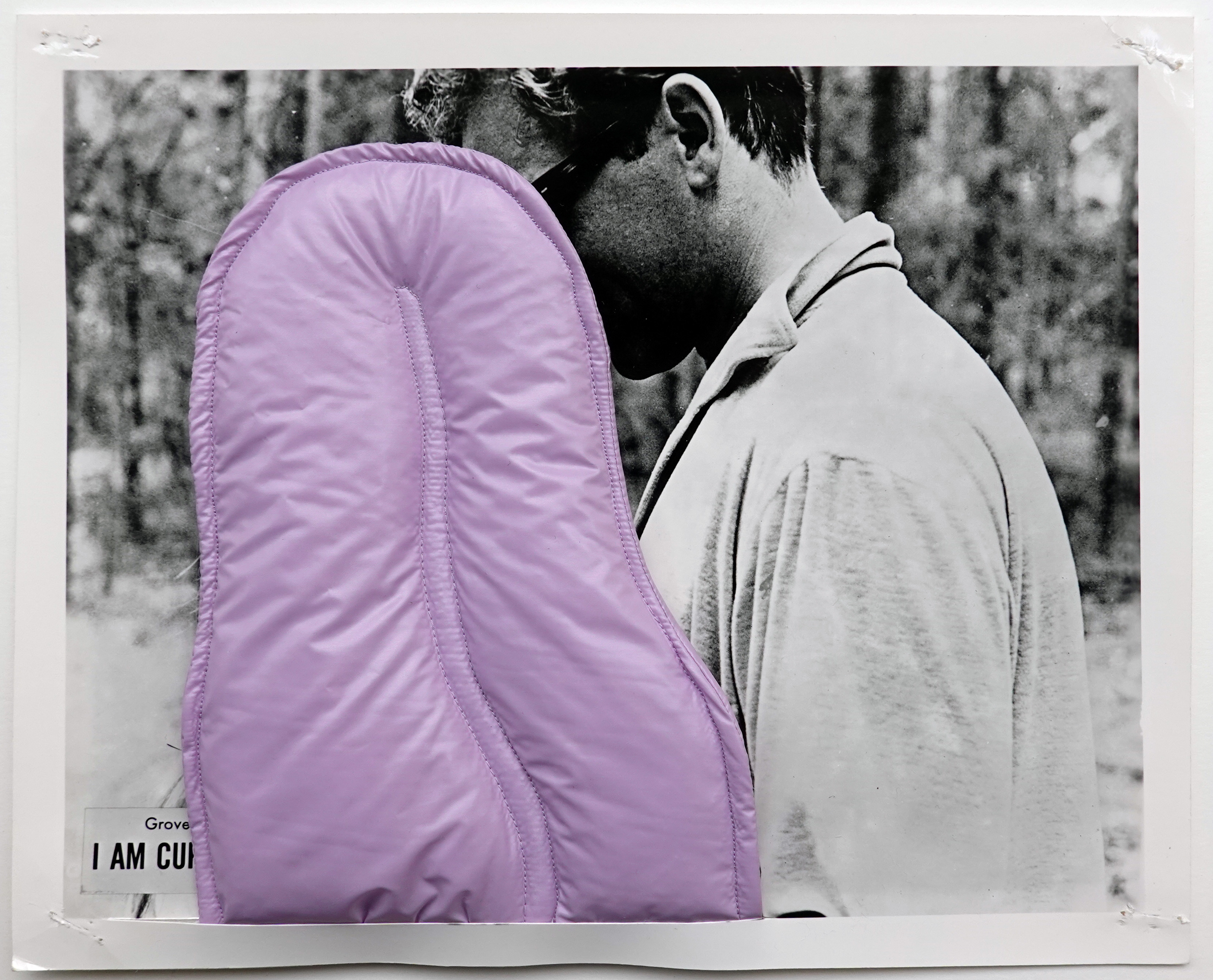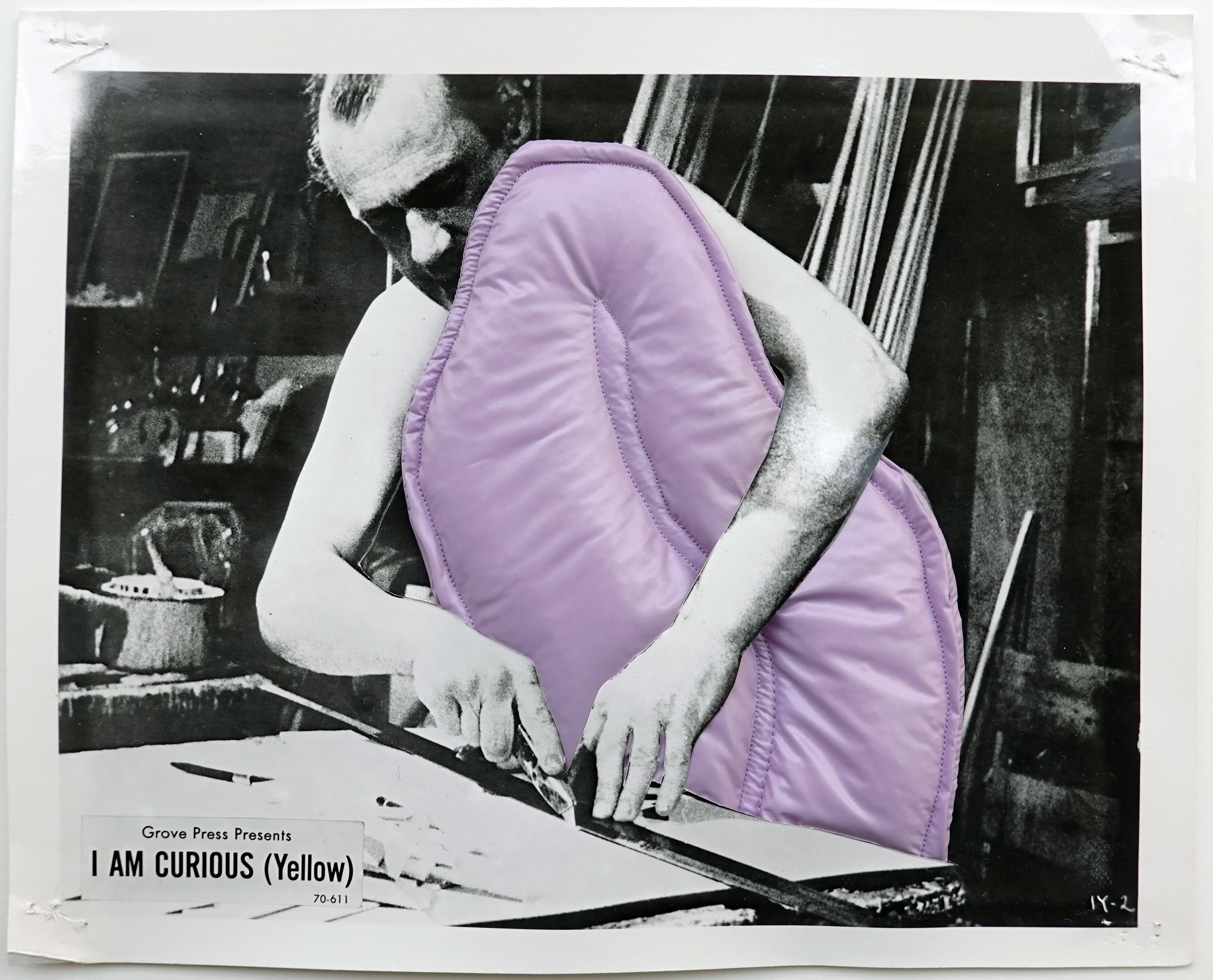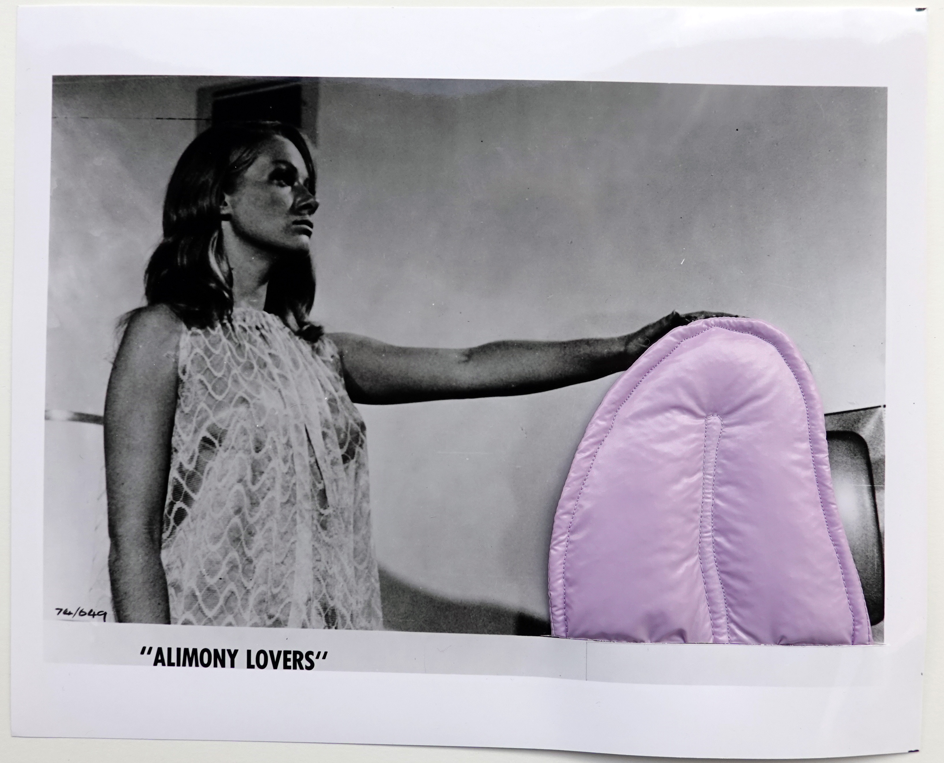 Lisa Herfeldt's editions are collages that consist of two elements: the black and white photographs are stills that were created and used for press kits of new cinema films. Residuals, such as staple pinholes, indicate that they were possibly also hung up as lobby cards. Herfeldt combines the stills with fabric objects. These are based on her textile sculptures, which otherwise intervene in three-dimensional space. In these collages, the tongues of fabric intrude the depicted film scene and thus manipulate the depicted action.