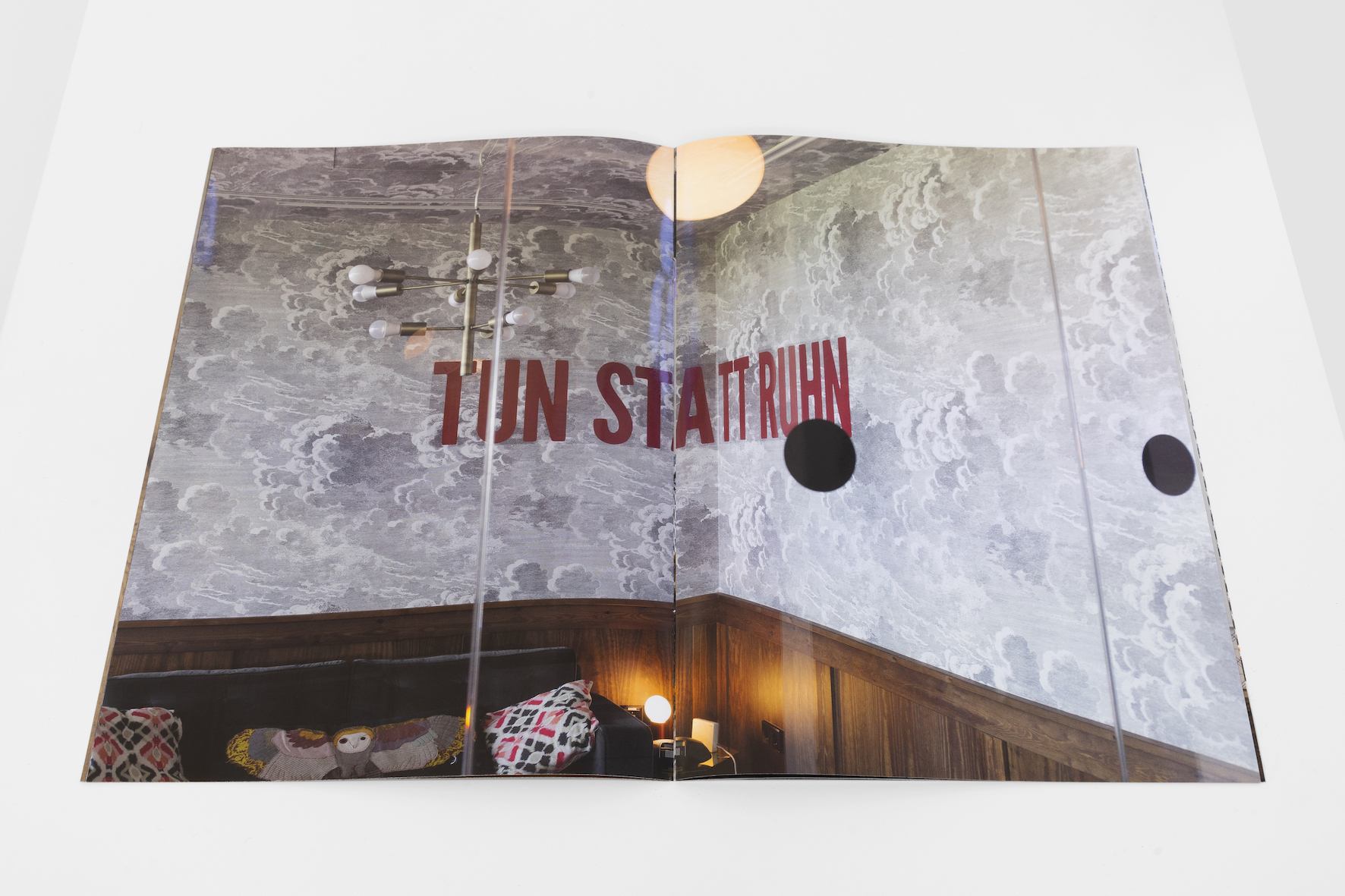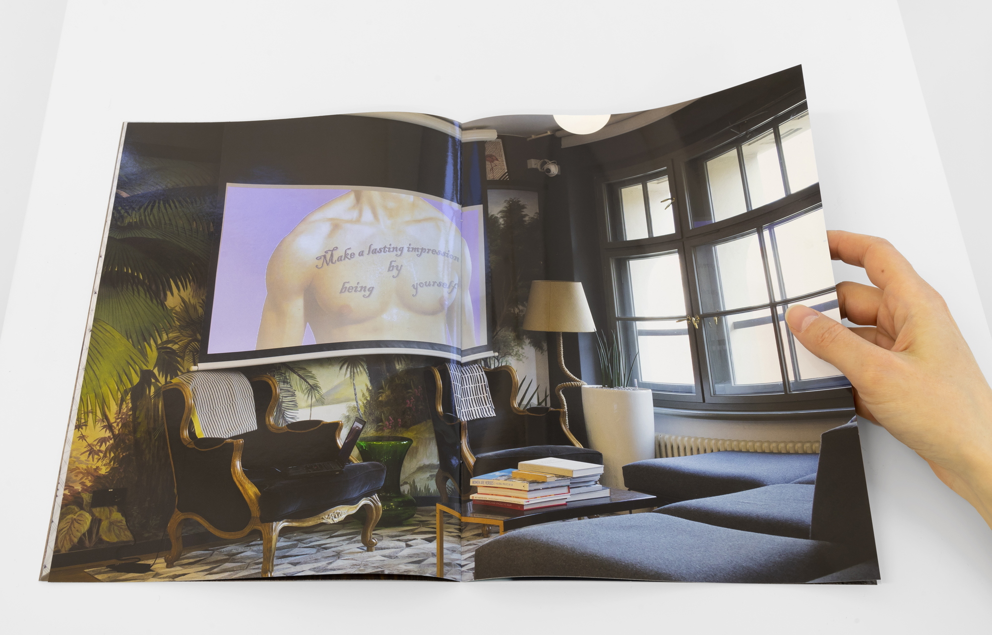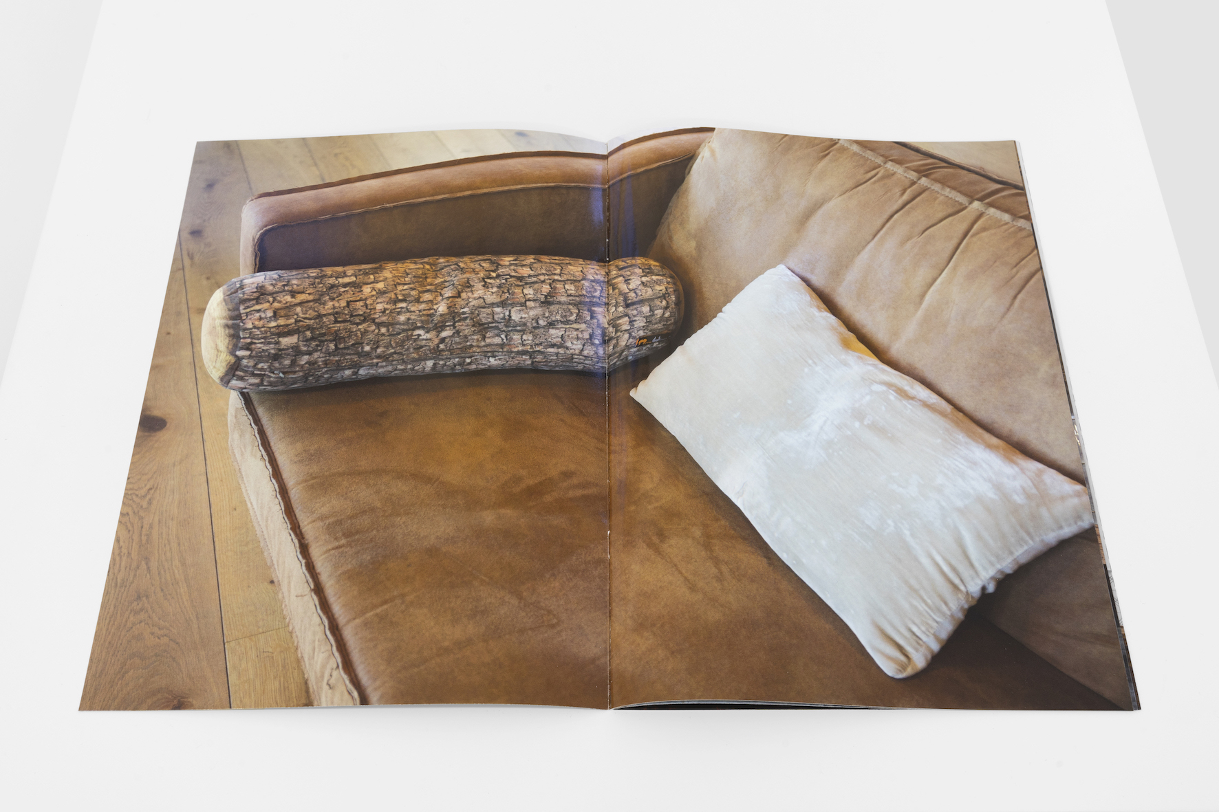 The magazine shows photographs of coworking spaces: still lifes of interiors that imitate familiar living environments and natural materials. Affirmative sentences or hidden personal messages can be read on the walls. A similar brochure was shown in Alina Schmuch's exhibition The Inner Office. It was created during her research in a coworking space of a global provider that rents out flexible workspaces on a monthly basis for self-employed people or start-up companies. The format refers to forms of corporate publishing.