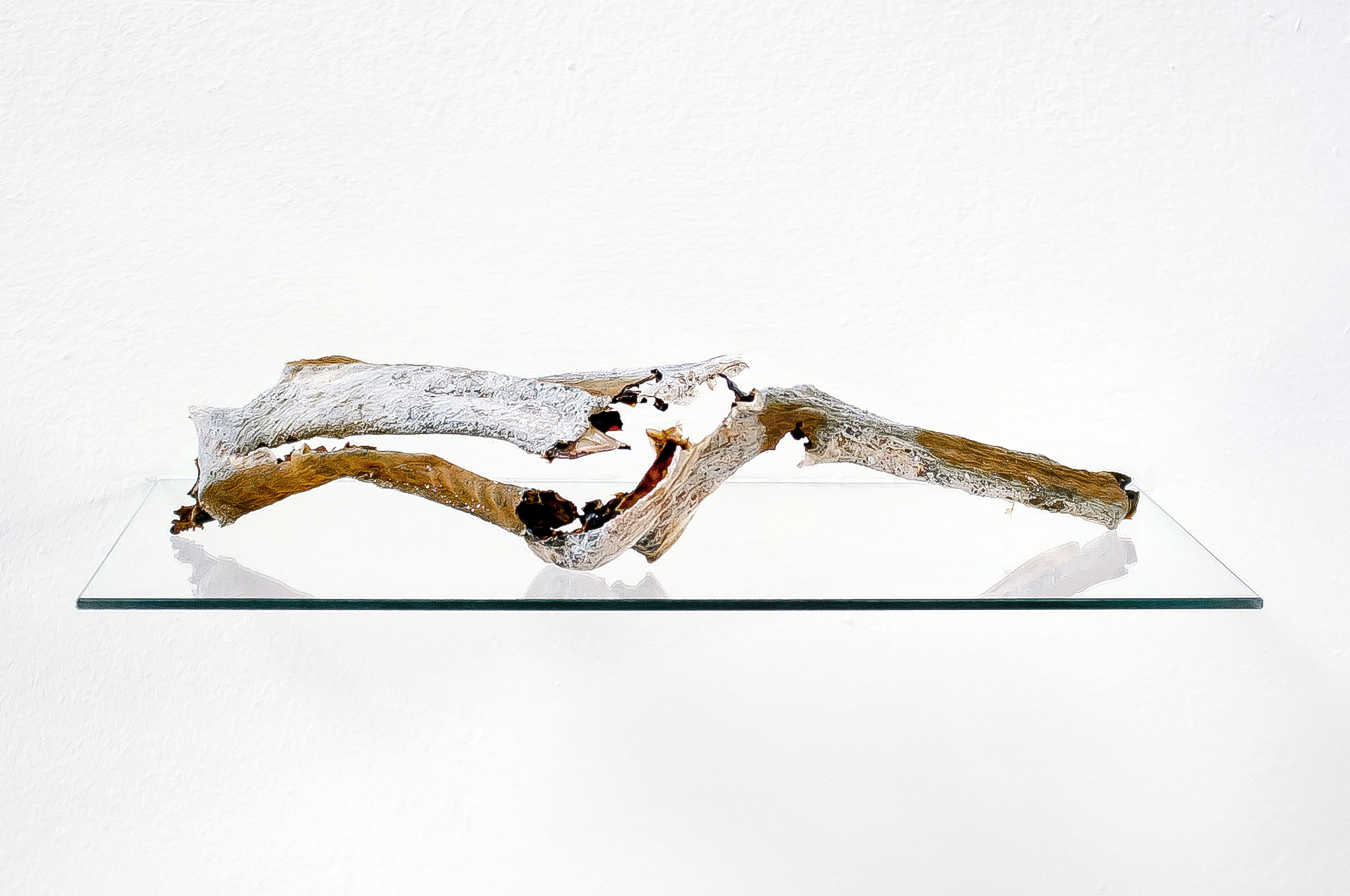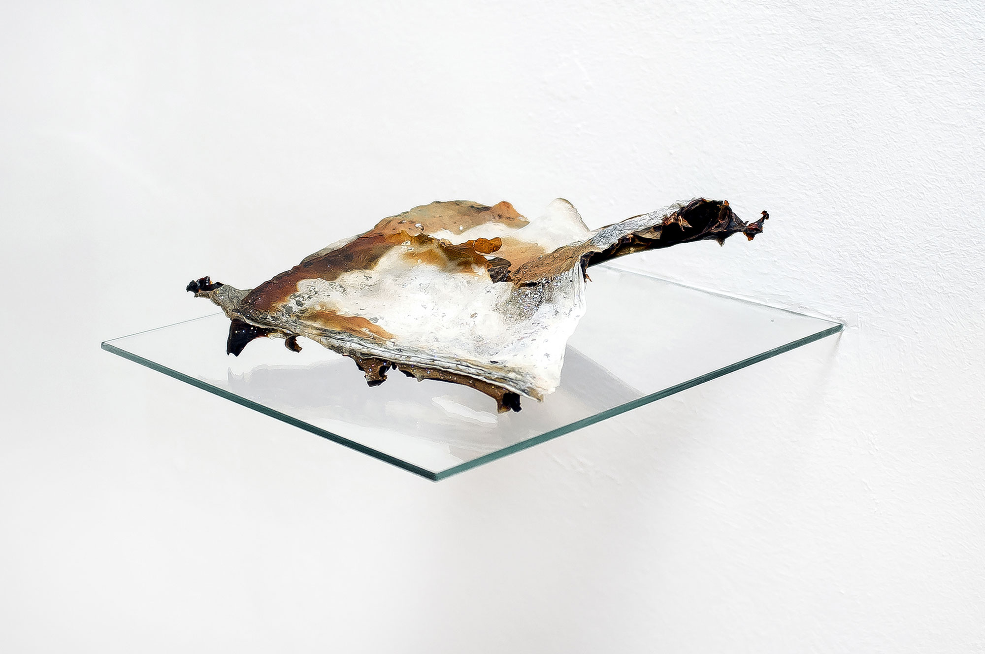 The works GOA (1-3) by the Bremen artist Tim Reinecke originate from his installation Beyond Thrill, exhibited at the Künstlerhaus, in which he covered reinforcing baskets with a slimy mass of agar. The material dried, withered and, attracted by gravity, sank deeper and deeper into the structure of the reinforcements. The resulting alchemical-looking sculptures are fragile and jagged, with traces of glitter and characteristic reddish-brown rust marks from steel baskets.