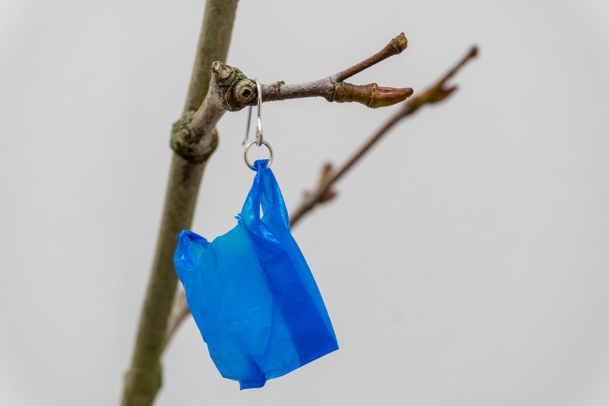 Earrings in cardboard box; silver, polyethylene and cardboard