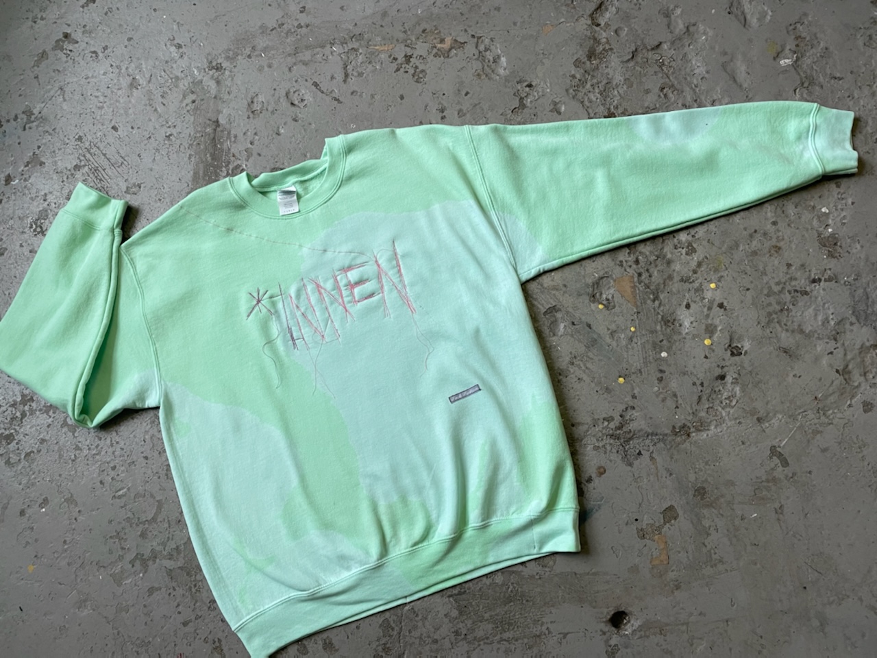 Franziska Nast collects, transforms, draws and writes - on sheets of paper, skin, walls, floors, on any ground – with pens, with needle, with light and with high-pressure cleaner. In 2023, Nast was part of the group exhibition *INNEN at Künstlerhaus Bremen. For her two editions *INNEN auf außen – a sweatshirt and a tattoo edition – she has taken up and transformed the gendered part of the word. She uses a needle to draw it on fabric and skin. For her own fashion label Fack Fushion, which has specialized in upcycling used clothing for many years, the artist has dyed or decolored four sweaters, creating galaxy-like patterns on which she has embroidered the drawing.