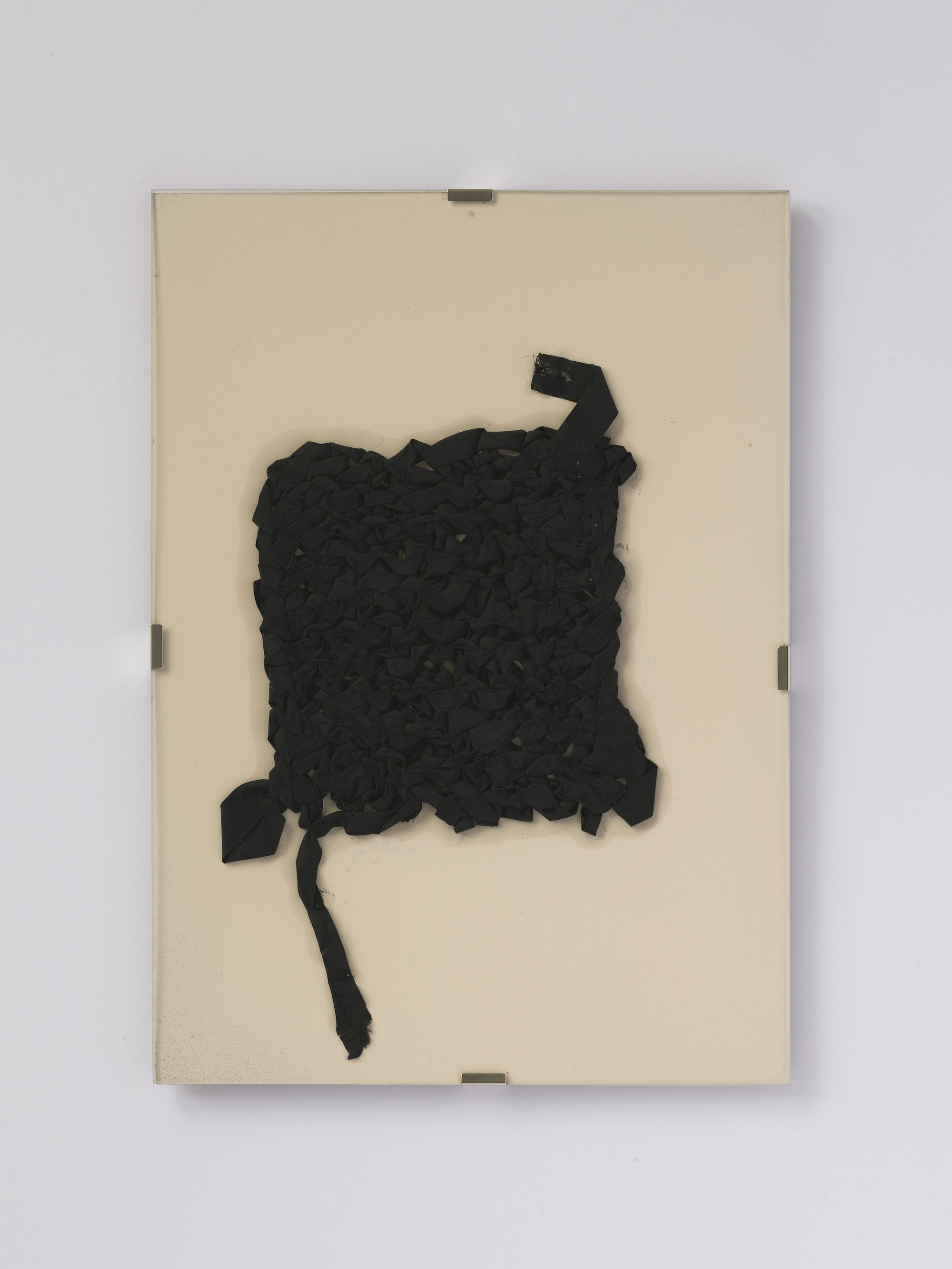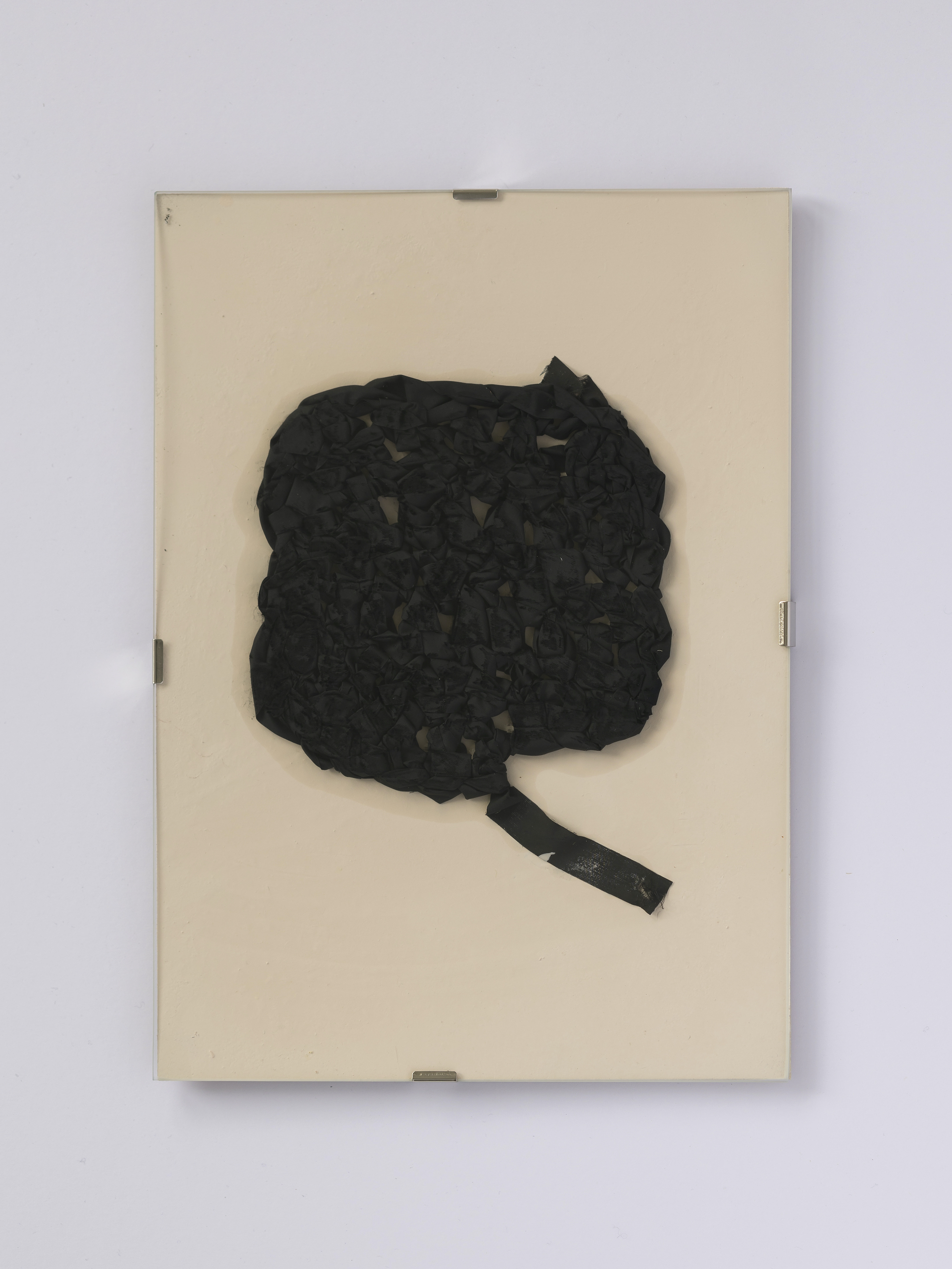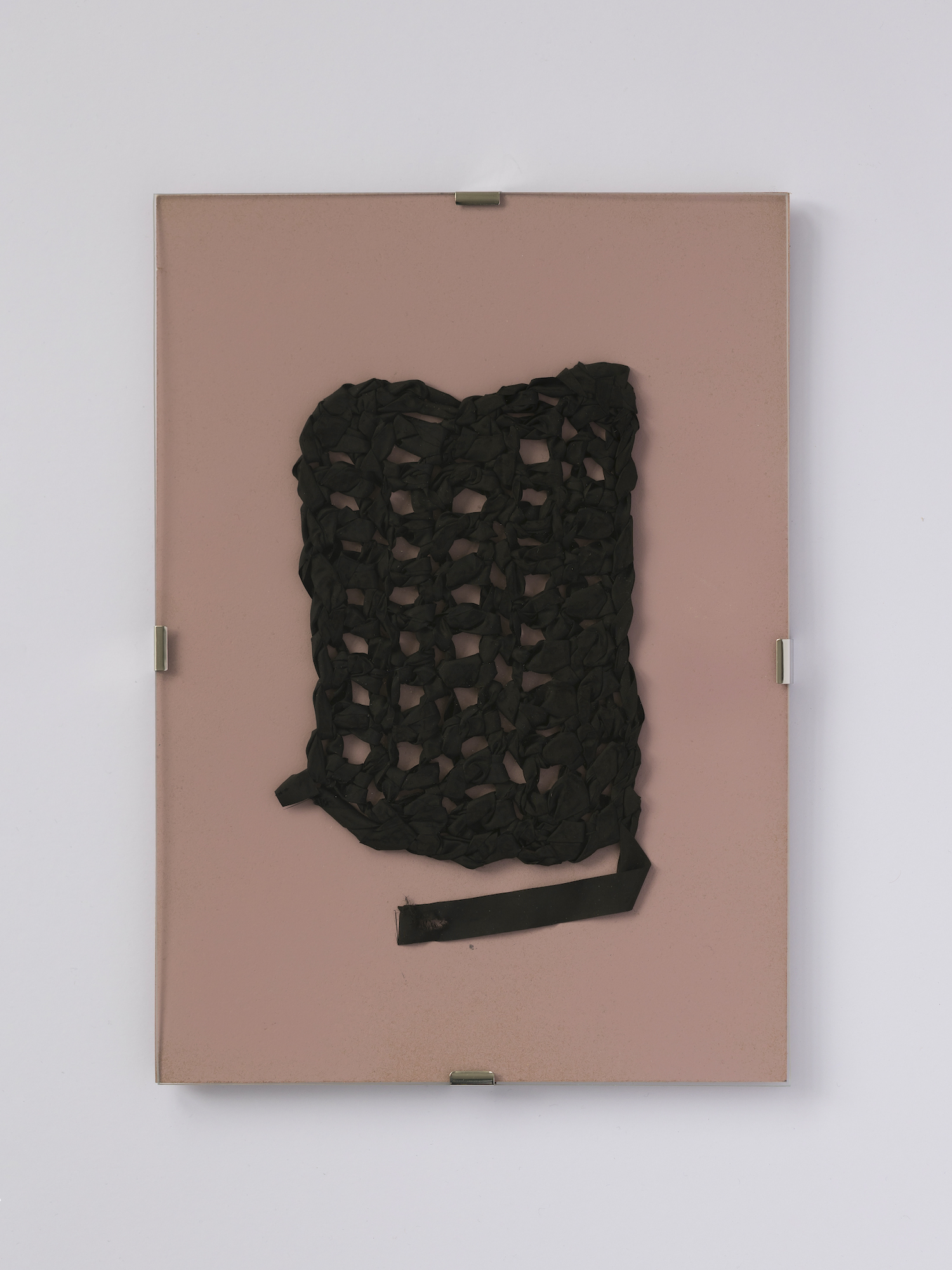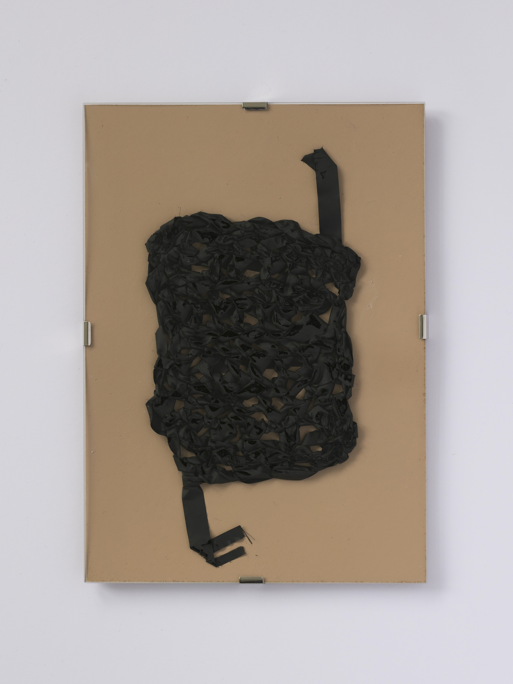 Each of the six unique works SM Olympia I-VI by Rebekka Kronsteiner consists of a knitted or crocheted typewriter ribbon, created using a different stitching technique. She previously used the ribbon to write the six texts from her work who cares (2023), which is part of her presentation at the gallery of Künstlerhaus Bremen. Knitting, sewing and weaving, just like typing as a secretarial task, are activities with feminine connotations – and to this day are often poorly paid. The artist has formed a surface from the ribbon by processing it by hand. Clamped between a colored sheet of paper as a picture carrier and a glass, the paint remaining on the tape leaves traces, runs down and paints shadows. Kronsteiner is interested in the typewriter ribbon as a carrier of diverse expressive possibilities, but also in the random moments in the editing process of the ribbon and the impossibility of correction.
